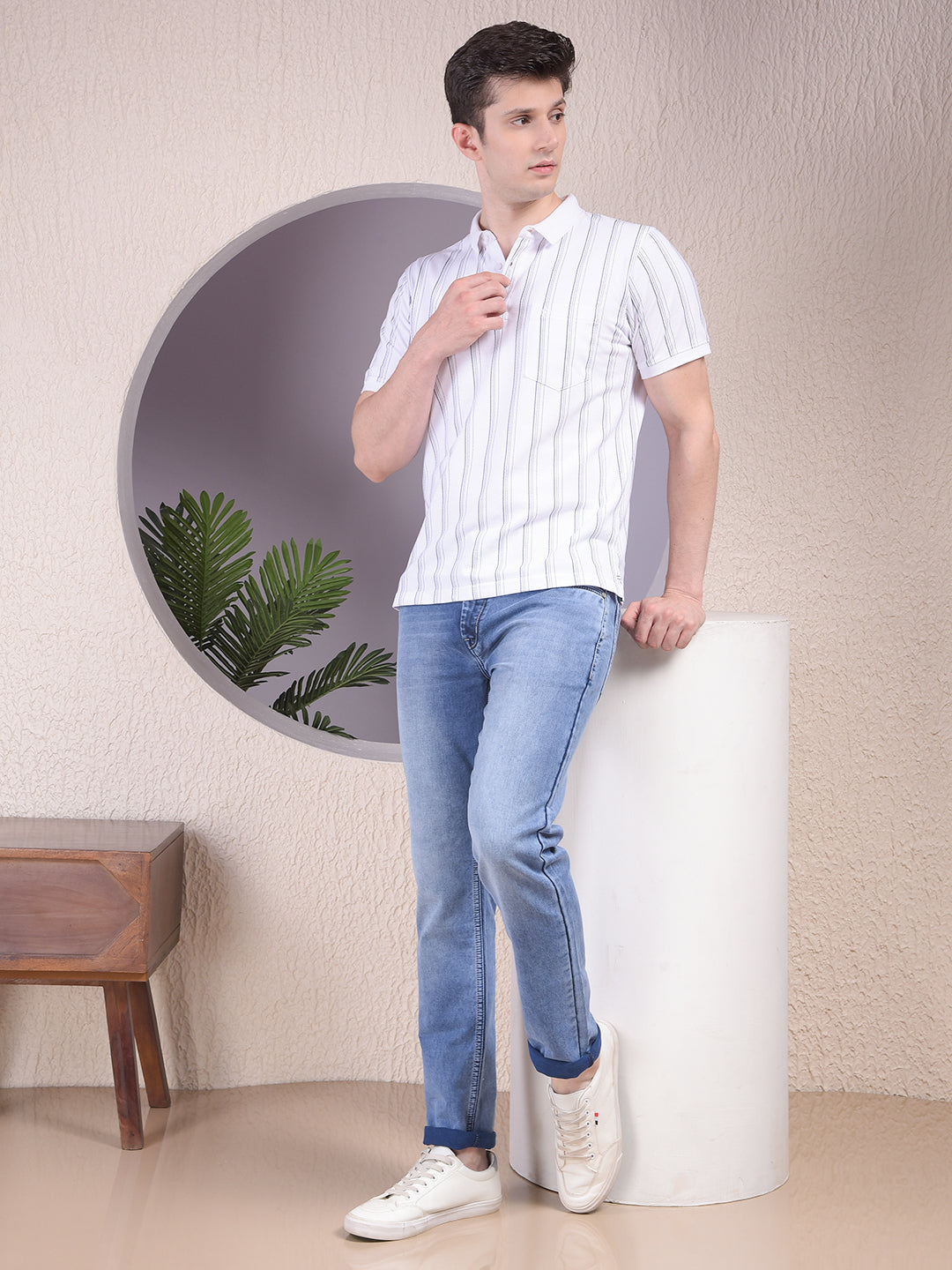 White Vertical Stripes Polo Neck T-Shirt