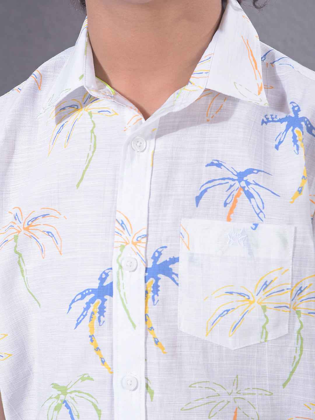 Refresh your child's look with this white floral print shirt. The clean white base and detailed botanical motifs offer a fresh aesthetic that is easily dressed up for various school events and parties.
