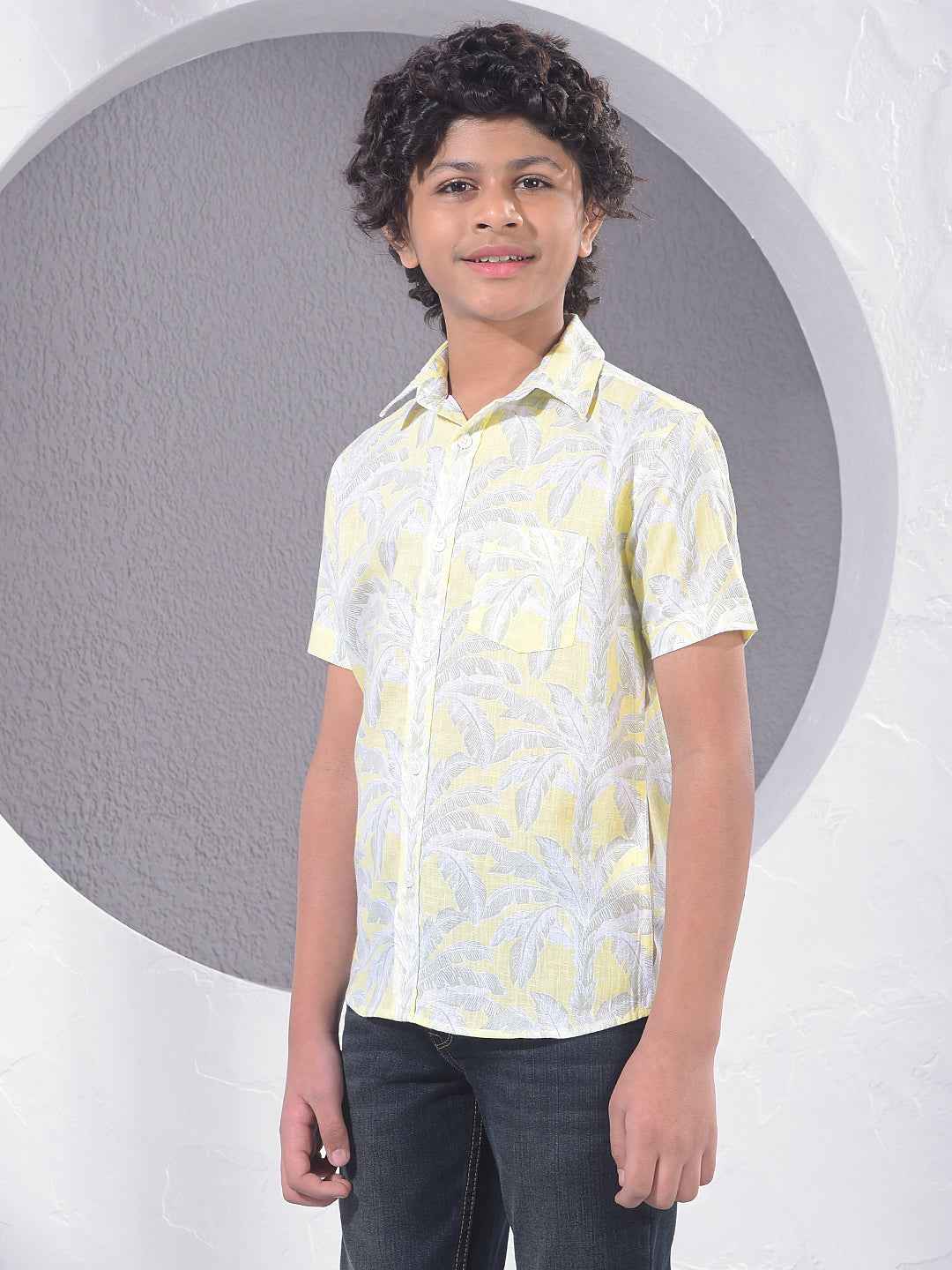 Brighten your child's holiday look with this yellow botanical print linen shirt. The cheerful color and modern design offer a vibrant aesthetic, ideal for summer vacations and daytime social gatherings with the family.