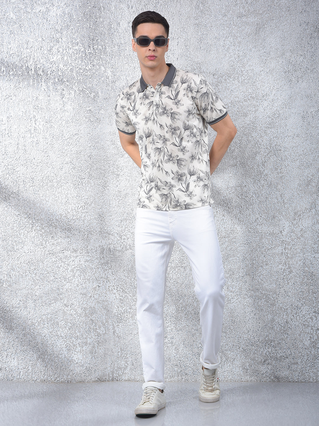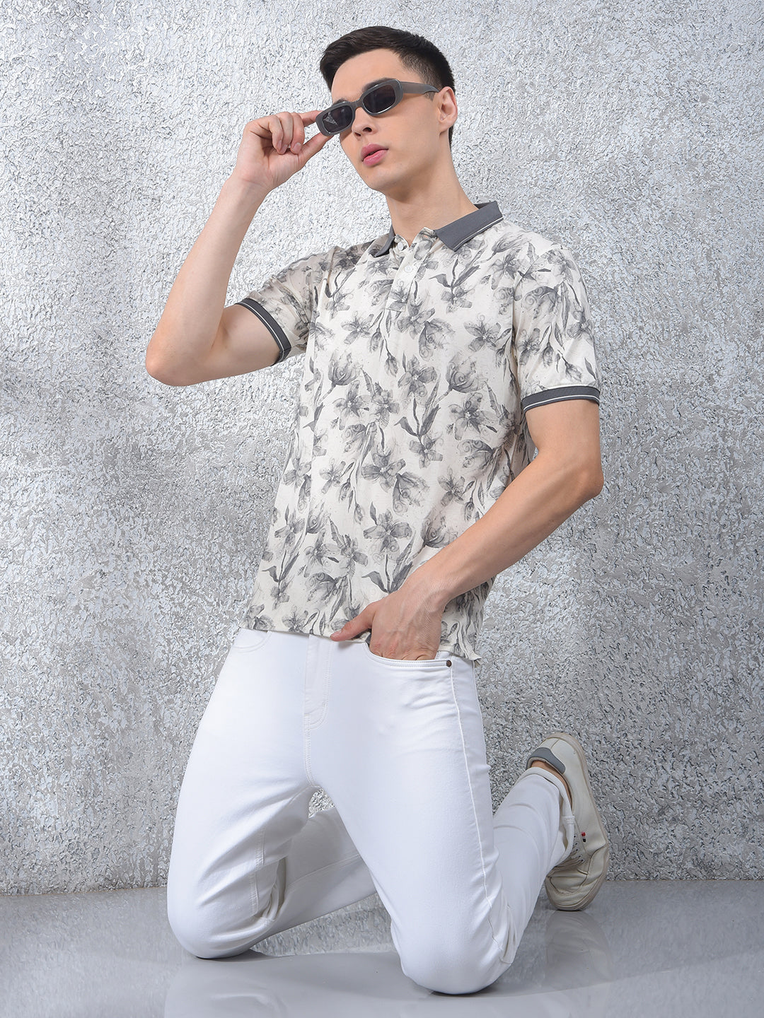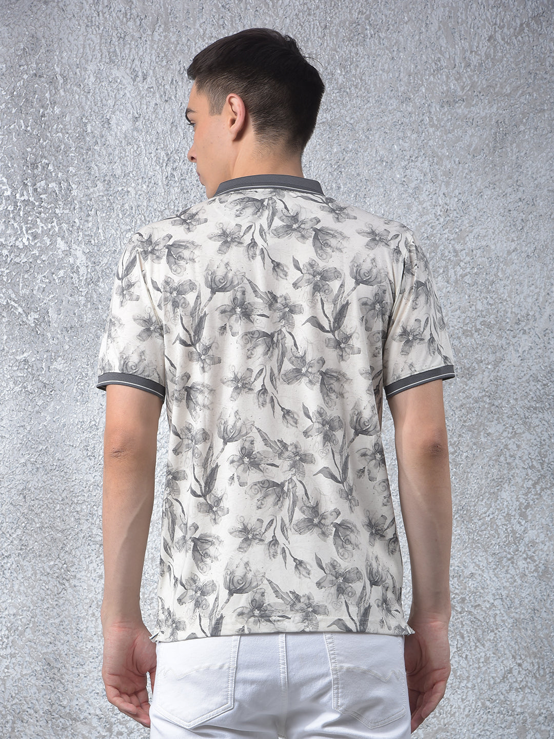 Crimsoune club men's grey floral print polo neck t-shirt : a subtle and classy grey polo neck with delicate floral designs that effortlessly elevates your casual wardrobe