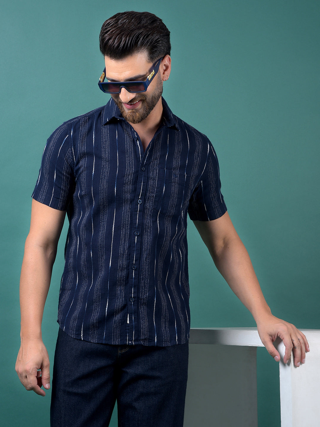 Navy Blue Vertical Stripes 100% Cotton Shirt-Men Shirts-Crimsoune Club
