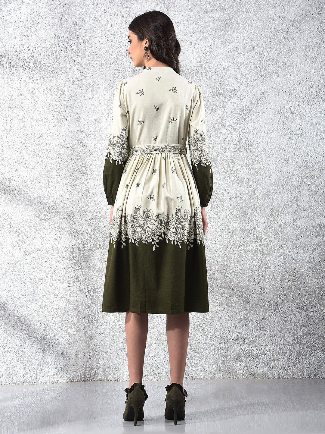 Olive Floral Print V-Neck A-Line Dress With Belt