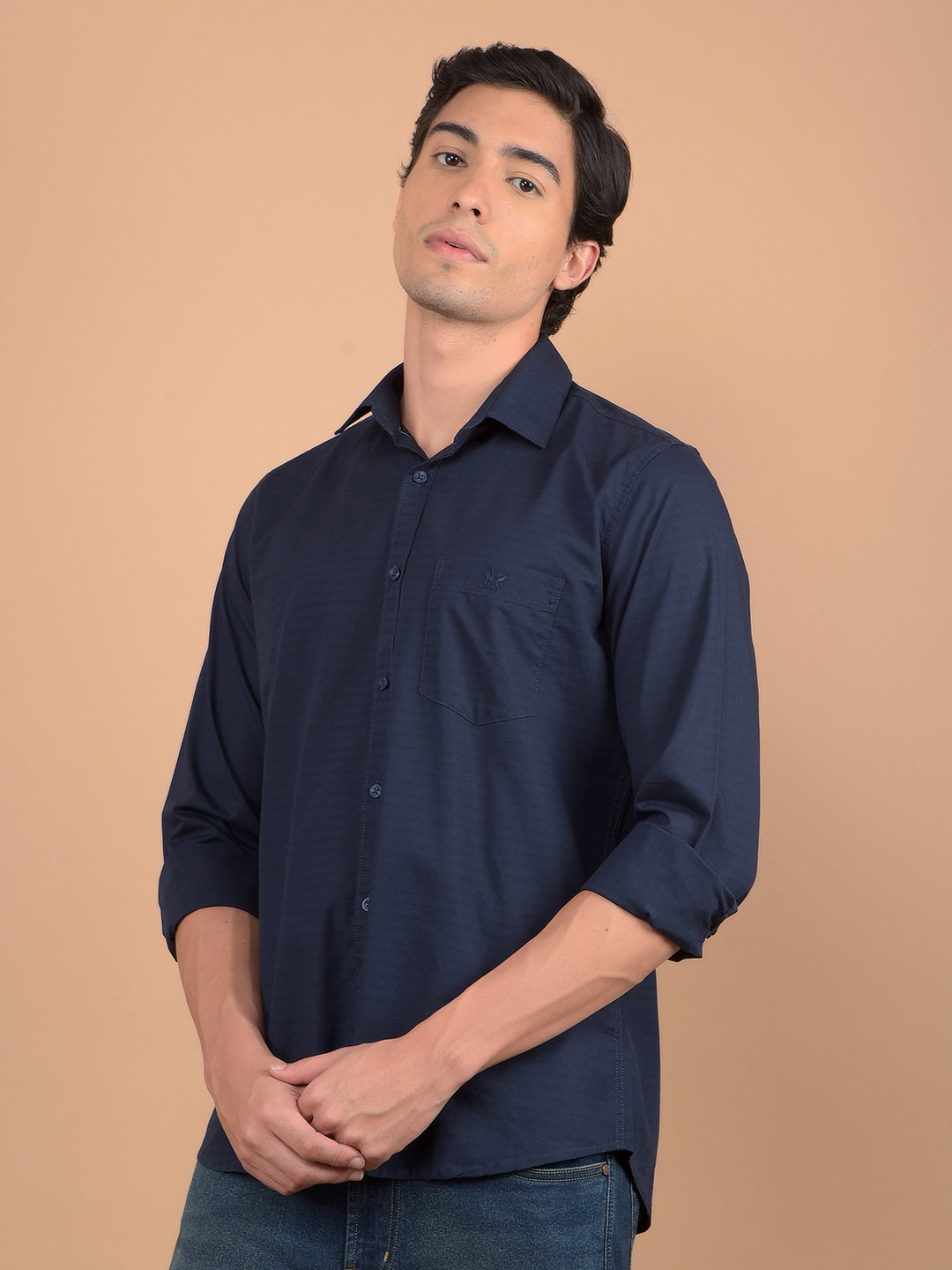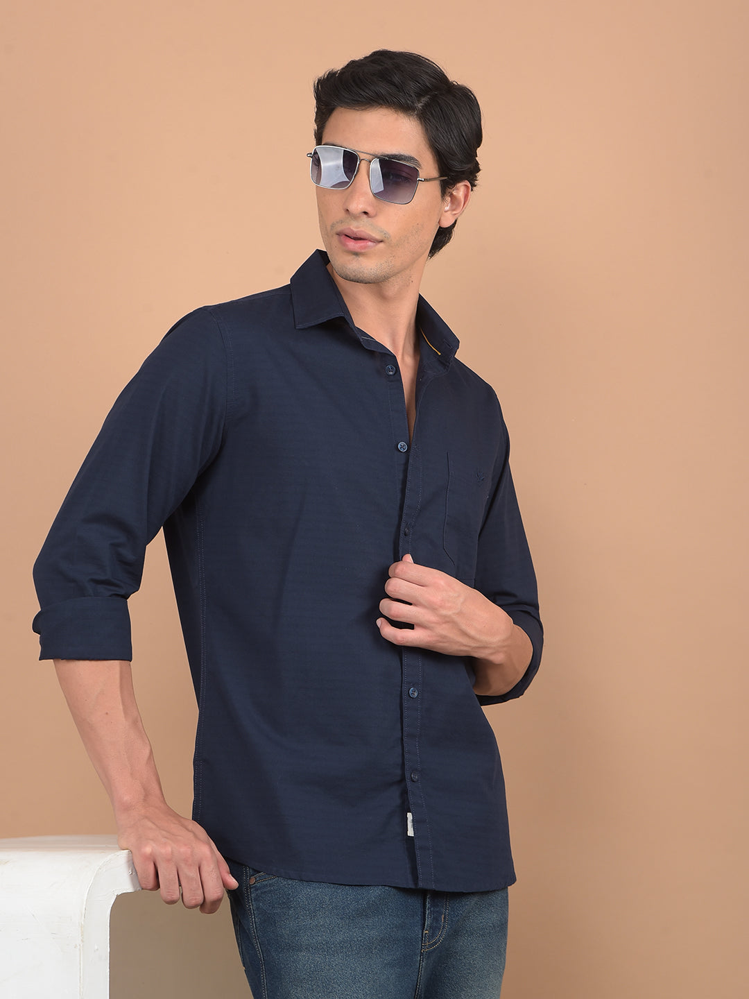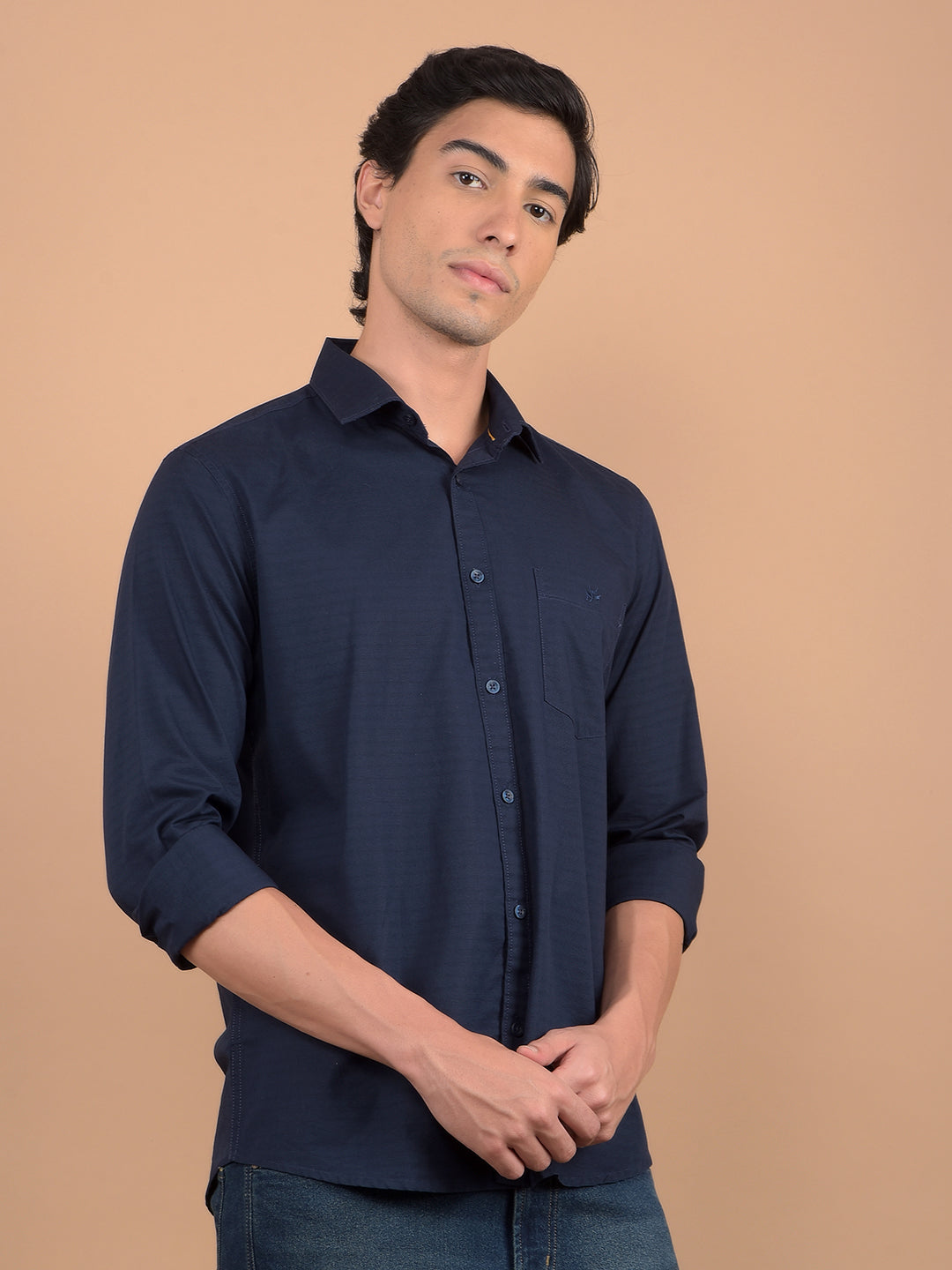 Crimsoune Club Men's Shirt In Navy Blue Color With Striped Pattern Combines Modern Style With Premium Comfort, Perfect For Both Casual And Semi-Formal Occasions.