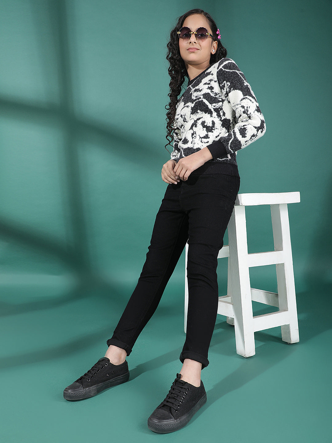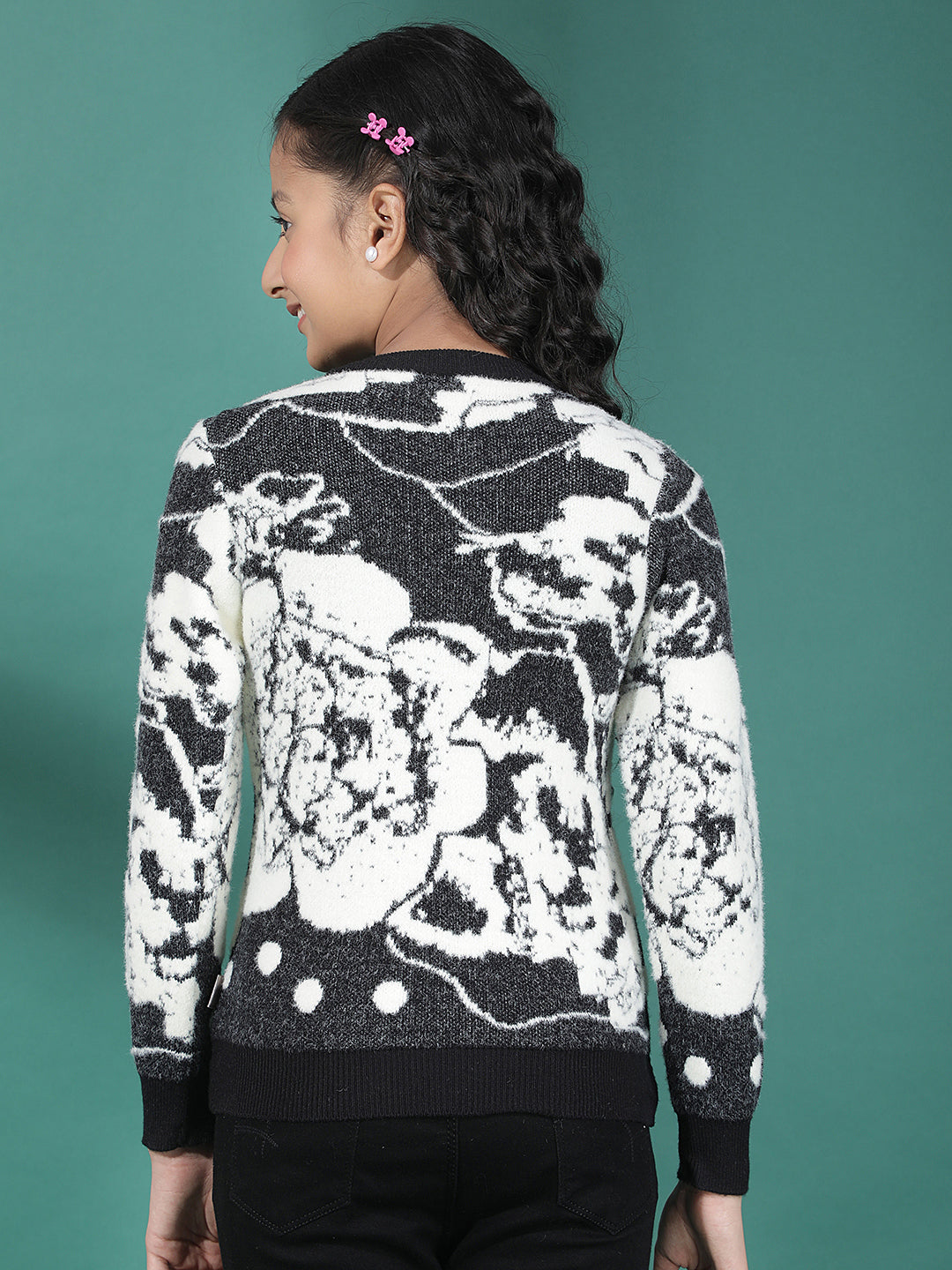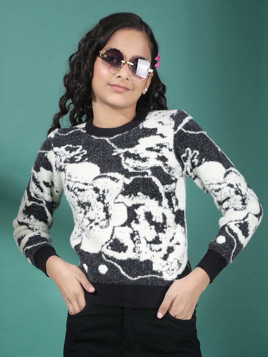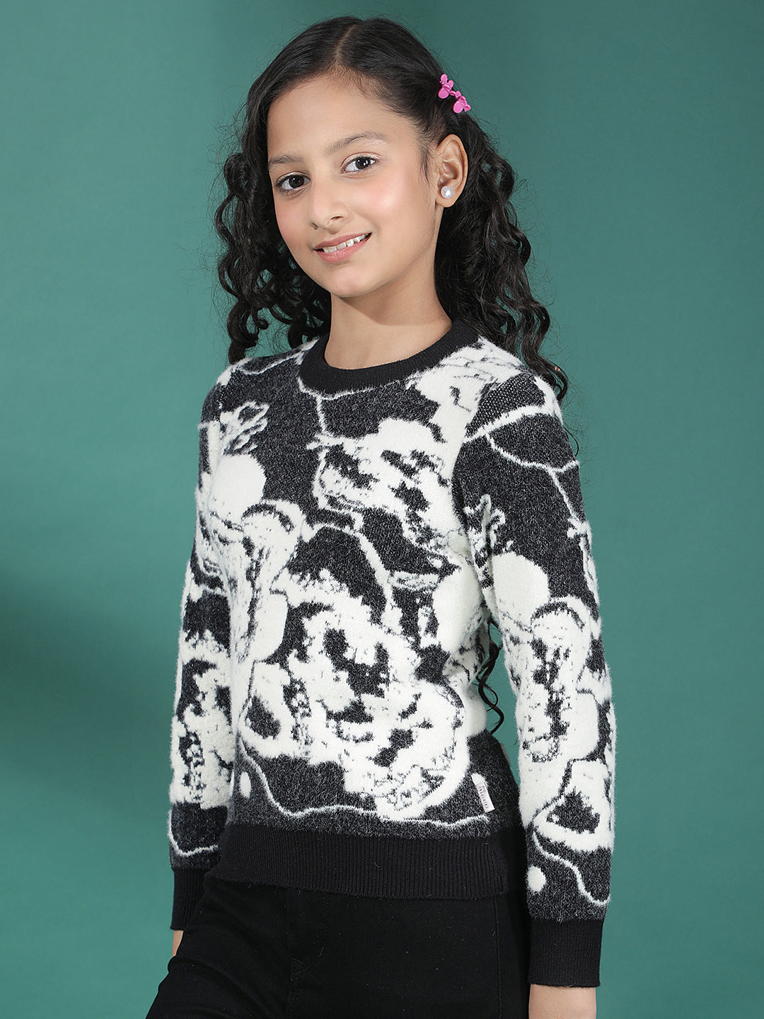 Crimsoune Club Girl's Black Abstract Print Sweater features a stylish abstract pattern with a soft knitted fabric. Designed for everyday comfort, it offers a cozy feel, ribbed hems, and a trendy look perfect for casual winter outings.