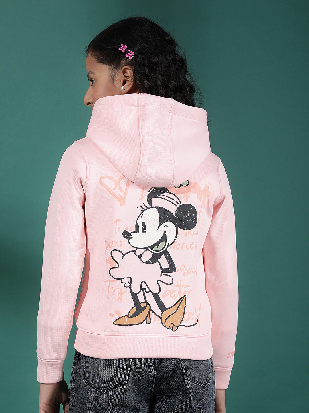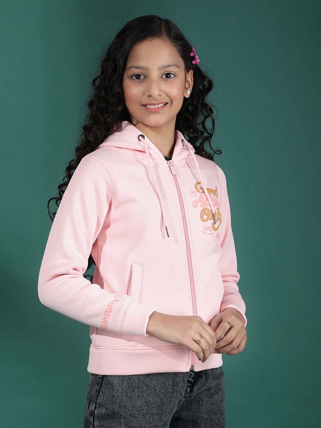 Crimsoune Club Girl's Pink Graphic Print Hooded Neck Sweatshirt showcases a trendy graphic design with a hooded neckline. Made from comfortable fabric, it delivers a relaxed fit ideal for casual and lounge wear.