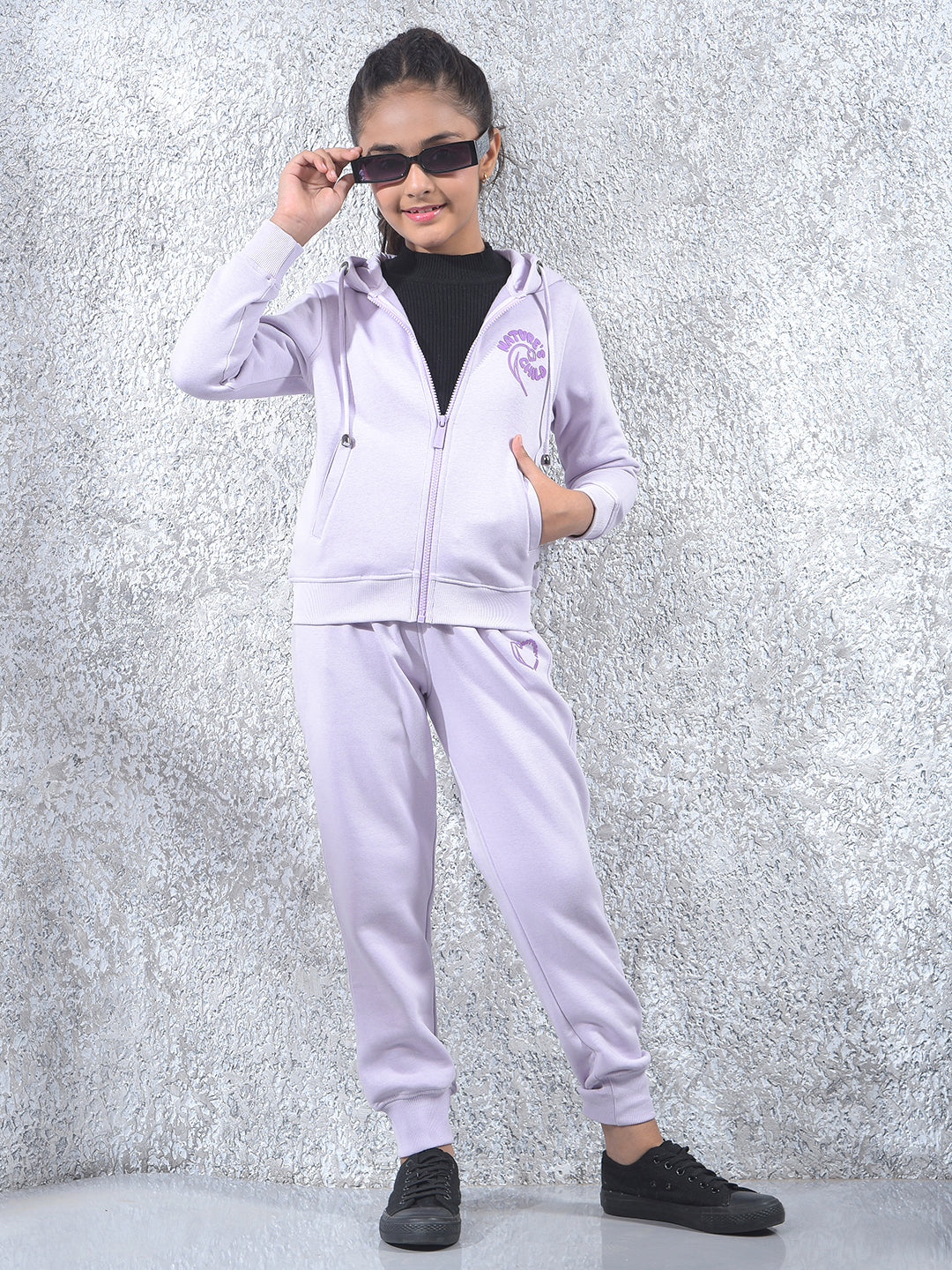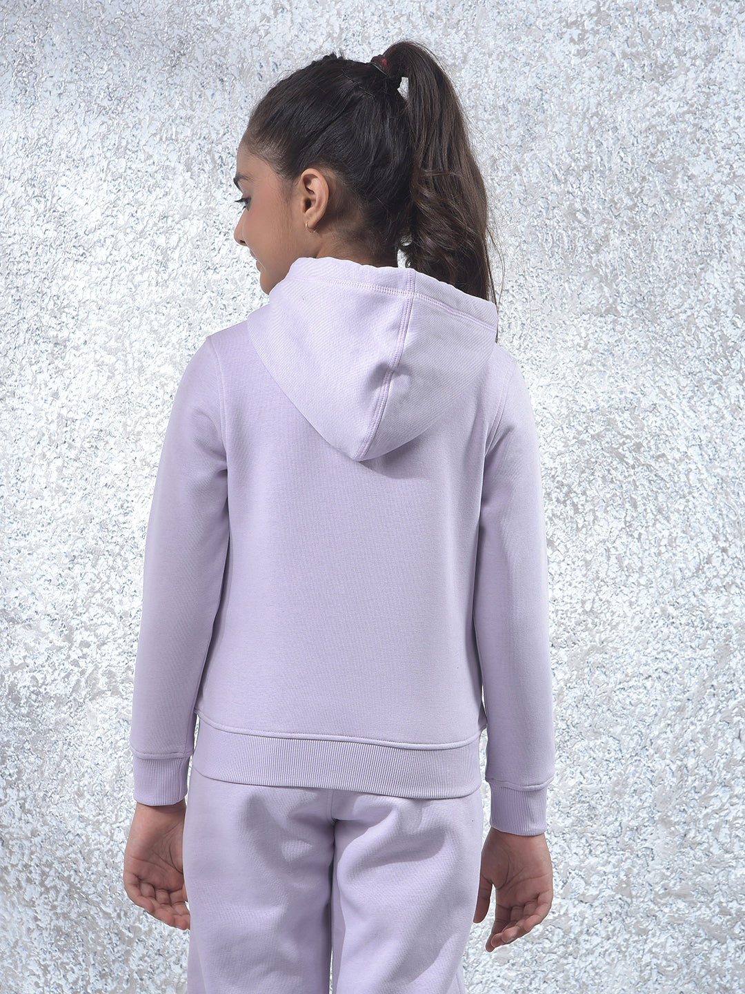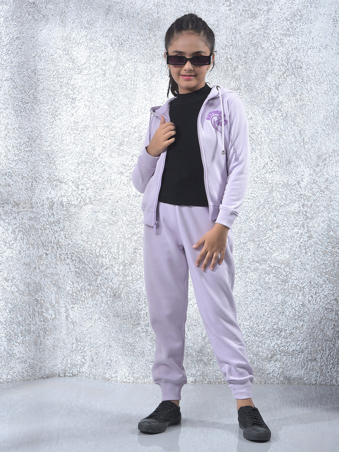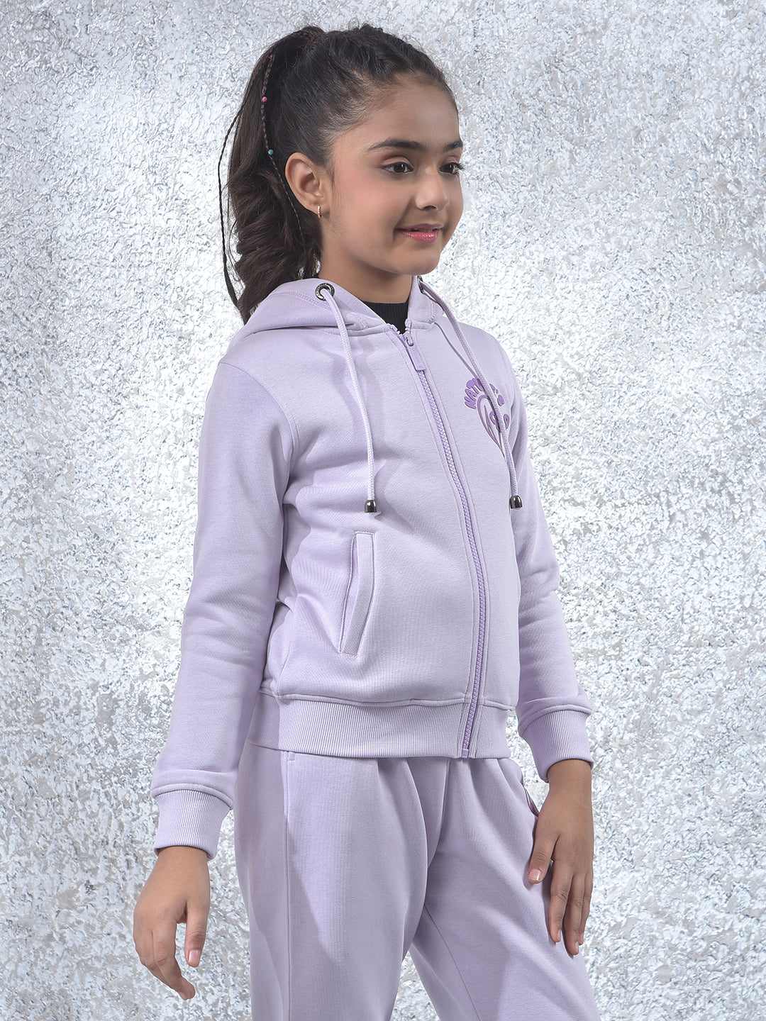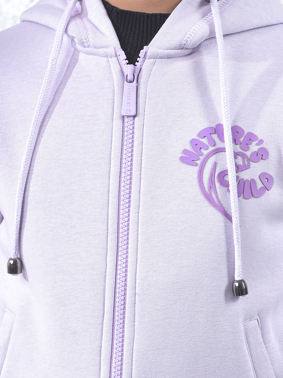 A purple hooded knitted sweatshirt, providing a soft texture and a cozy fit that adds a unique and vibrant touch to a casual outfit.