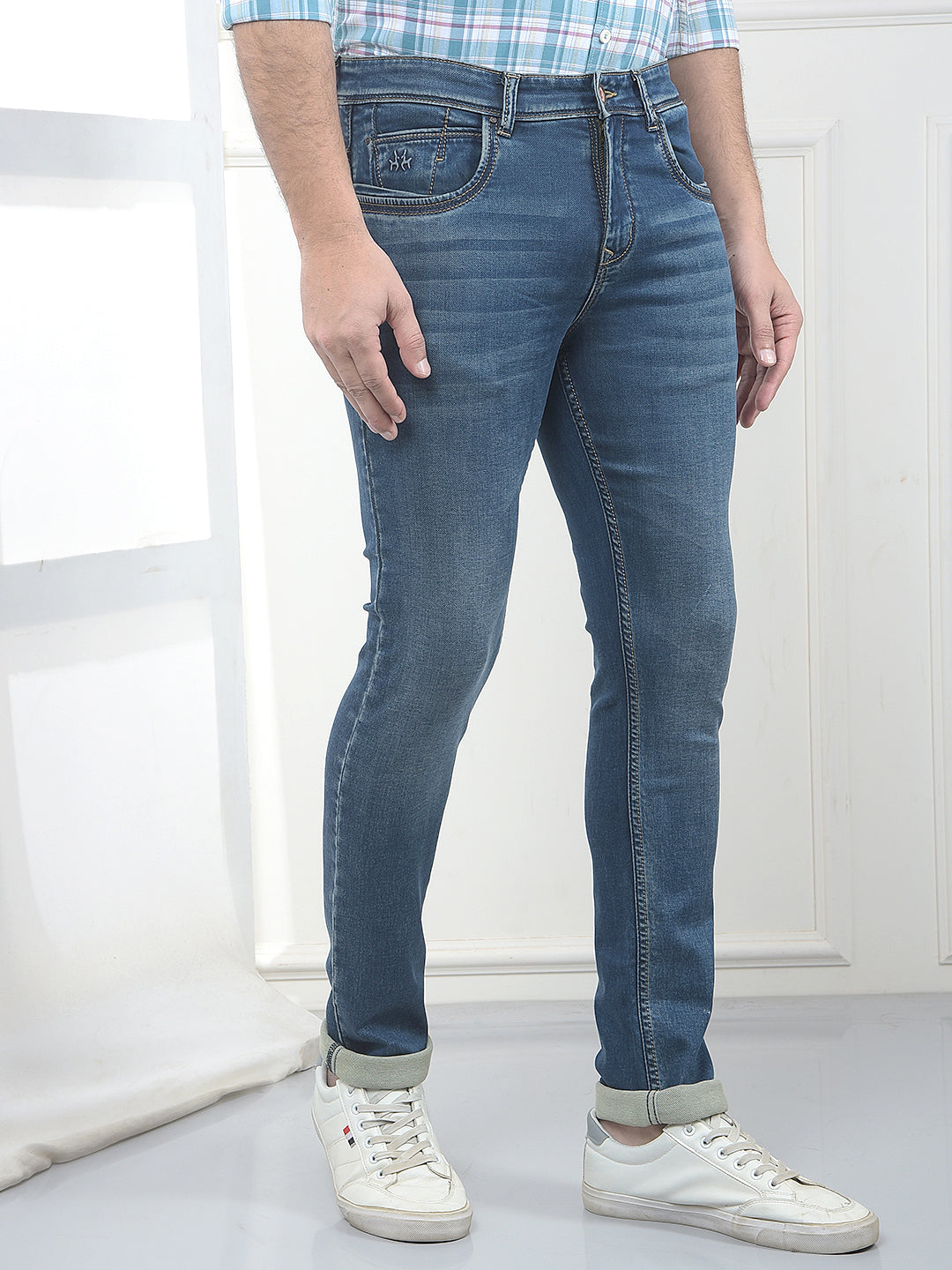 Versatile blue slim fit jeans from Crimsoune Club, designed for a modern, lean silhouette. Soft hand-feel fabric with enough structure, ideal for office Fridays, outings and daily wear with sneakers or casual loafers.