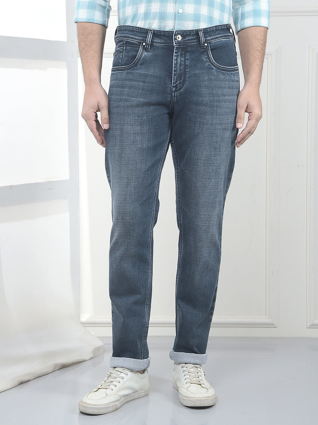 Stand out in Crimsoune Club green slim fit jeans, designed for men who like colour with control. The muted green solid tone adds interest without being loud, working well with neutrals and earthy printed shirts.