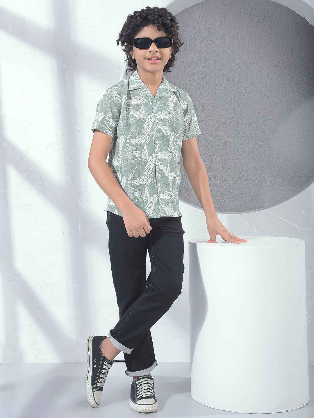 This Crimsoune Club boy's green floral print resort-collar shirt features a fresh botanical design. The airy fabric and stylish silhouette provide a sophisticated, summer-ready look that is perfect for family outings today.