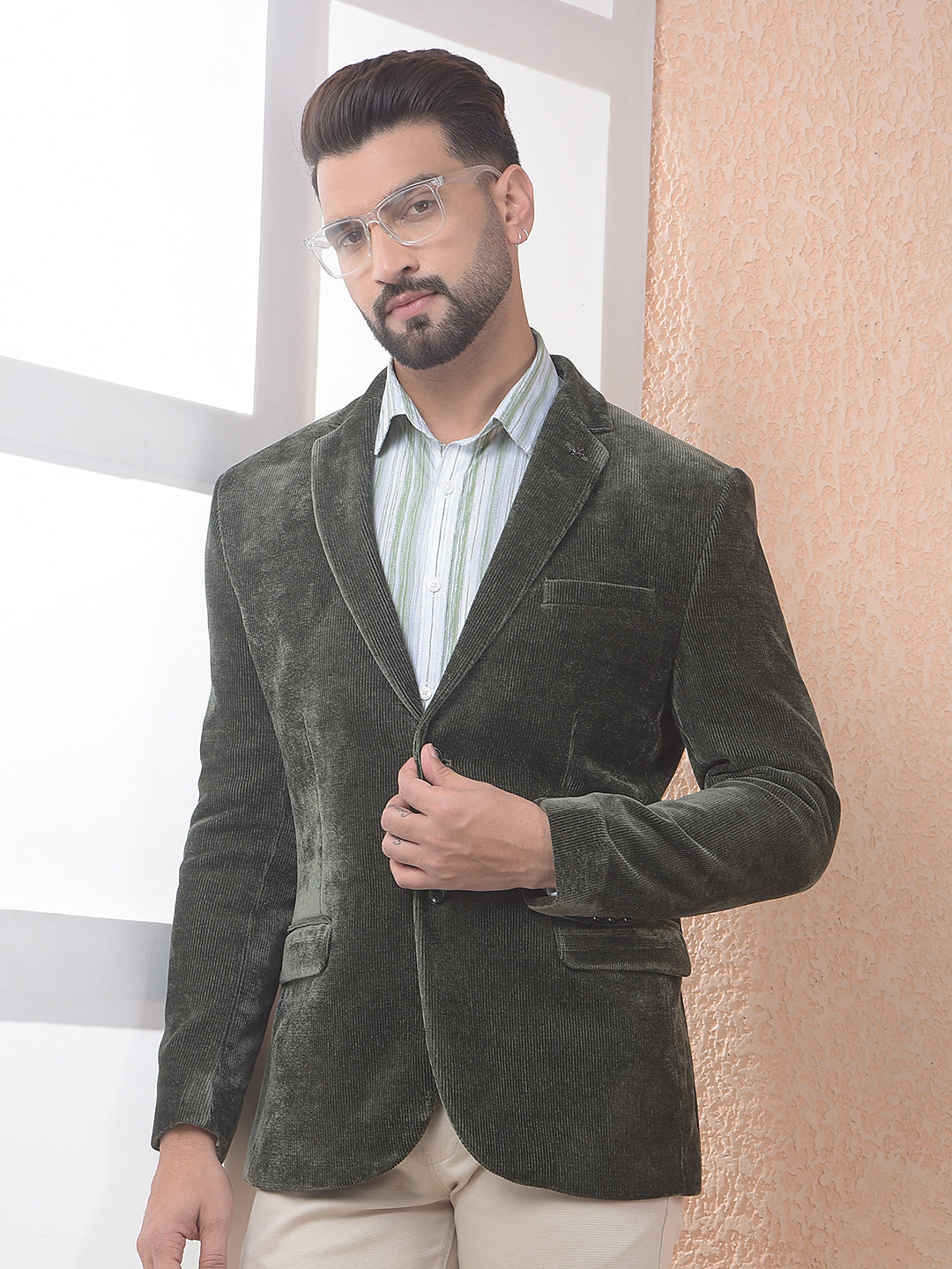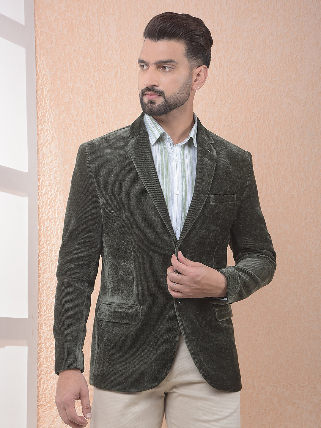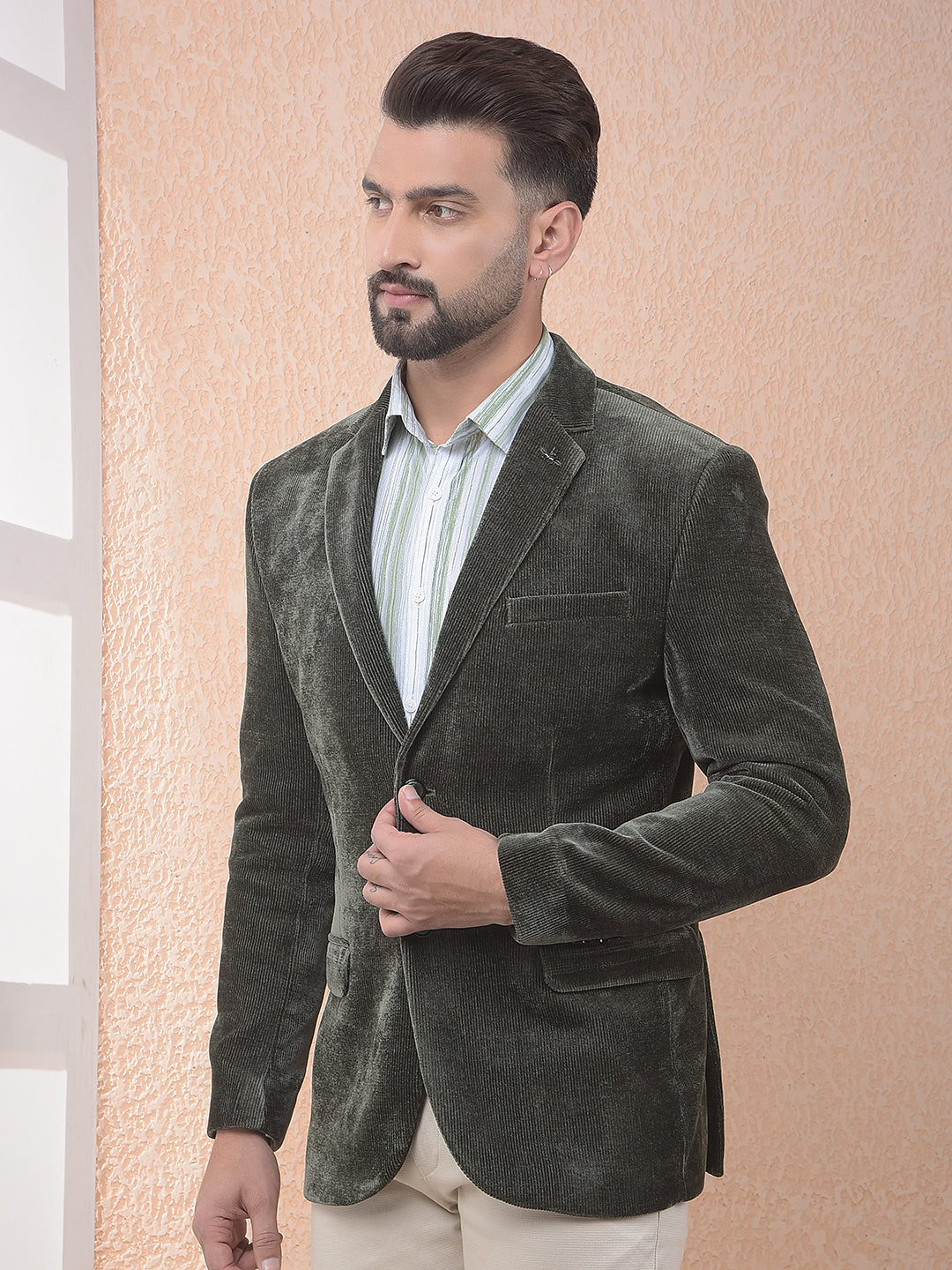This Crimsoune Club green corduroy blazer offers a unique texture and a classic notched lapel. The durable corduroy fabric and deep green hue provide a stylish, heritage-inspired look for the colder autumn months.