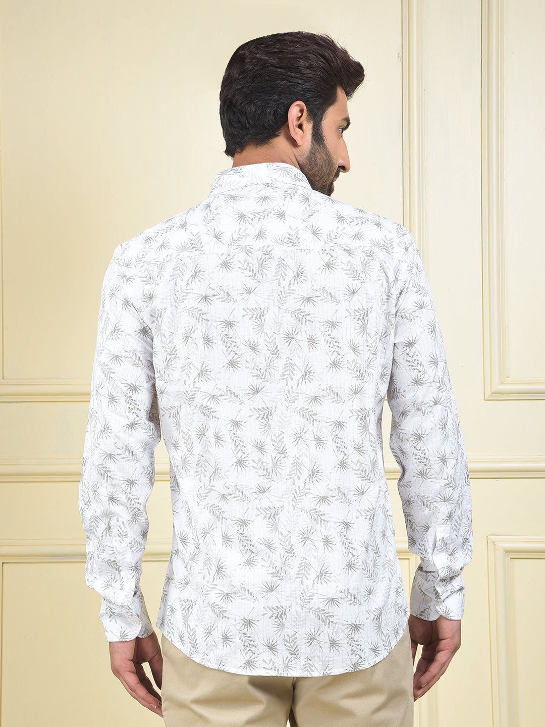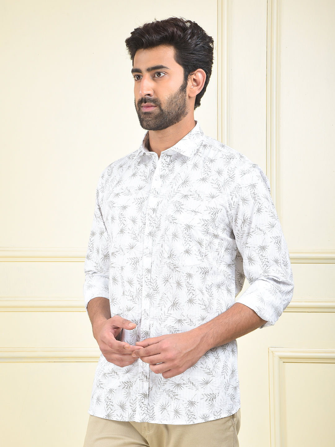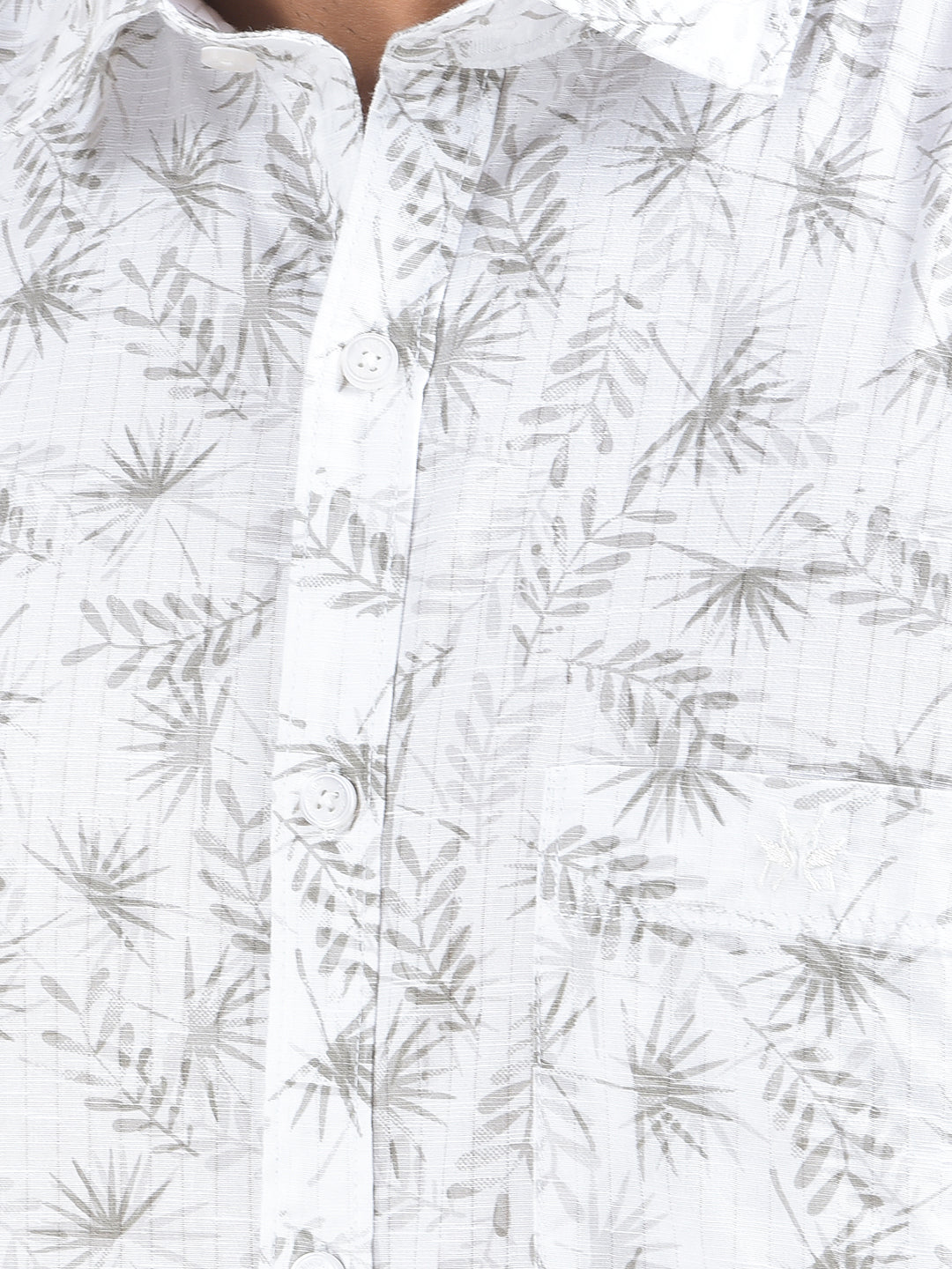 A white floral print shirt, a fresh and stylish piece that offers a clean base and a beautiful pattern perfect for a light, breezy look.