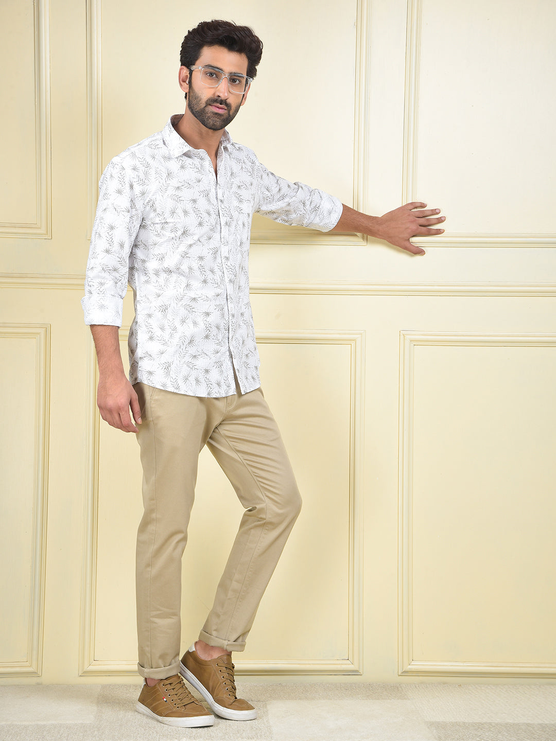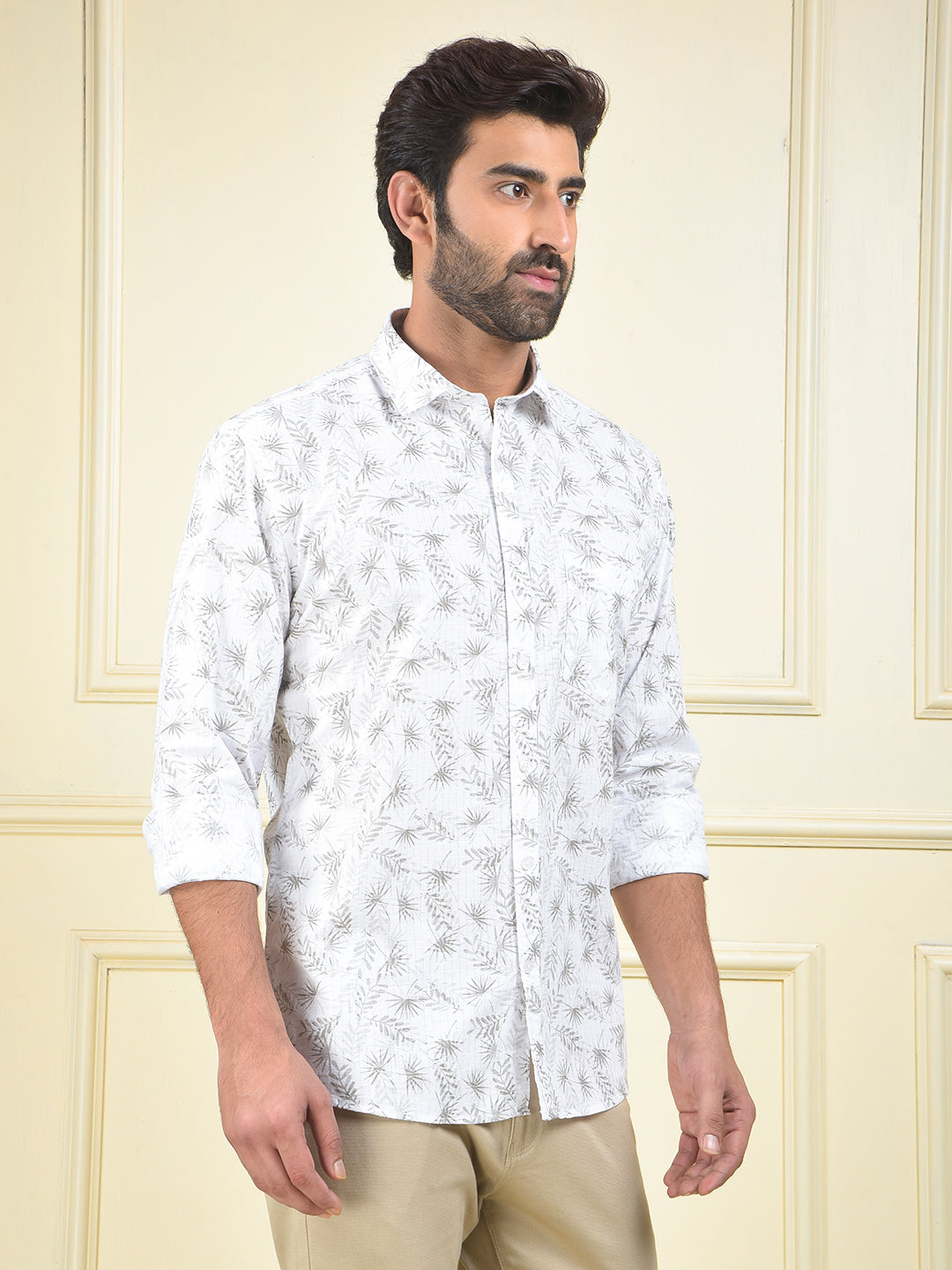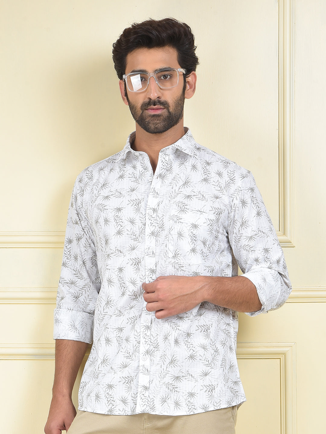 A white floral print shirt, a fresh and stylish piece that offers a clean base and a beautiful pattern perfect for a light, breezy look.