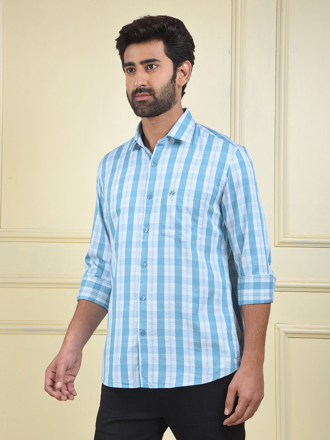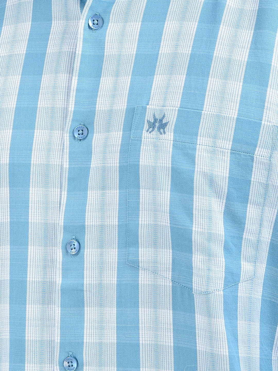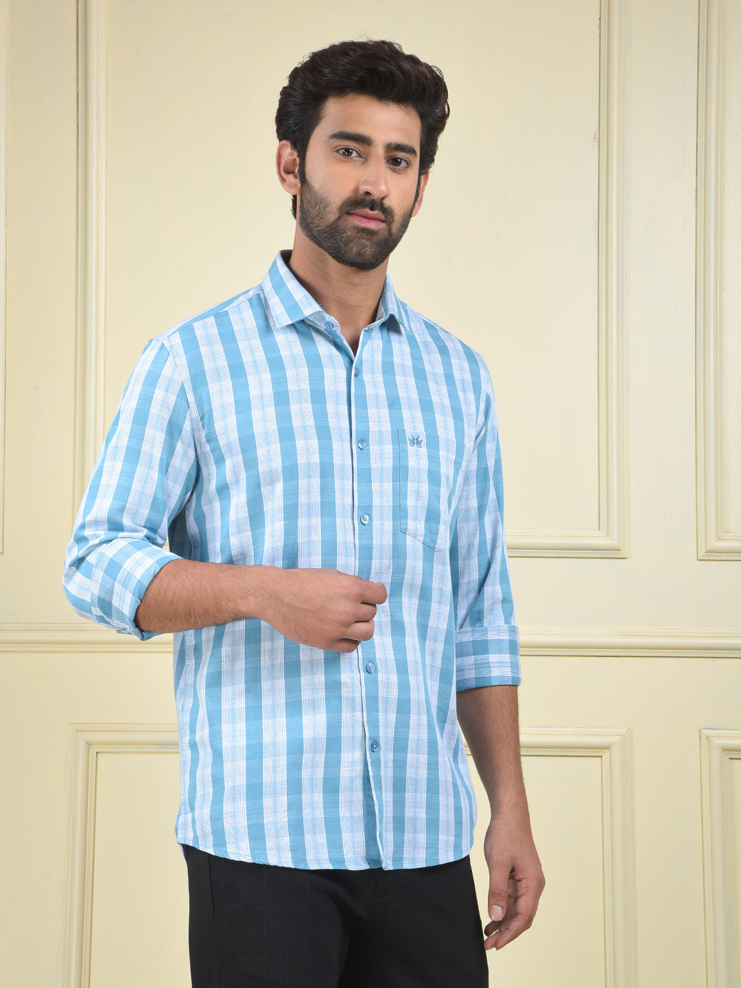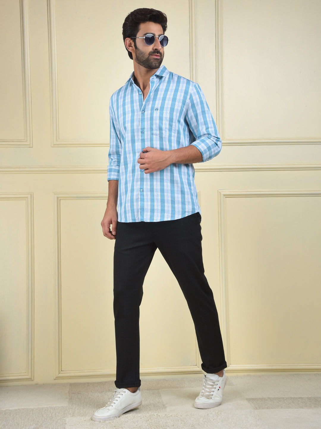A blue checked shirt, a comfortable and timeless piece that is perfect for a classic, versatile, and relaxed casual style.
