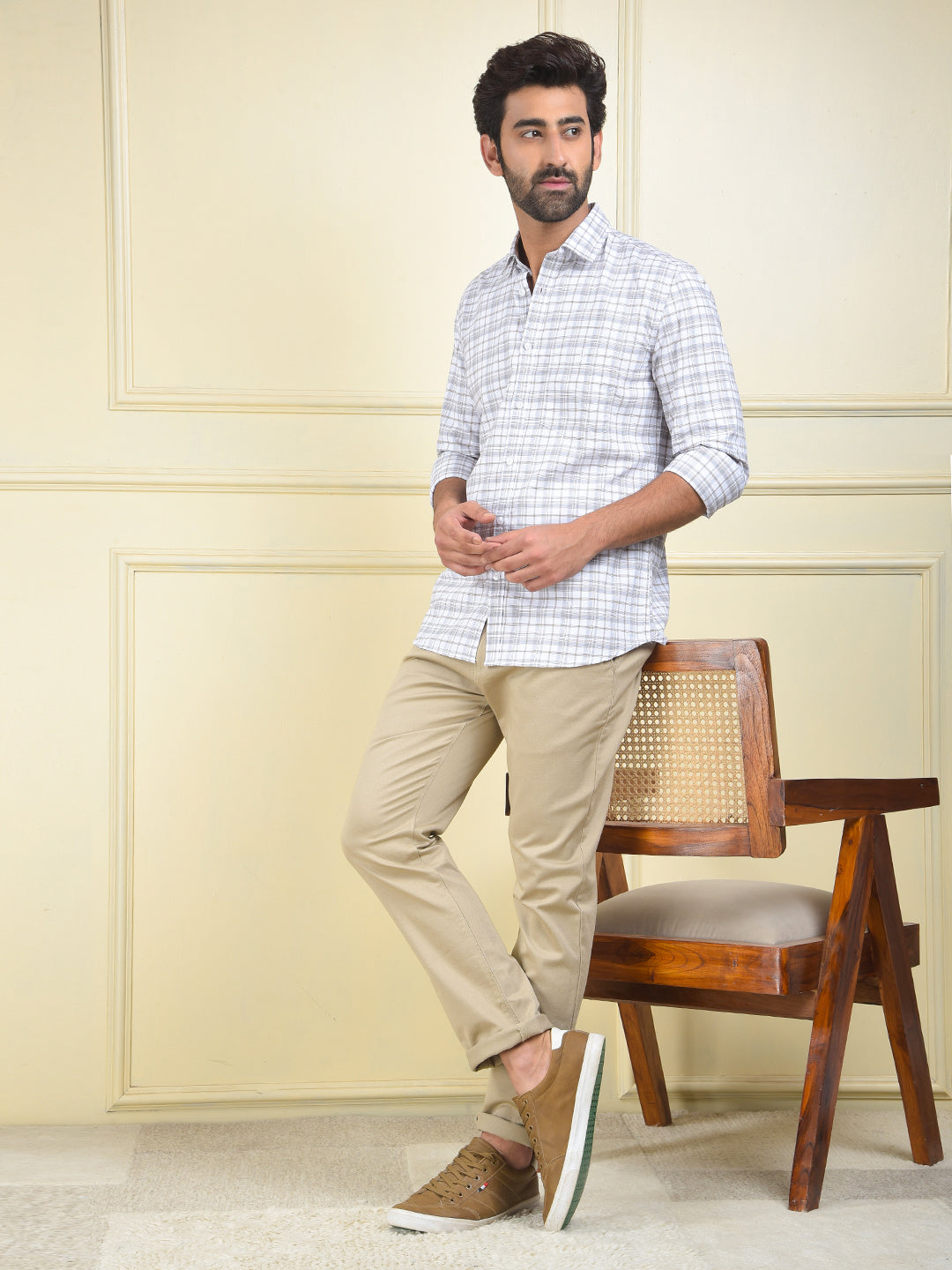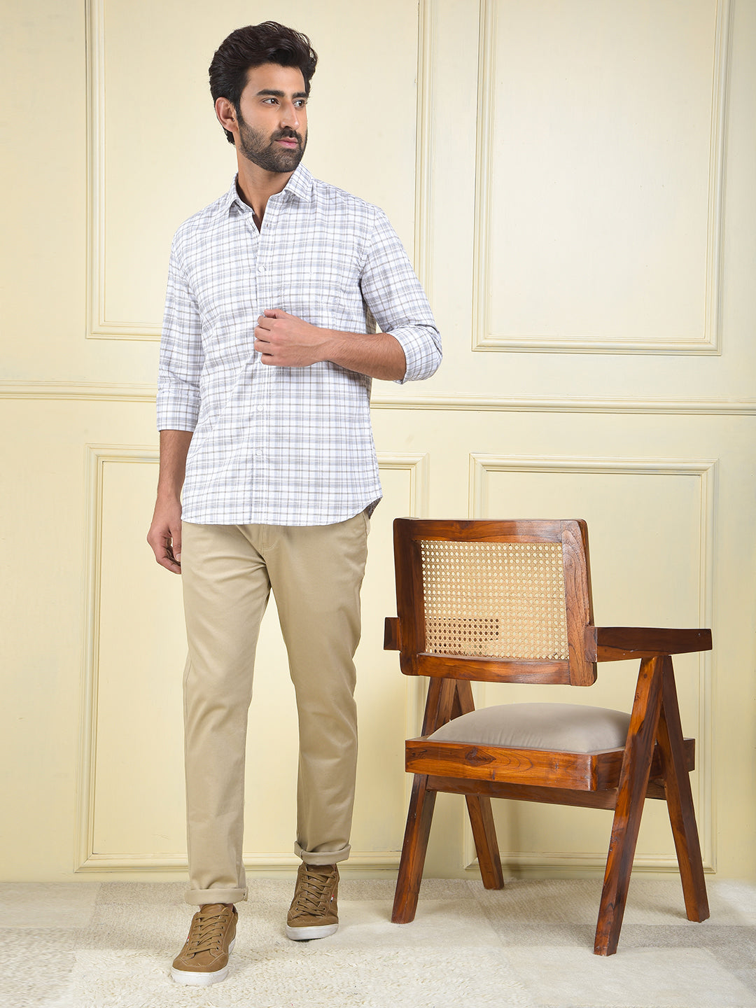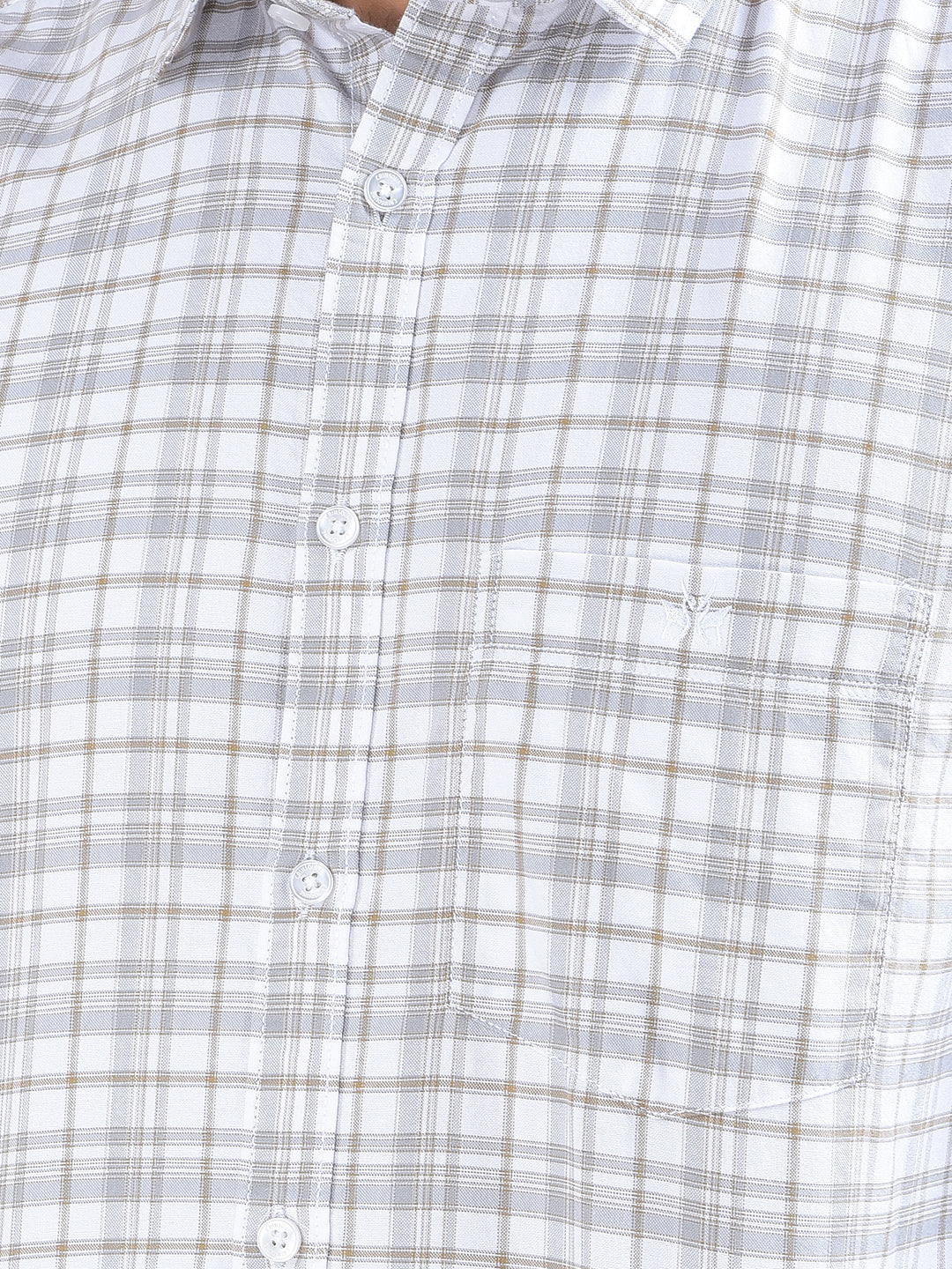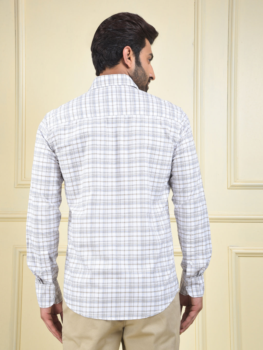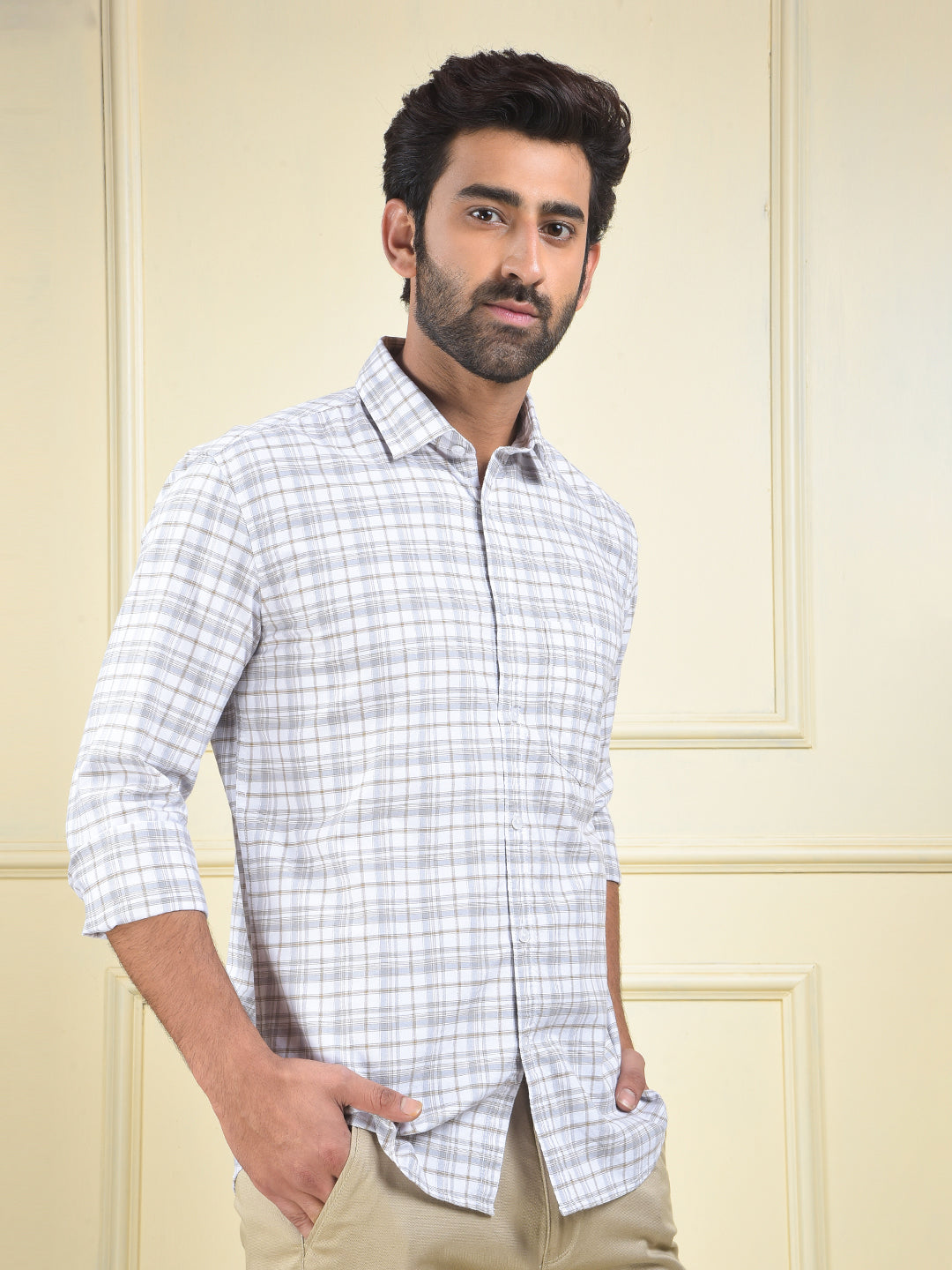 A grey checked shirt crafted from 100% cotton, offering a comfortable and breathable feel with a classic pattern for a versatile, casual look.