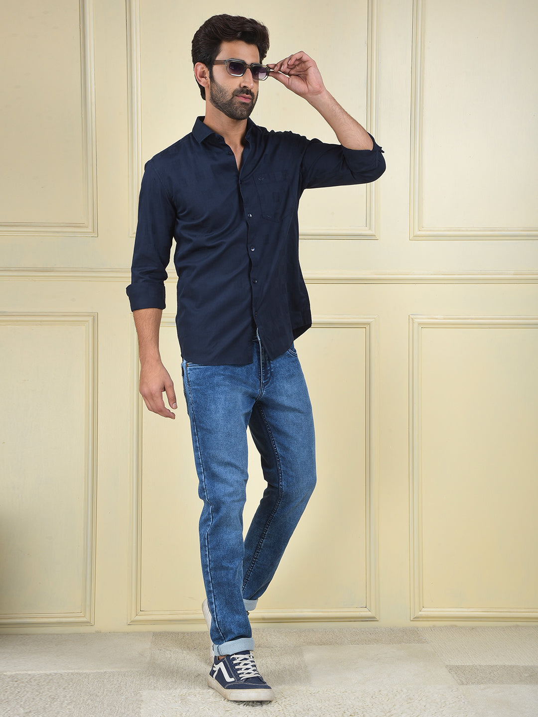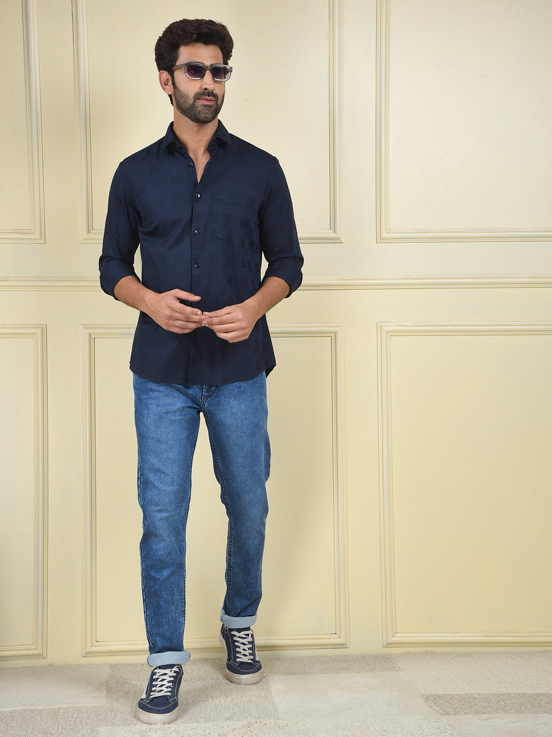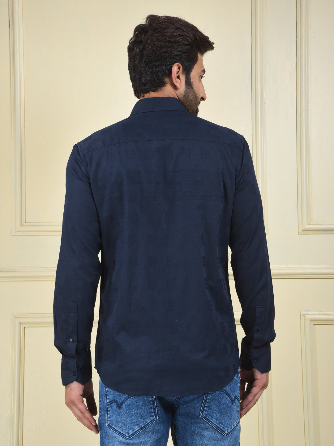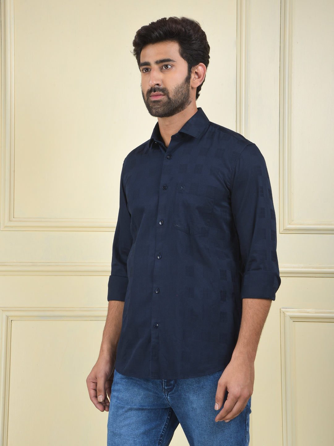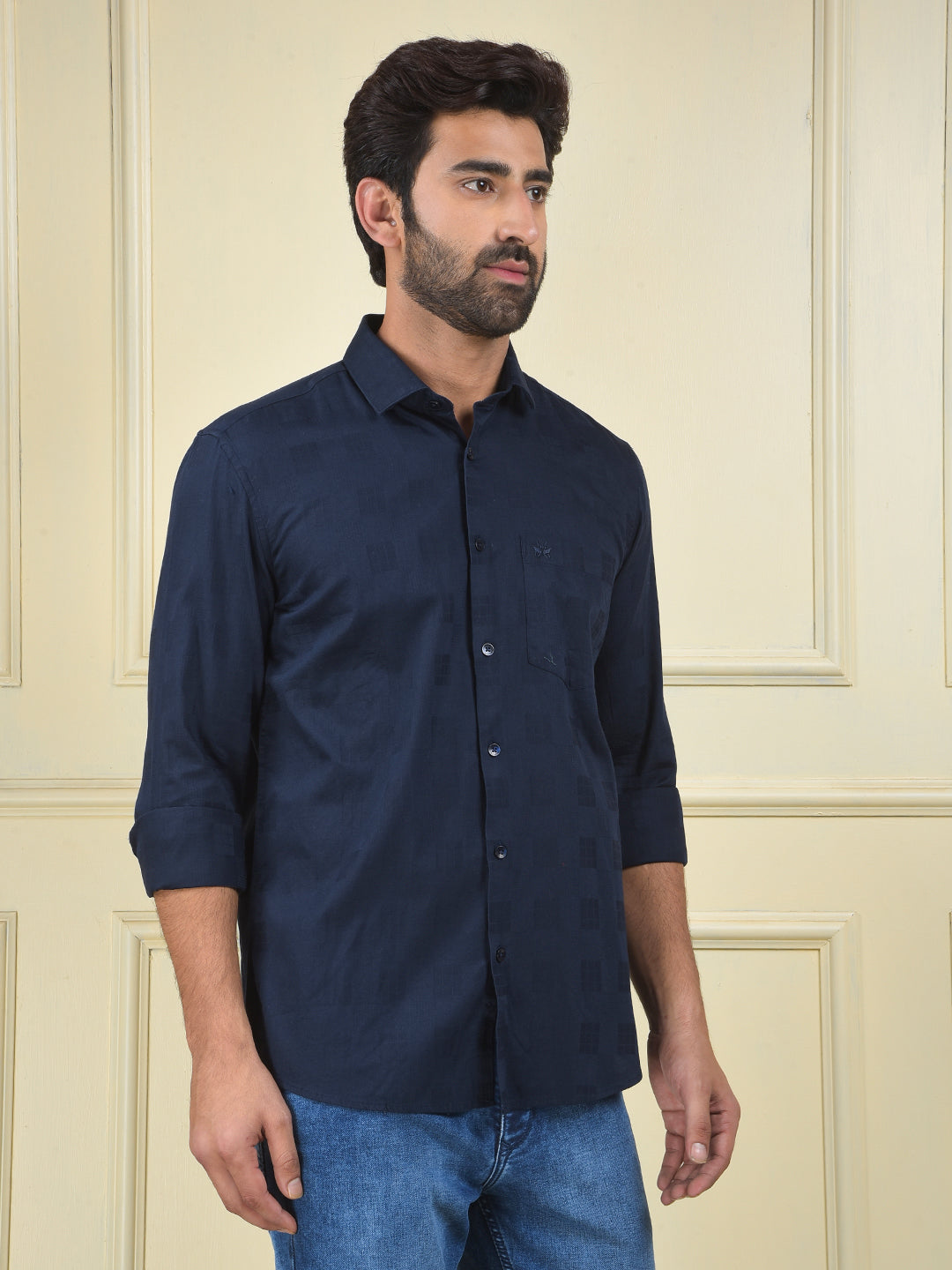 A navy blue shirt made from 100% cotton, a comfortable and timeless staple that is perfect for a clean, classic, and versatile look.