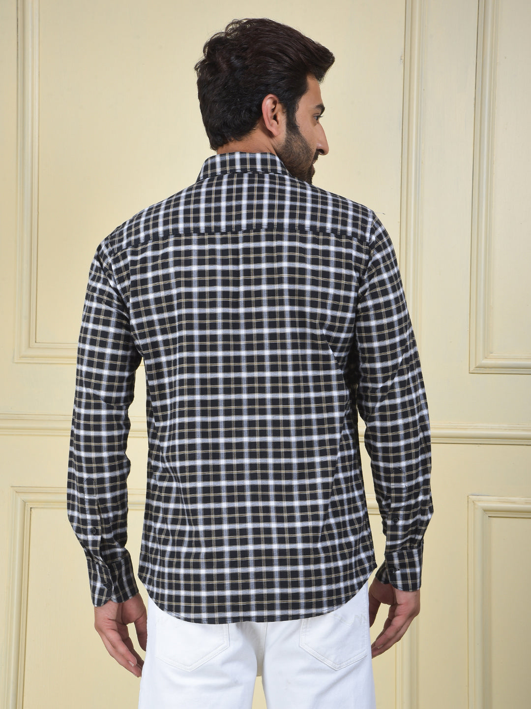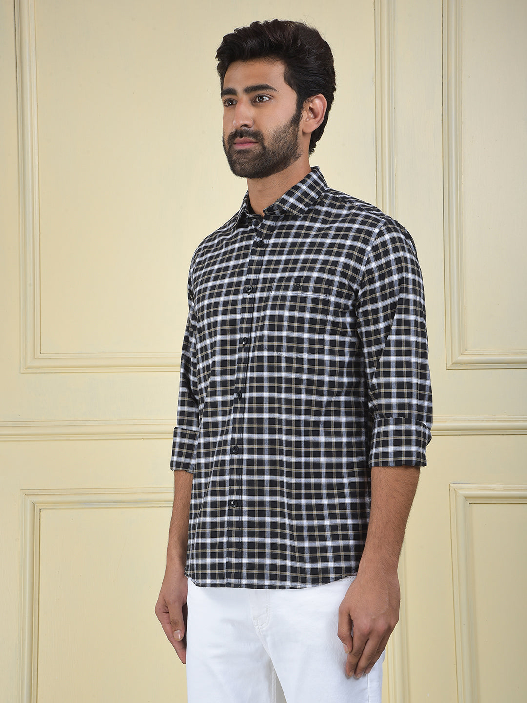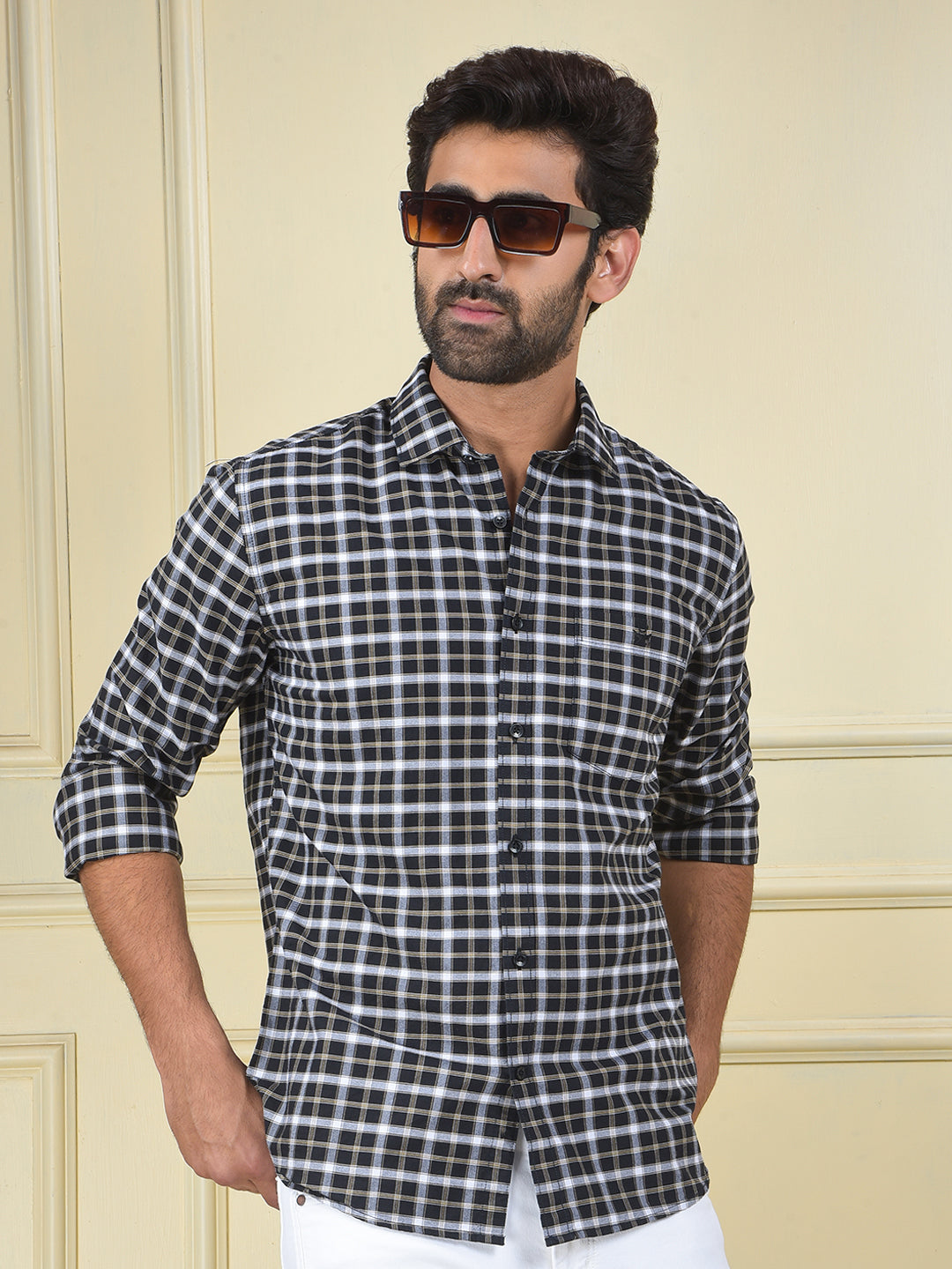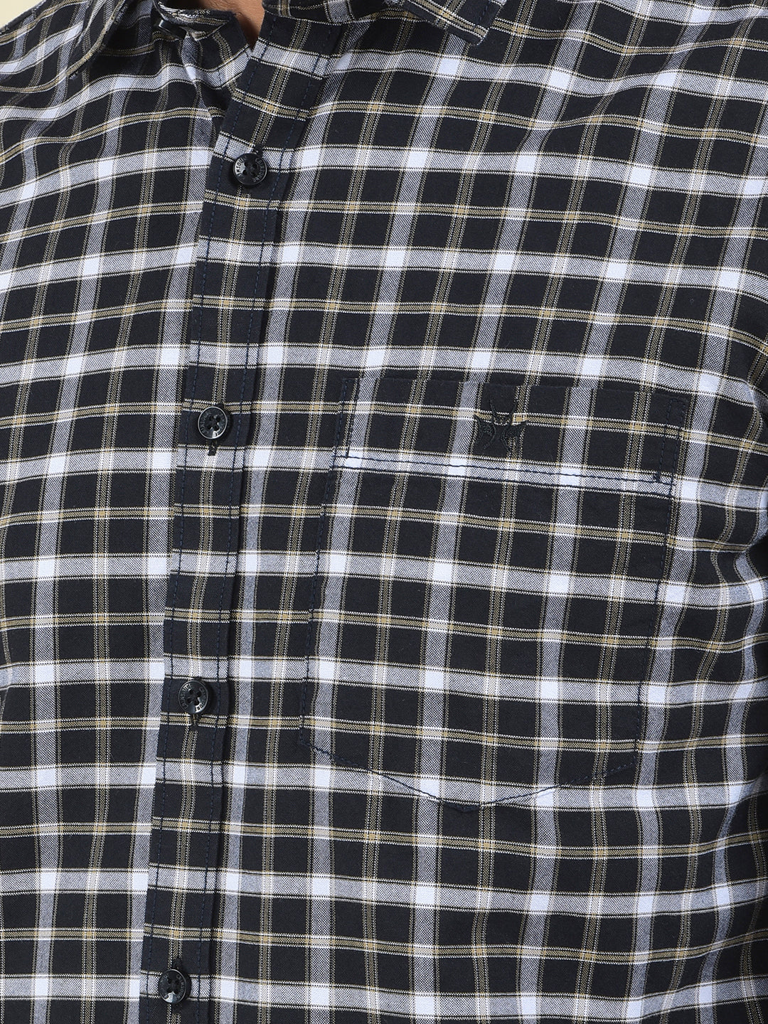 A navy blue checked shirt made from 100% cotton, a classic and comfortable piece that offers a timeless pattern and a versatile, neat look.