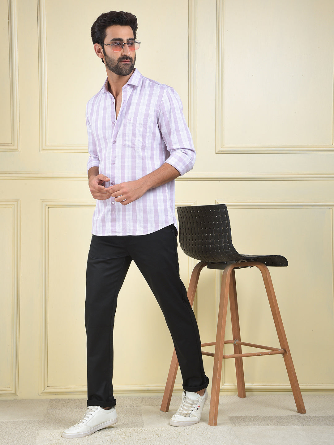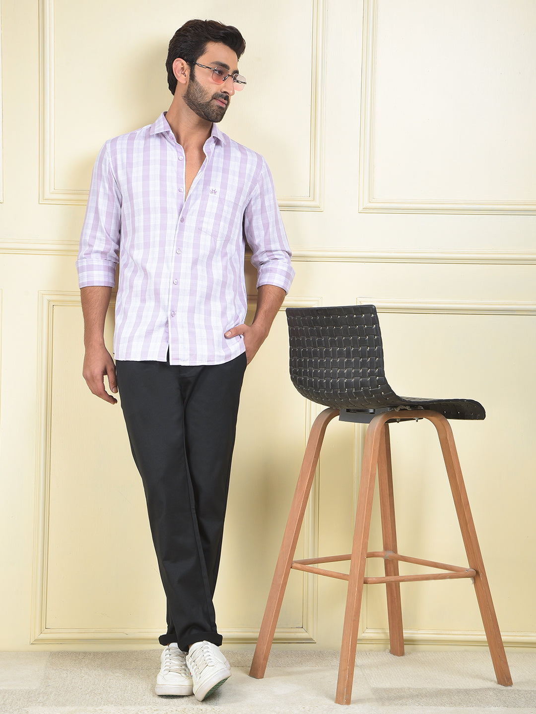 A purple checked shirt, a comfortable and unique piece that adds a stylish pattern and a vibrant color to a classic casual outfit.