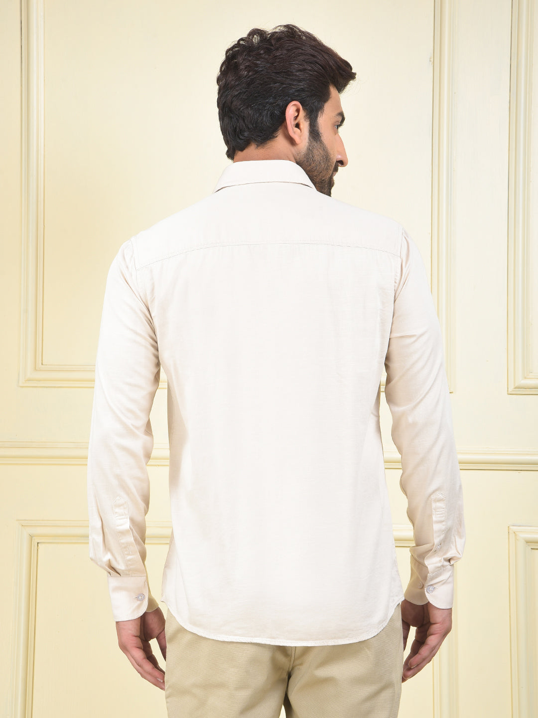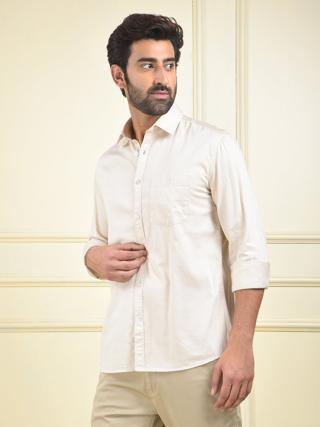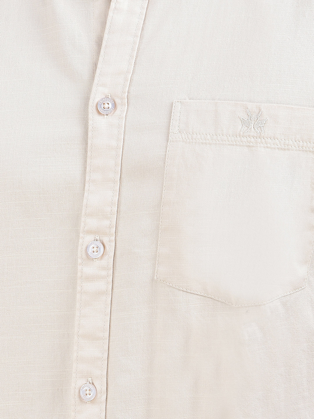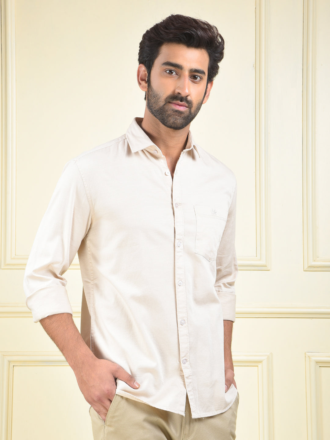 A beige shirt, a versatile and neutral piece that offers a comfortable fit and a relaxed look, perfect for pairing with any trousers.