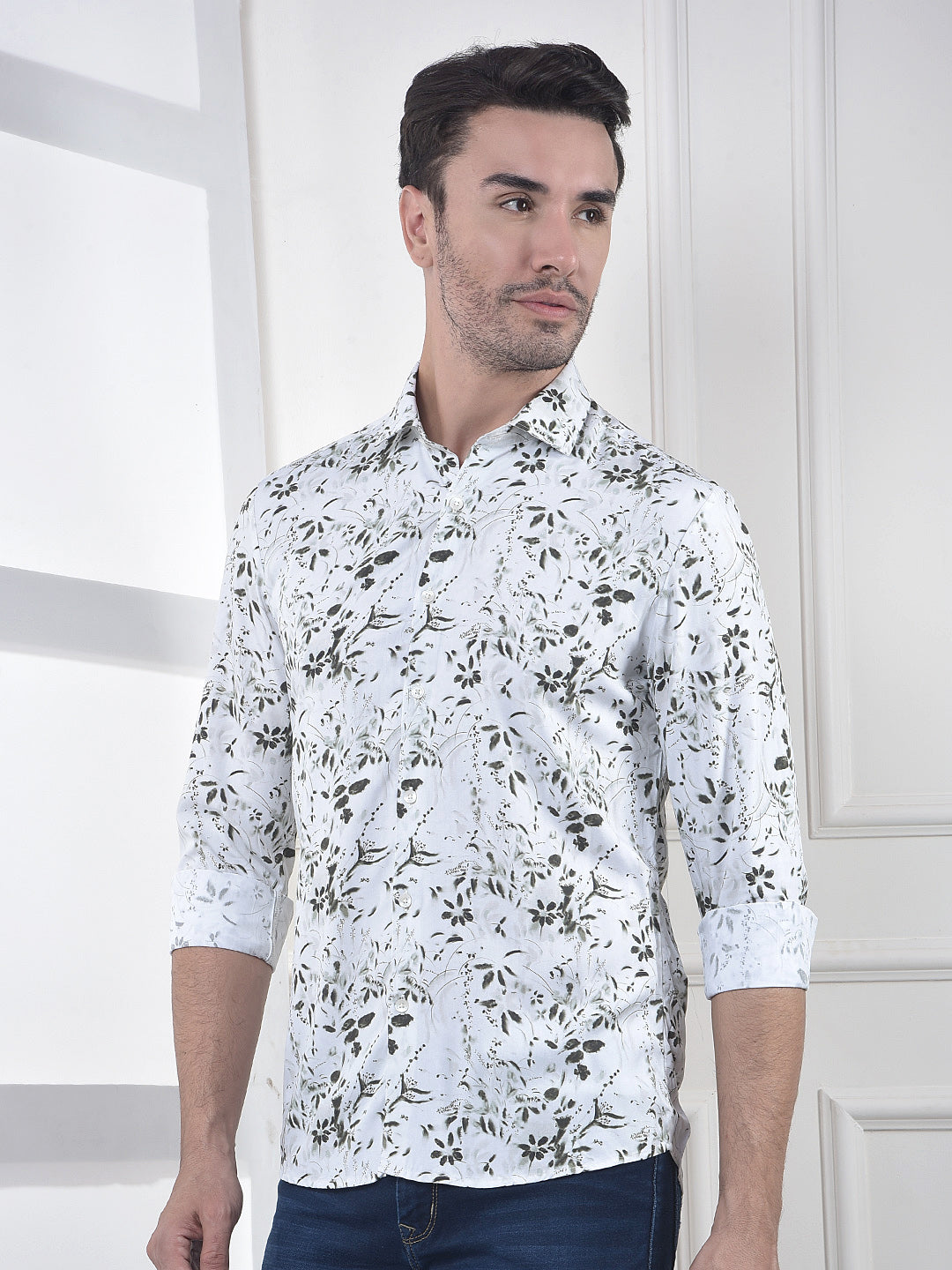 Men's White Floral Print Shirt From Crimsoune Club. Crafted In Soft Fabric With Collared Neck And Full Sleeves. Perfect For Casual Or Smart-Casual Occasions.