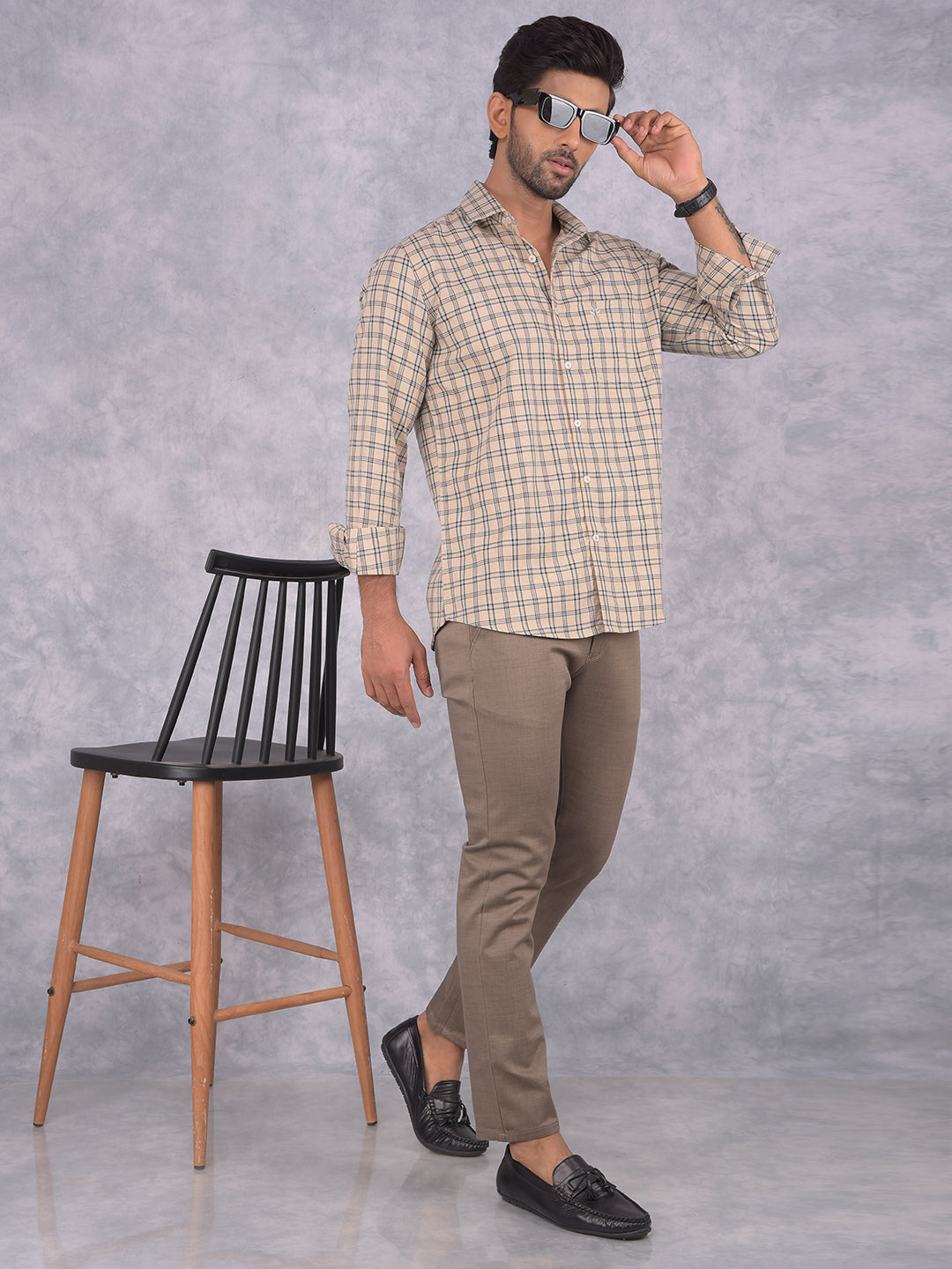 Beige Checked 100% Cotton Shirt-Men Shirts-Crimsoune Club