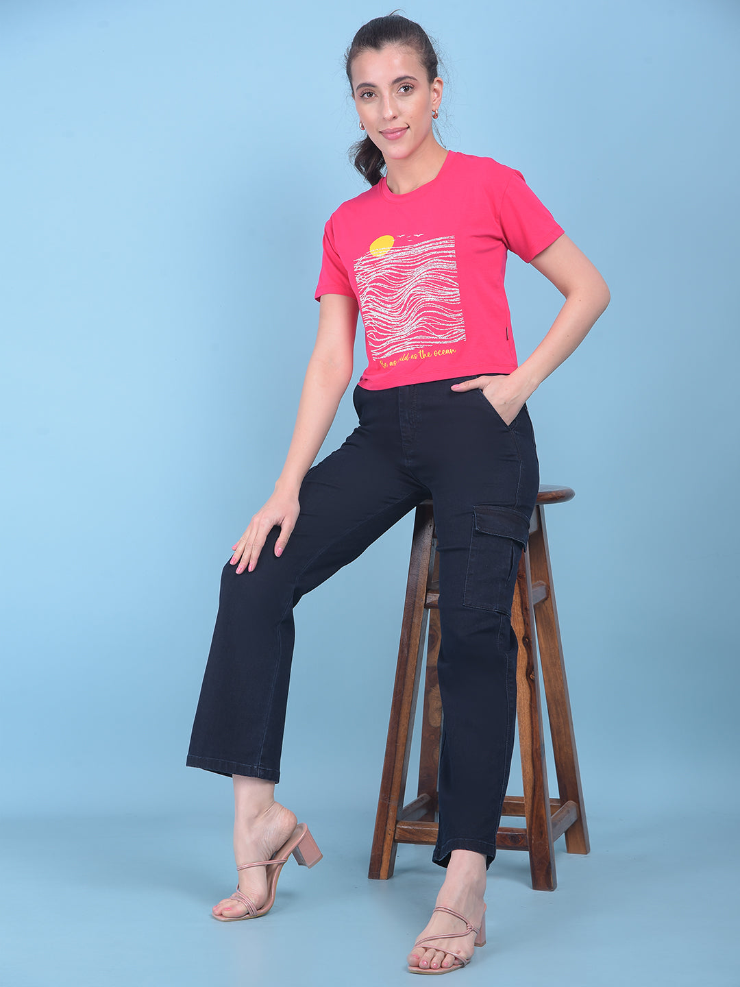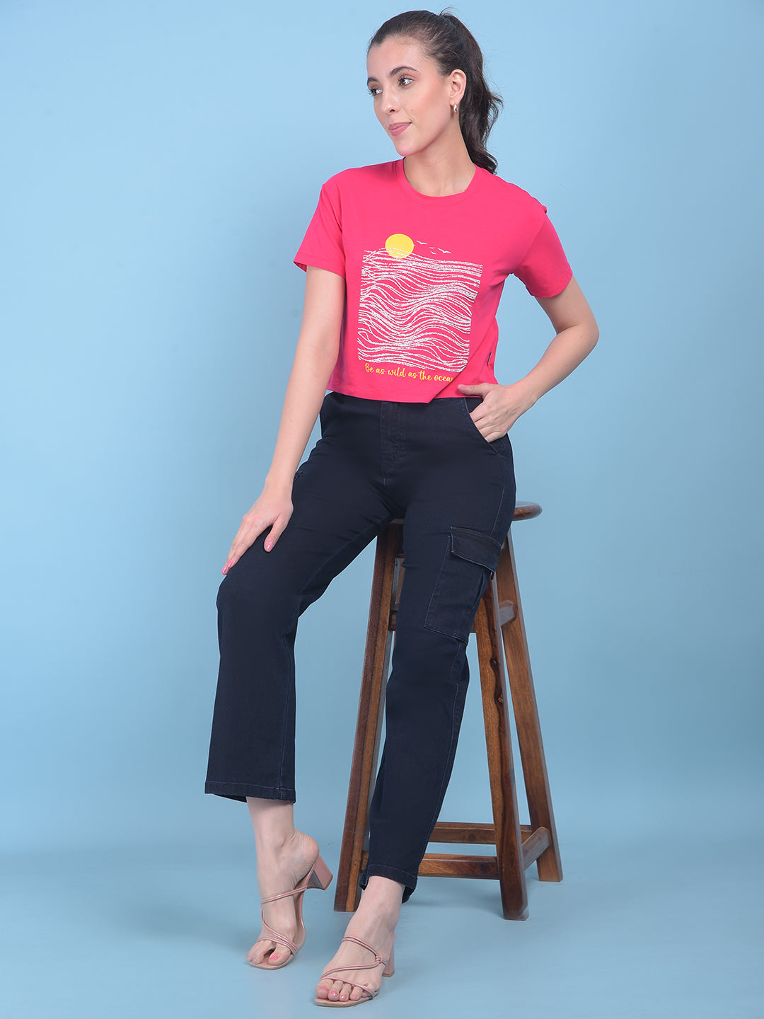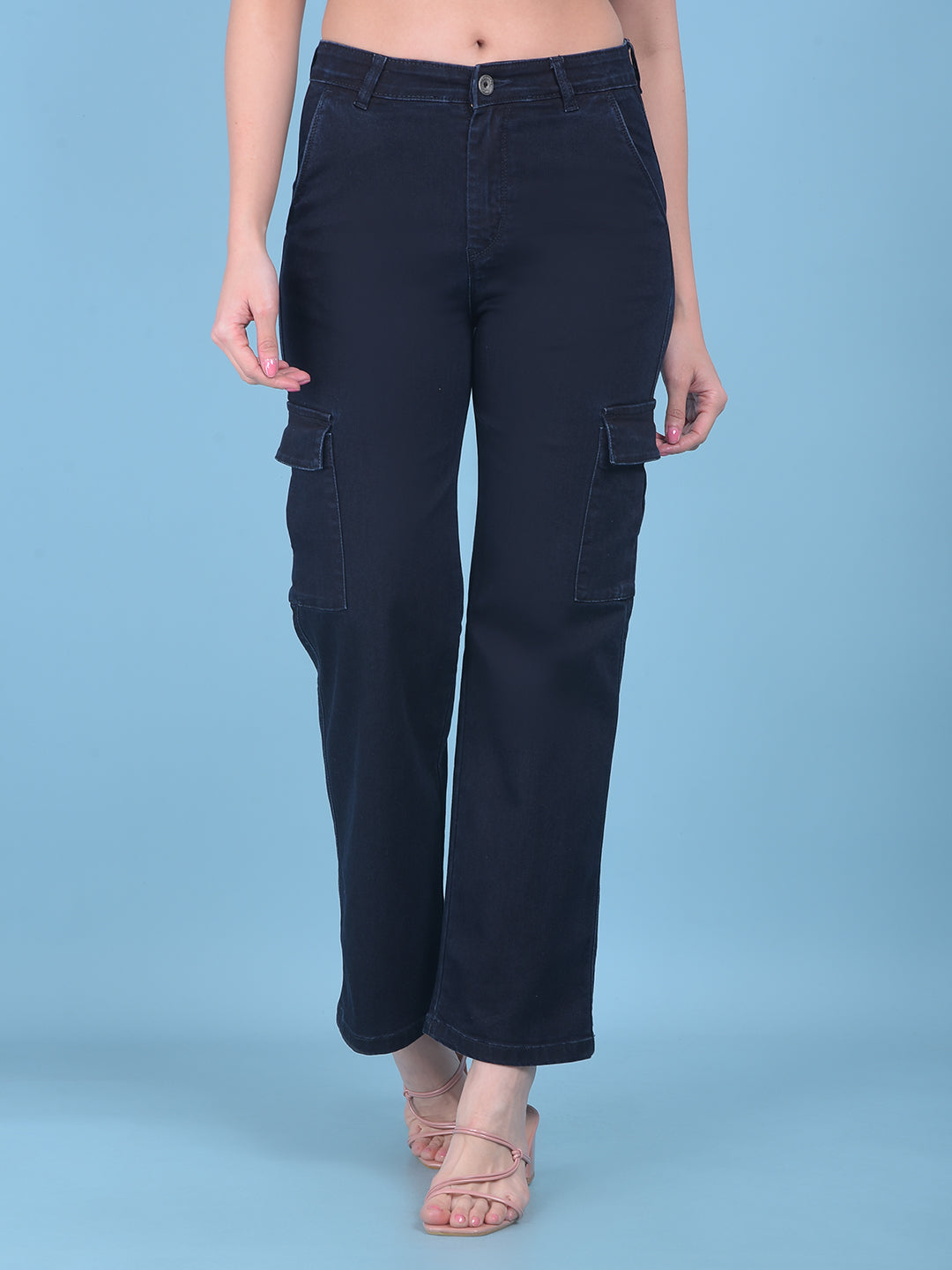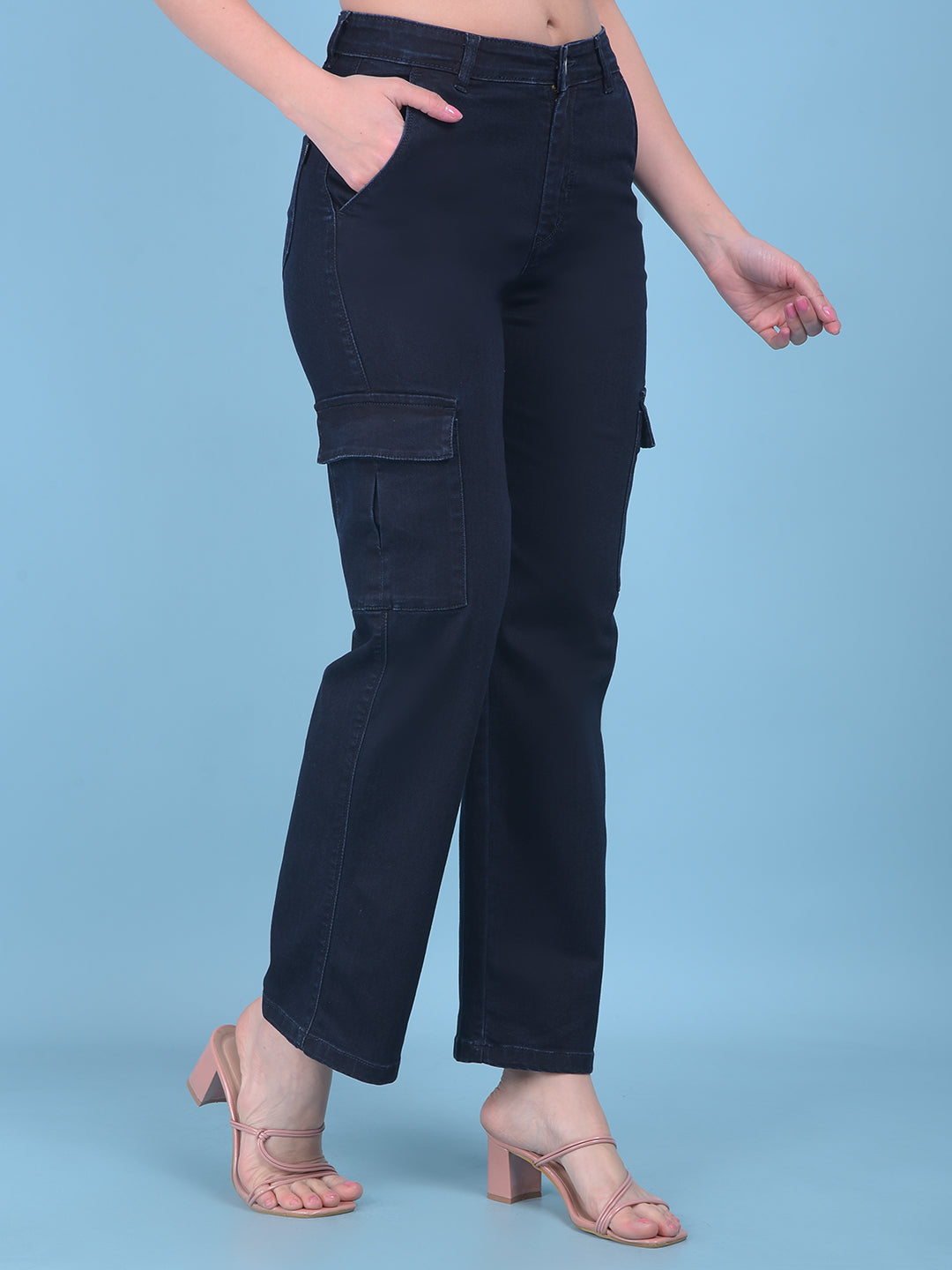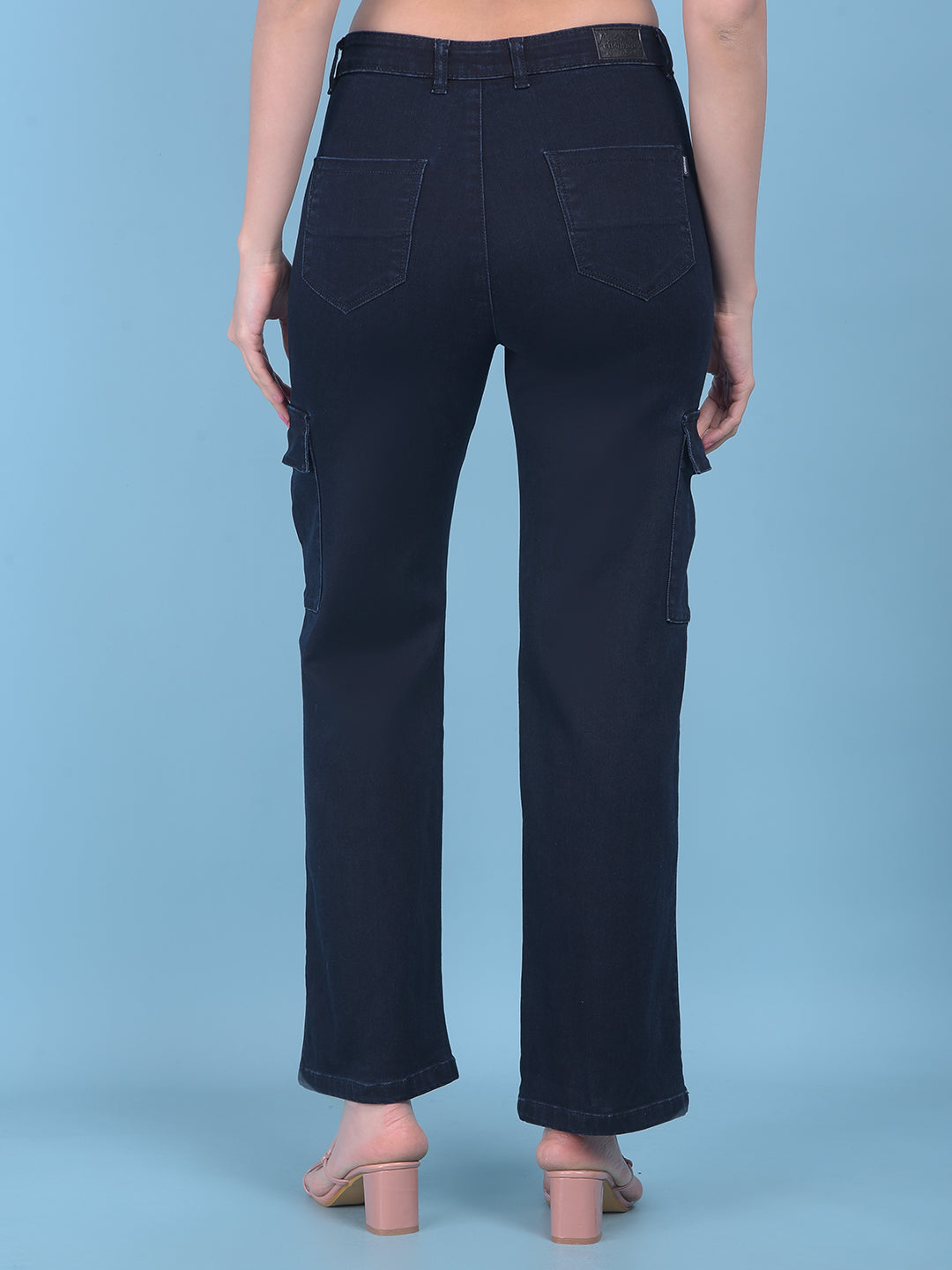 Navy Blue Cargo Wide-Leg Jeans-Women Jeans-Crimsoune Club