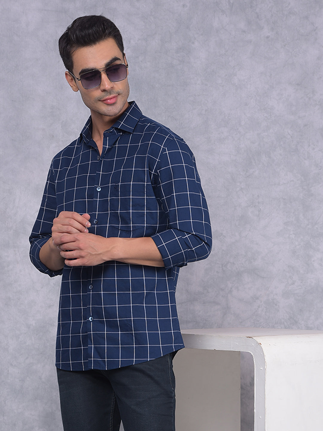 Navy Blue Windowpane Check 100% Cotton Shirt-Men Shirts-Crimsoune Club