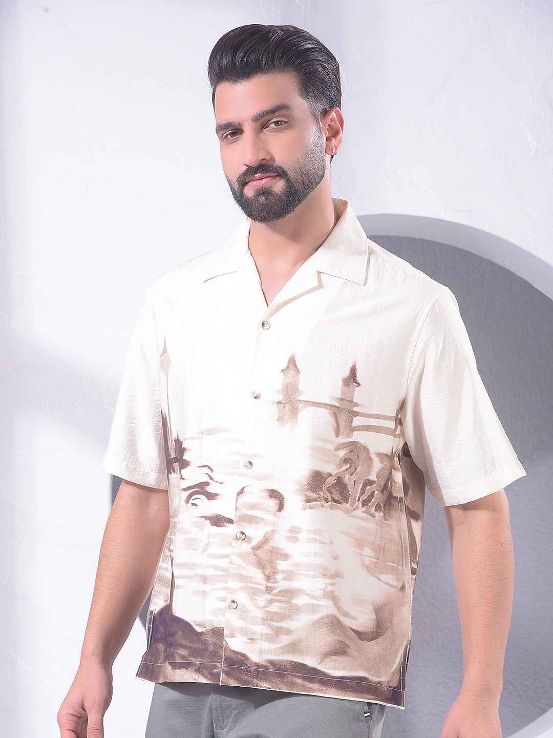 Olive Printed Resort-Collar Shirt