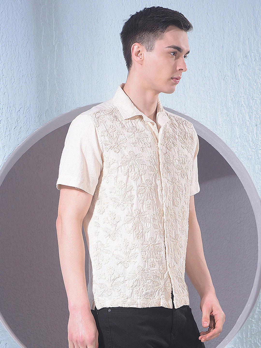 This Crimsoune Club men's beige linen shirt features delicate embroidery for a refined touch. The breathable linen fabric and subtle detailing make it a standout choice for summer events and gatherings.
