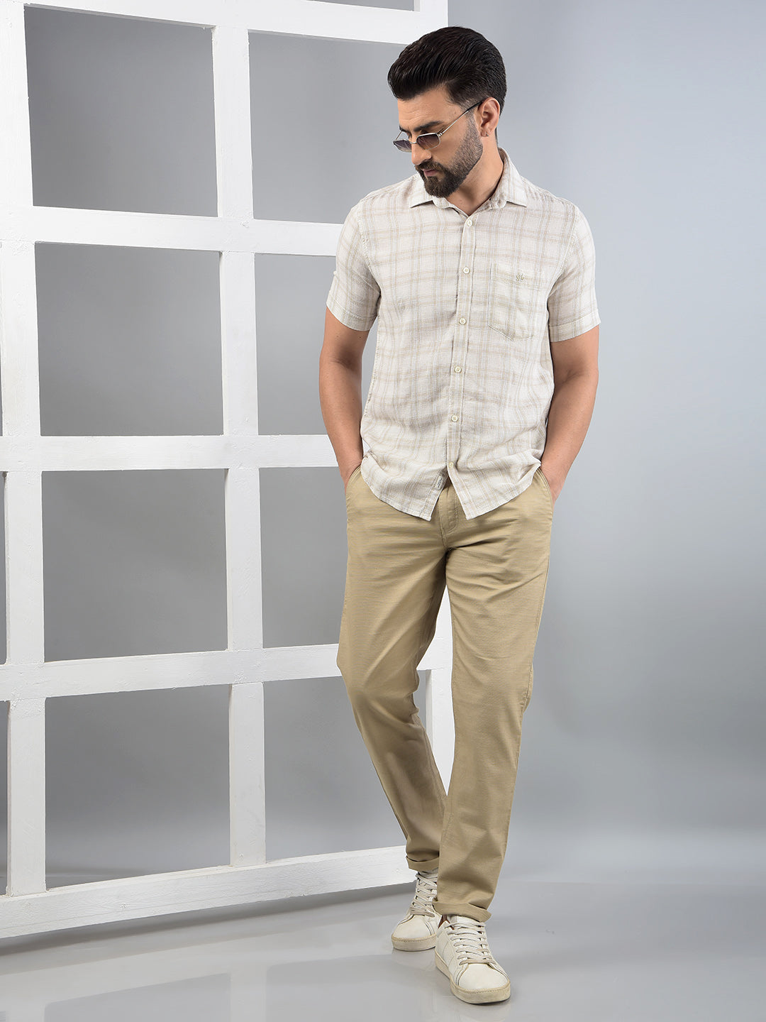 Beige Checked Linen Shirt-Men Shirts-Crimsoune Club