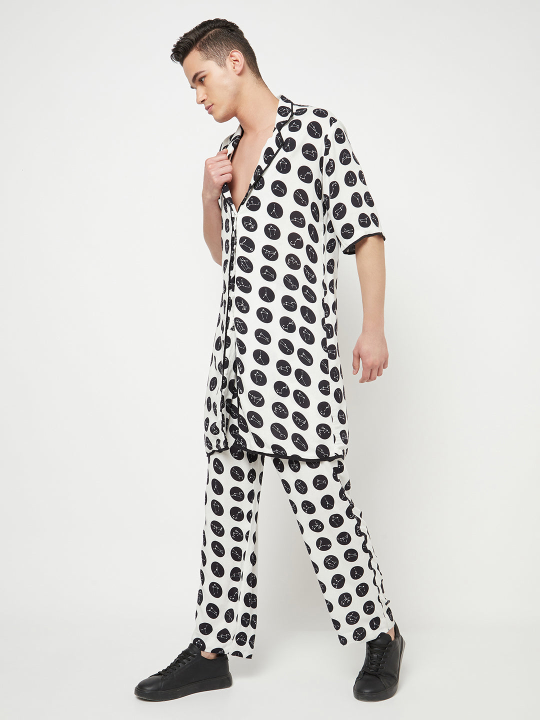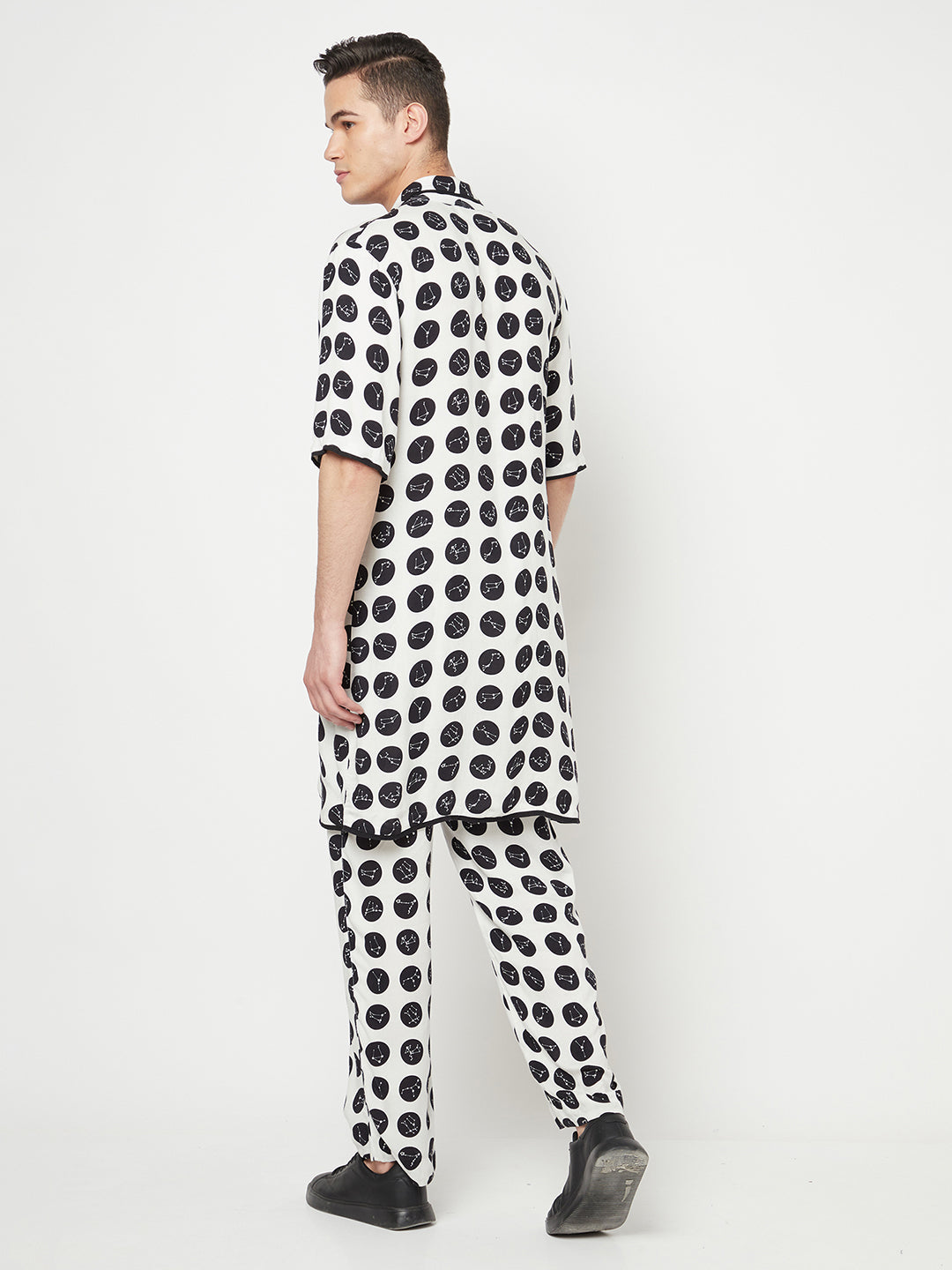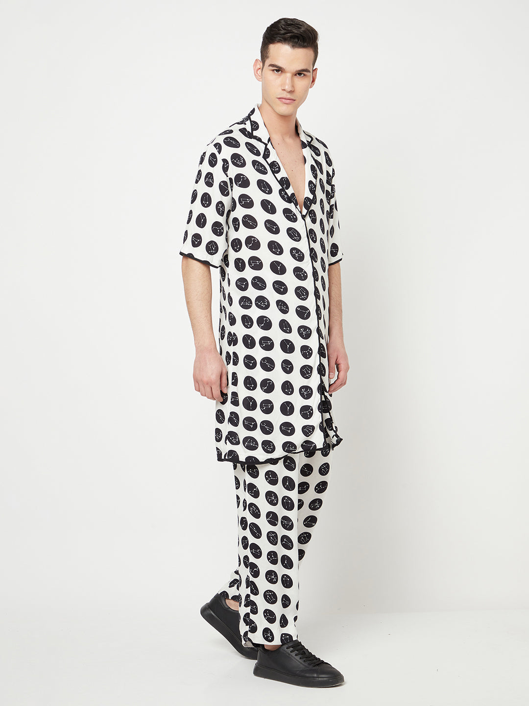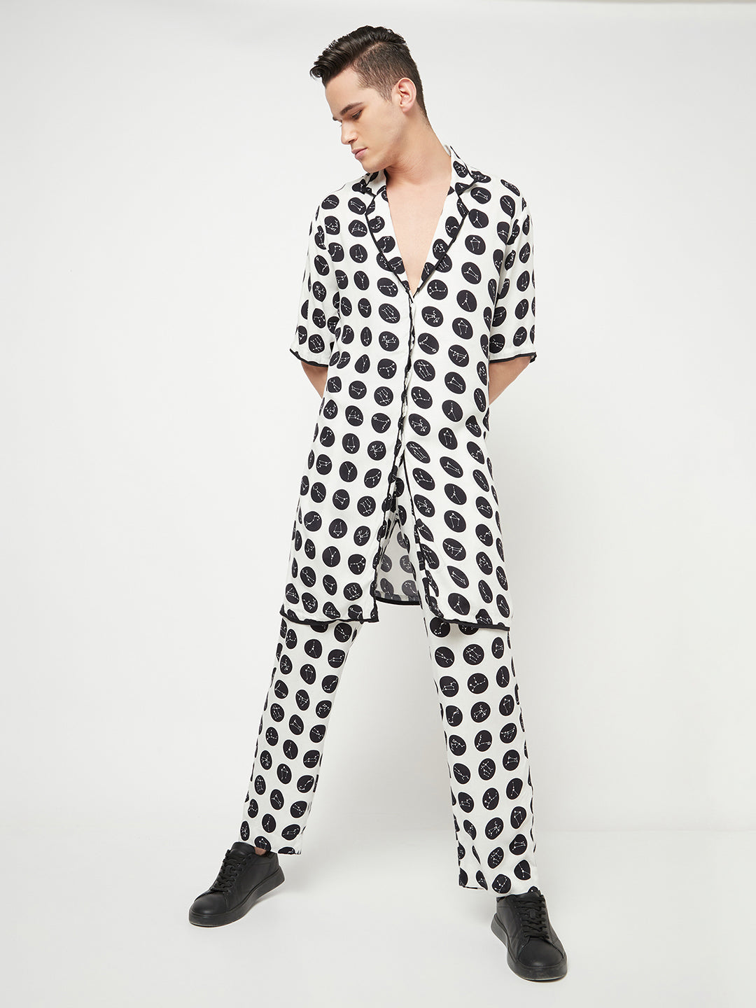 Crafted with premium quality Lyocell for a lightweight touch and feel, this longline blazer is tailored to a regular fit that fall on in a relaxed and comfortable look. Detailed with a notched lapel collar and a concealed button closure, this constellation print polka-dotted blazer is wrinkle-resistant and absorbent, making it a great hassle-free wear. .