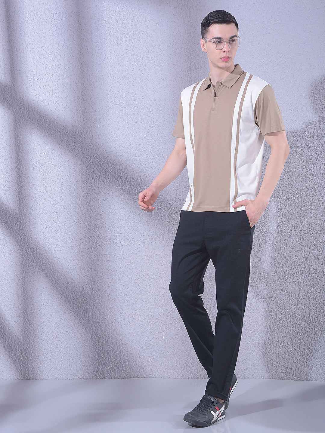 Beige Color-Blocked Polo Neck T-Shirt with Zip Closure