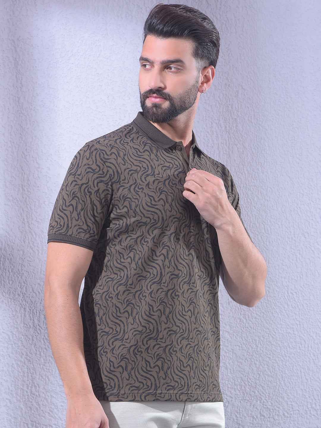Brown Abstract Print Polo Neck T-Shirt