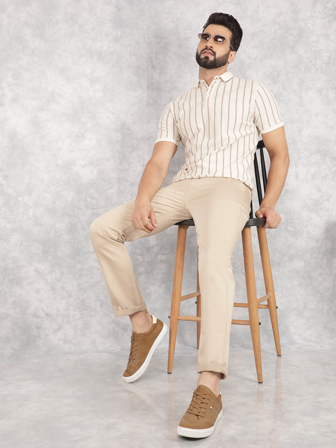 Cream Vertical Striped Polo Neck T-Shirt-Men T-Shirts-Crimsoune Club