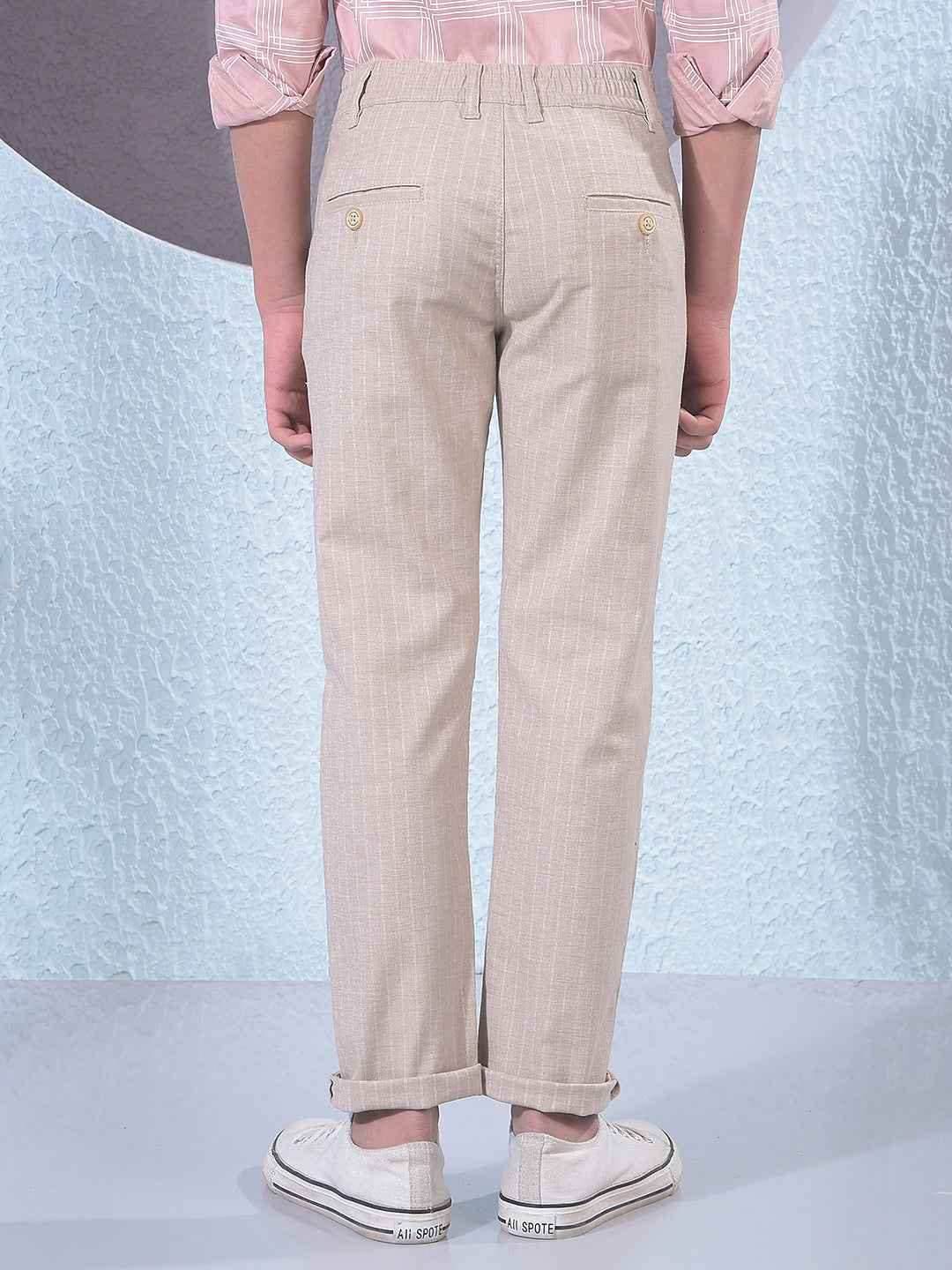 Experience classic style with these beige vertical stripes trousers. The high-quality material and traditional design ensure a reliable, stylish look that remains a staple for any young man's daily and professional wardrobe needs.