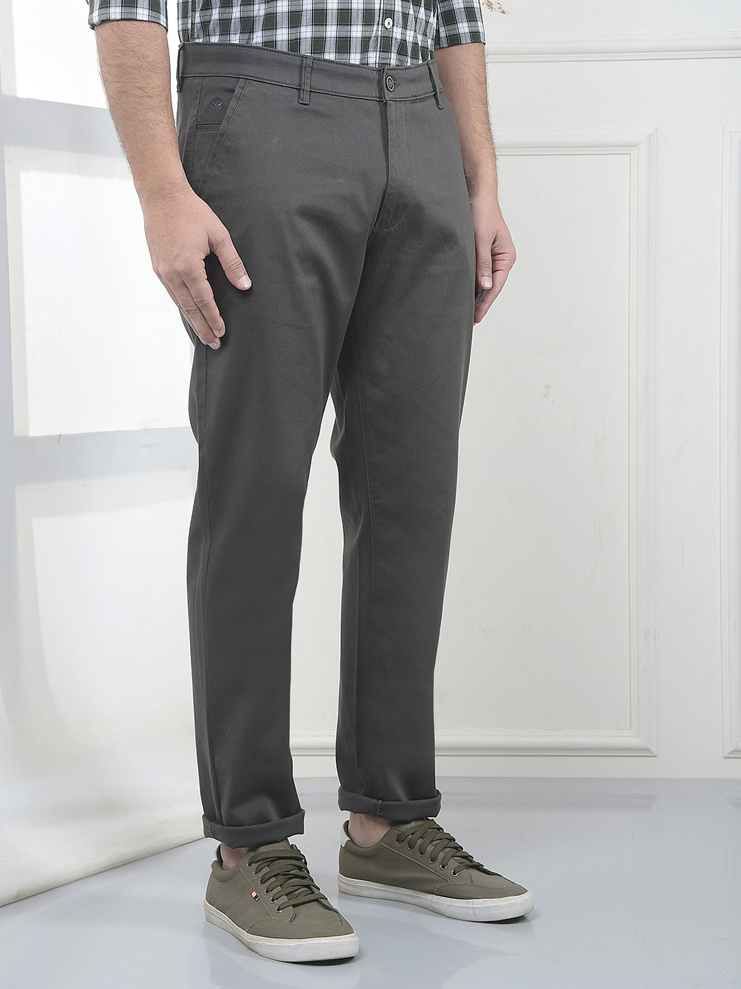 These Crimsoune Club men’s olive slim fit solid dobby trousers feature a refined dobby weave for extra character. The slim profile ensures a clean finish that works for semi-formal and casual occasions.