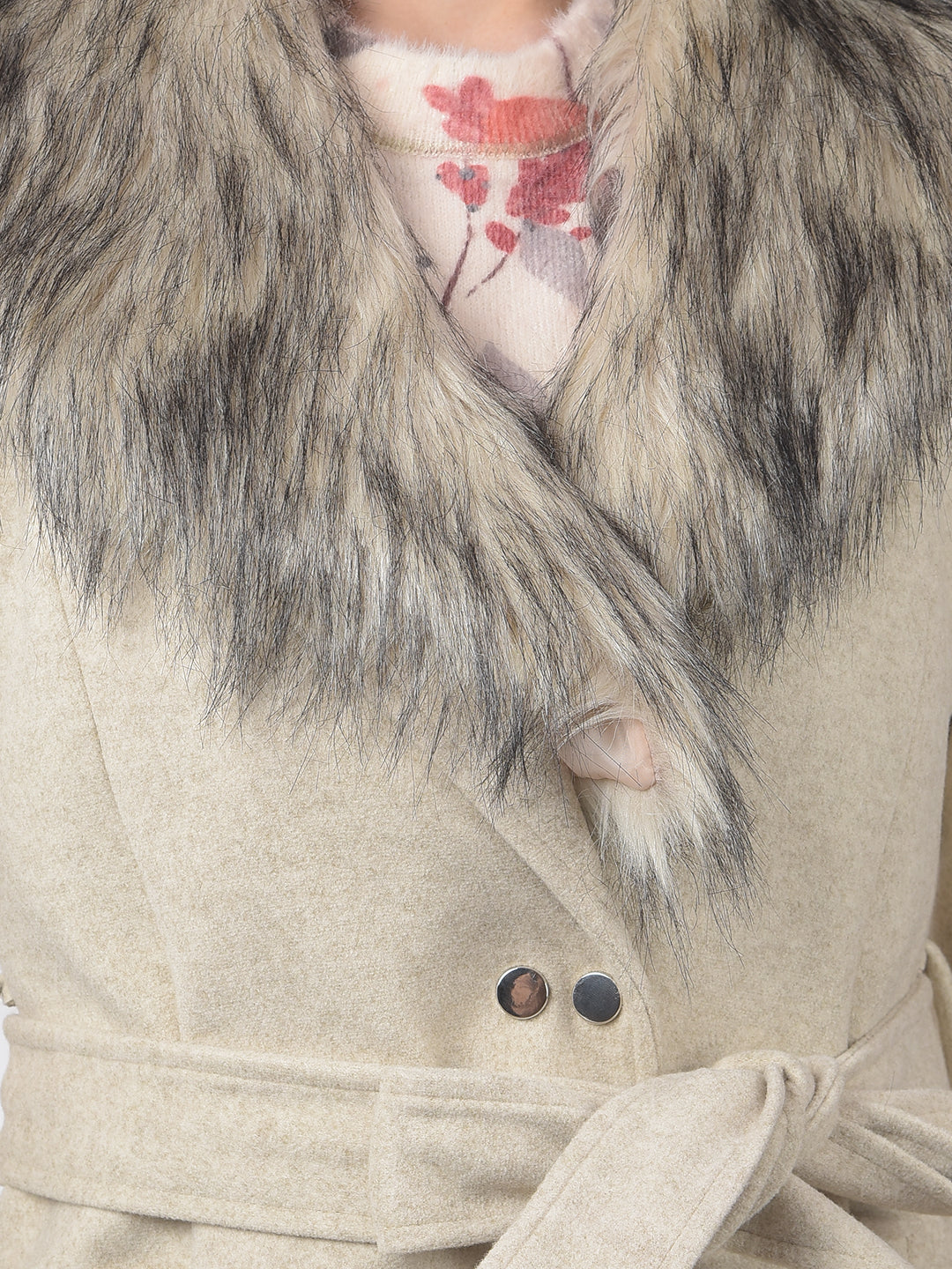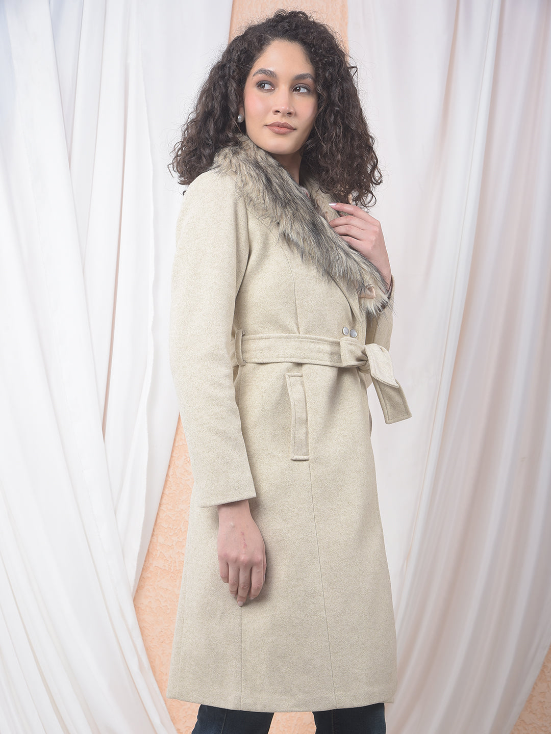 Faux Fur Trim Beige Belted Over-Coat
