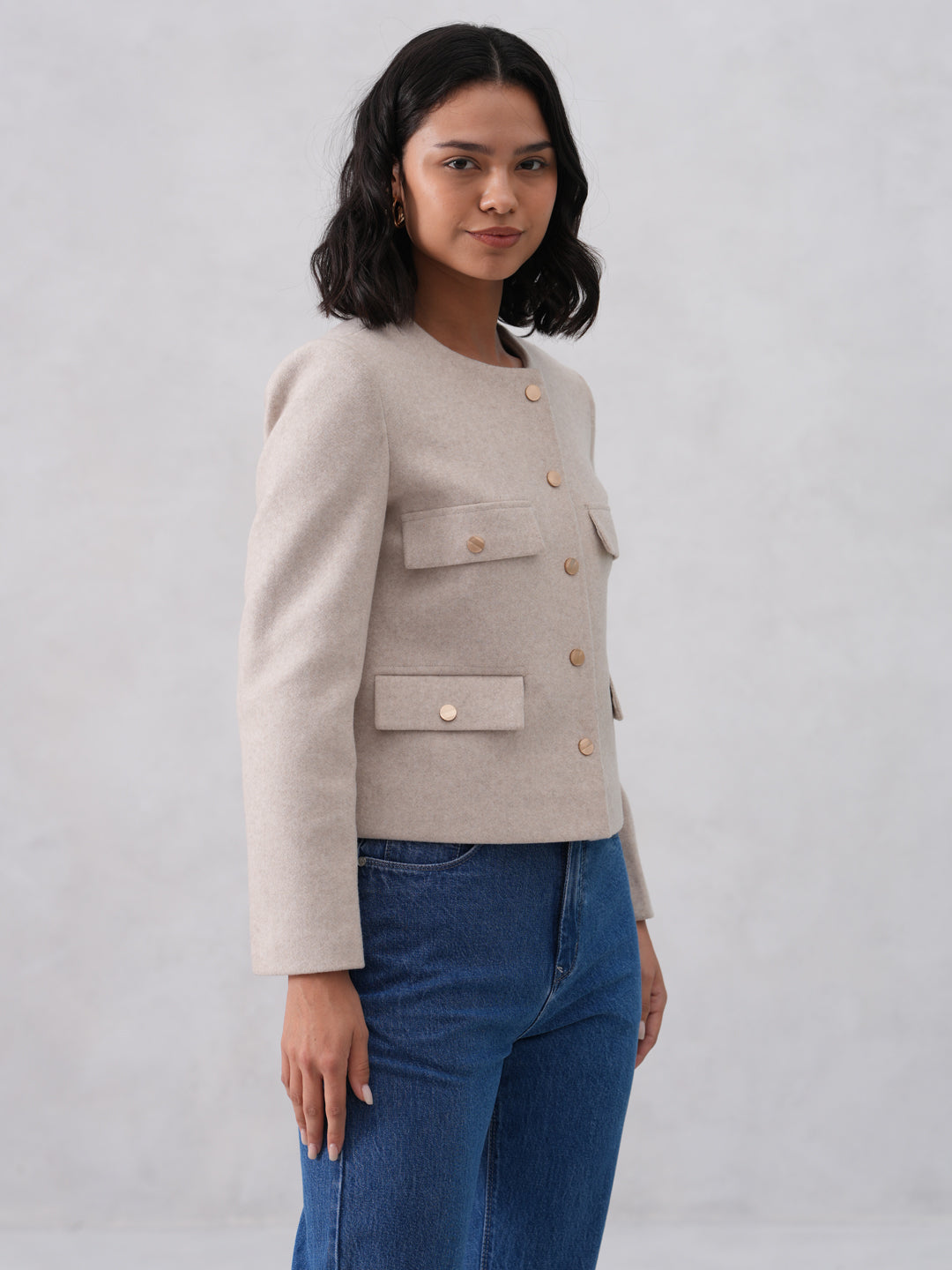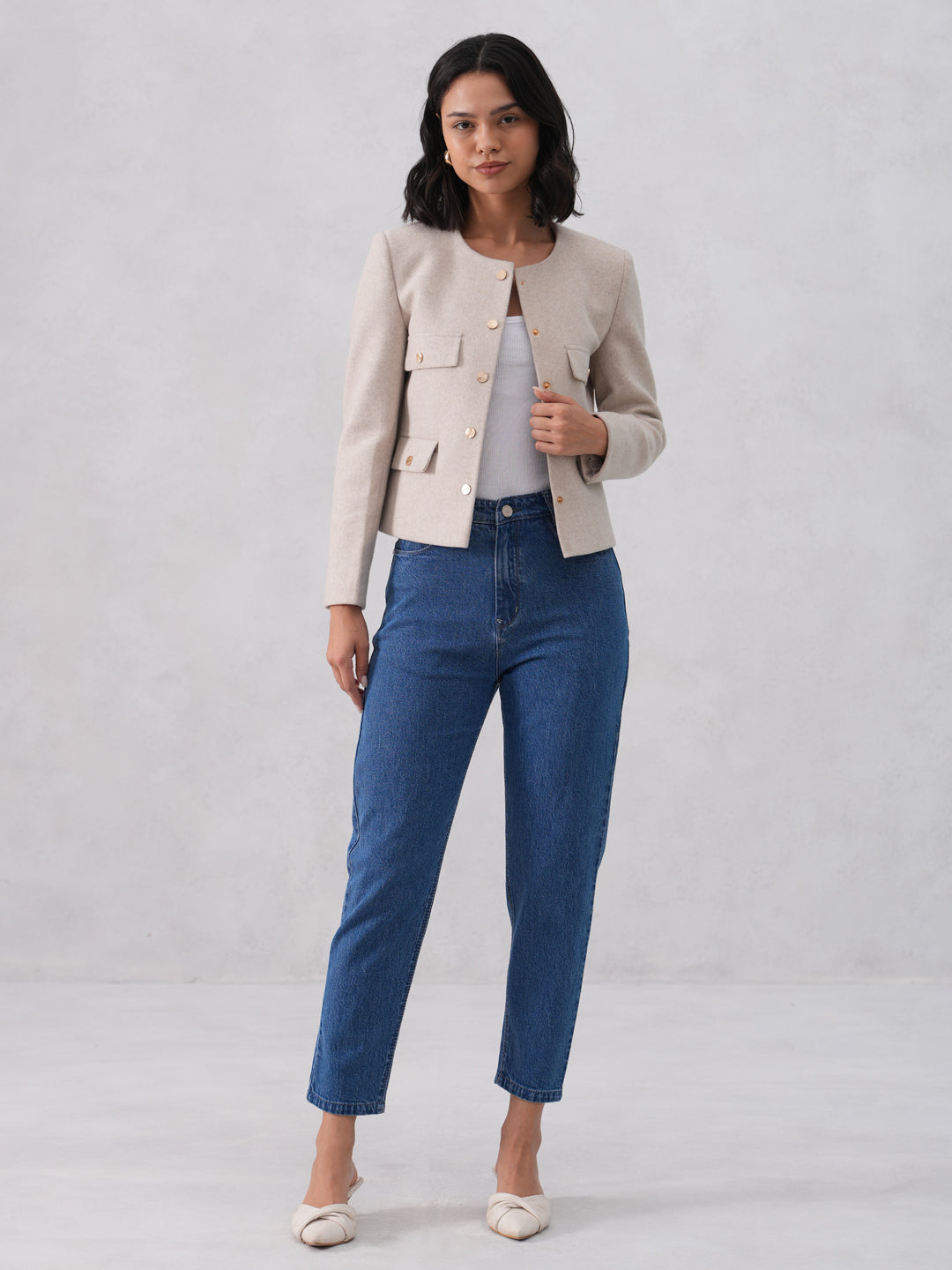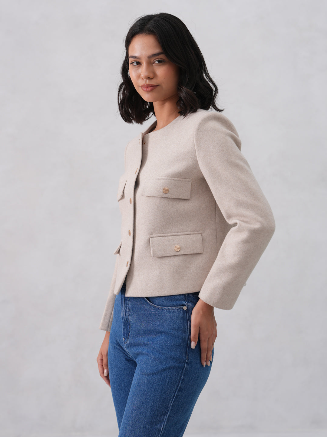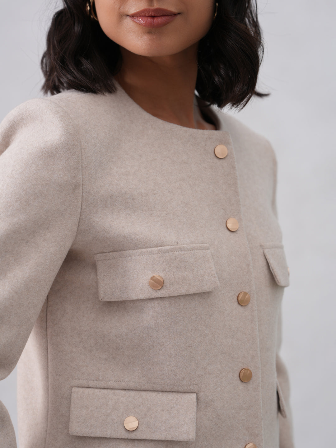 This Trendy Women's Cropped Coat From Crimsoune Club In Beige Is A Fashionable Outerwear Choice. The Cropped Length And Classic Color Make It A Perfect Piece For Creating A Modern And Stylish Silhouette.