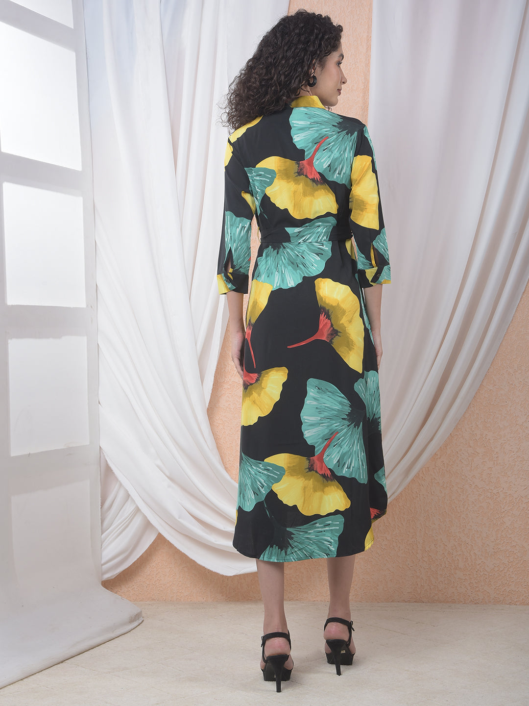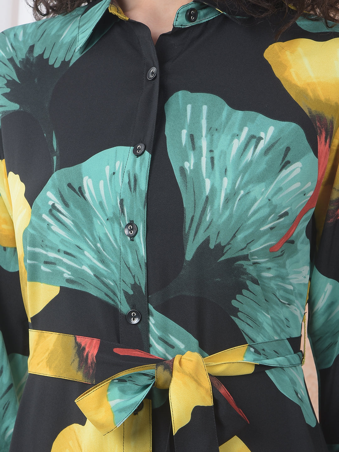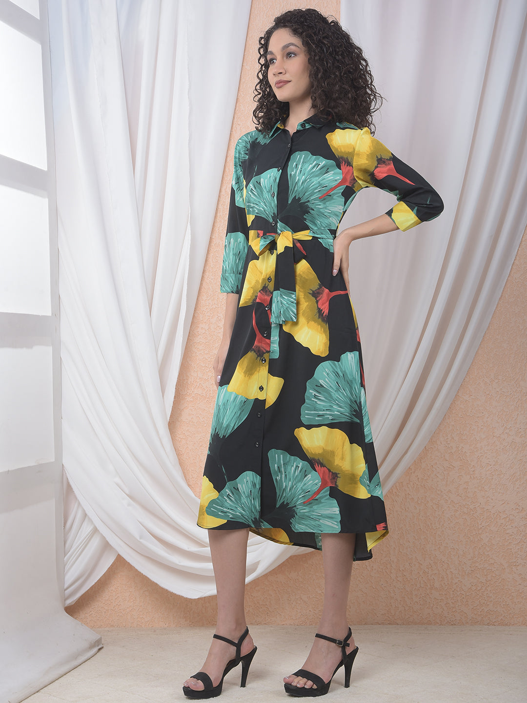 Black Floral Print Midi Shirt-Dress With Belt-Women Dresses-Crimsoune Club