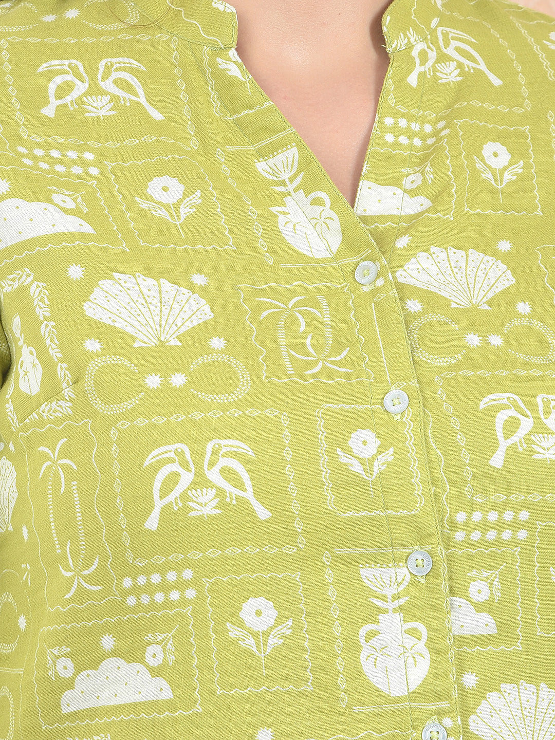 Printed 100% Cotton Olive V-Neck Shirt