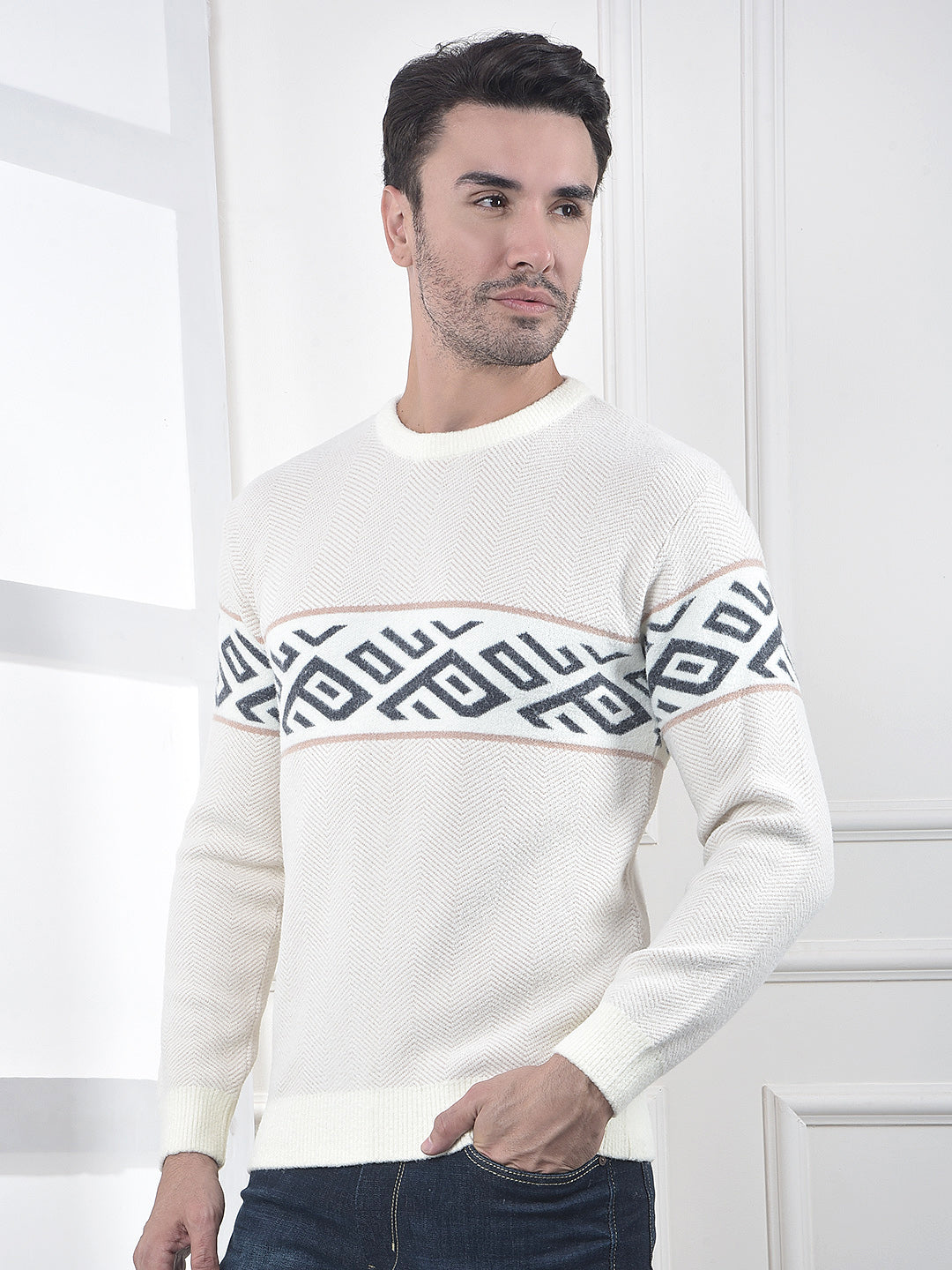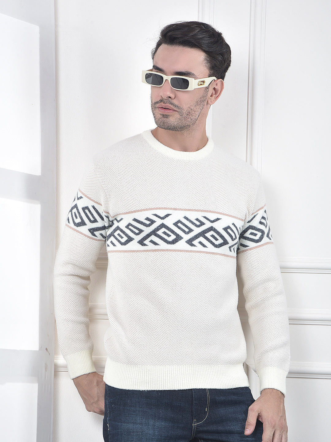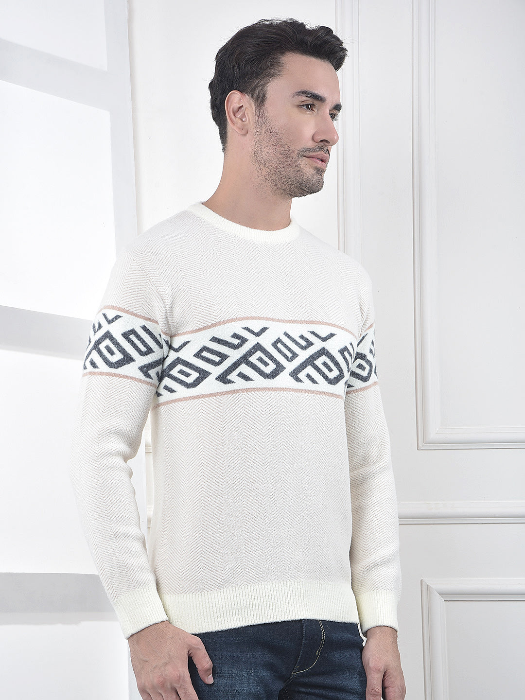 Crimsoune Club Men's slim-fit pullover sweater in cream with a chevron knit texture, featuring a navy, black, and tan geometric pattern band across the chest and sleeves. It has a round neck and ribbed trim.