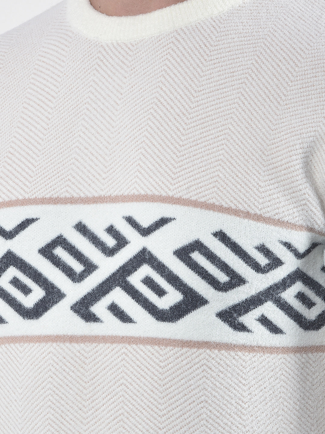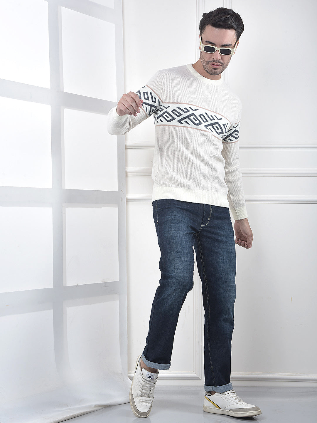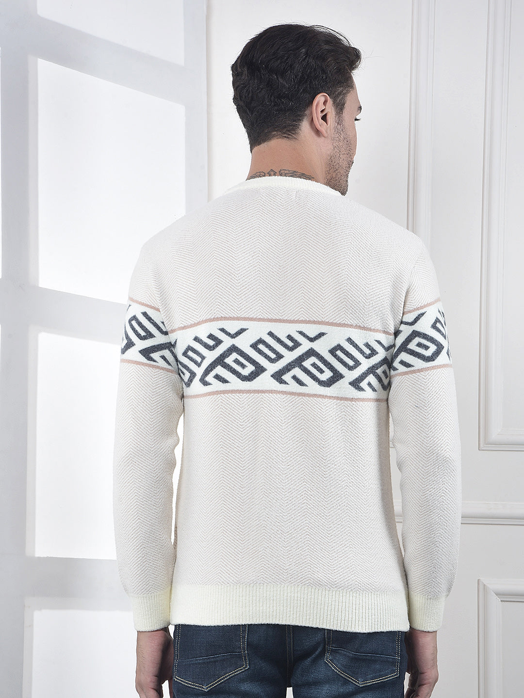 Crimsoune Club Men's slim-fit pullover sweater in cream with a chevron knit texture, featuring a navy, black, and tan geometric pattern band across the chest and sleeves. It has a round neck and ribbed trim.