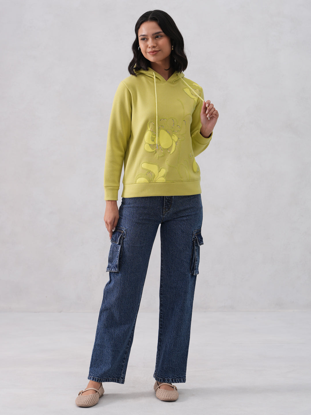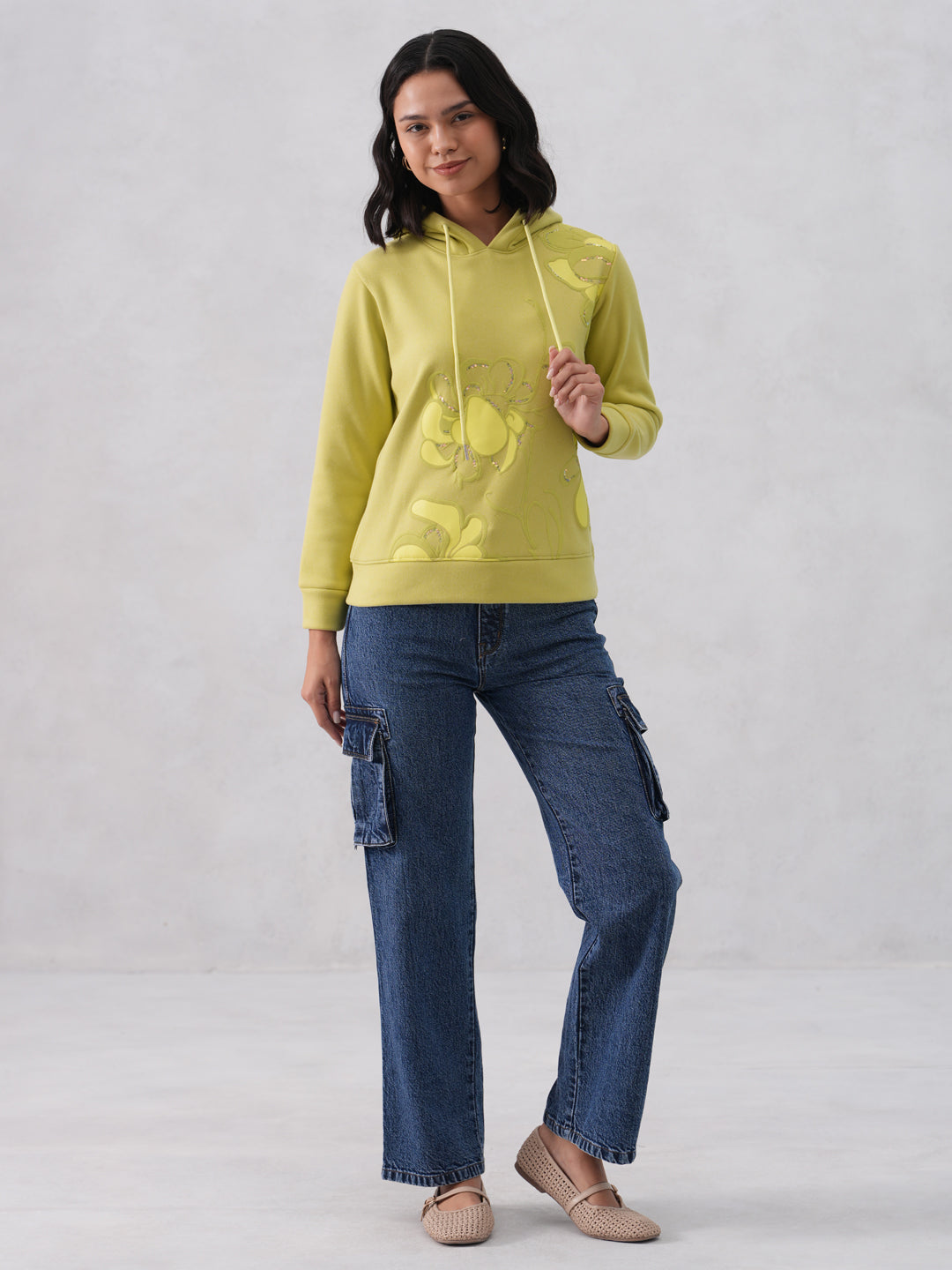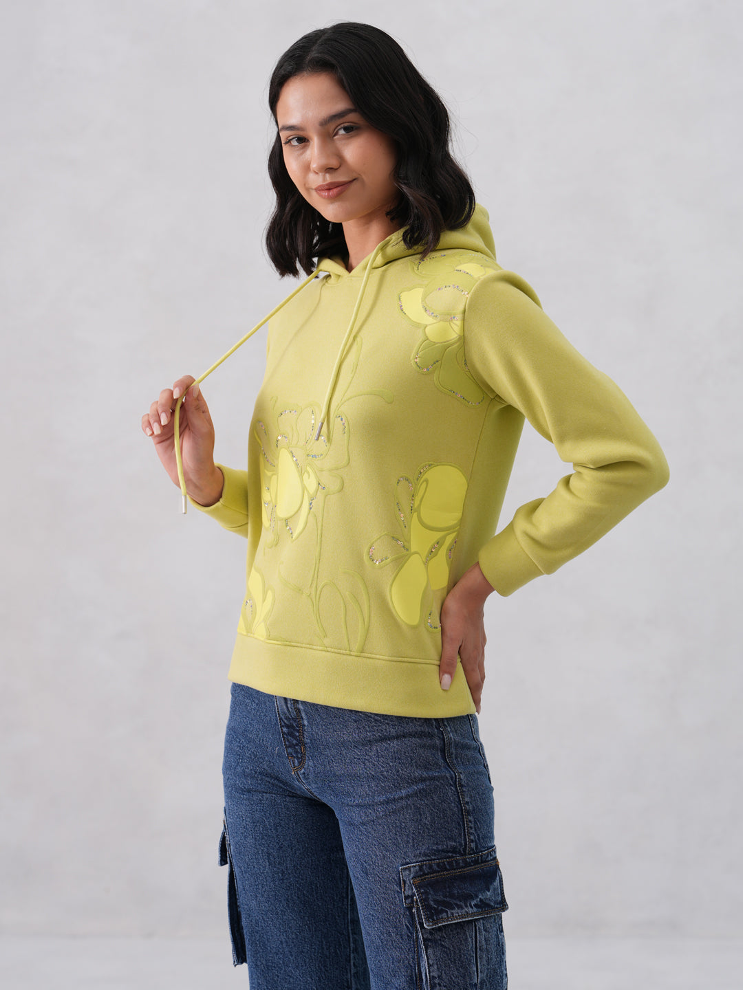 Crimsoune Club Women's Green Embellished Hooded Neck Sweatshirt : Stylish green sweatshirt with hood and intricate embellishments, perfect for casual chic looks.