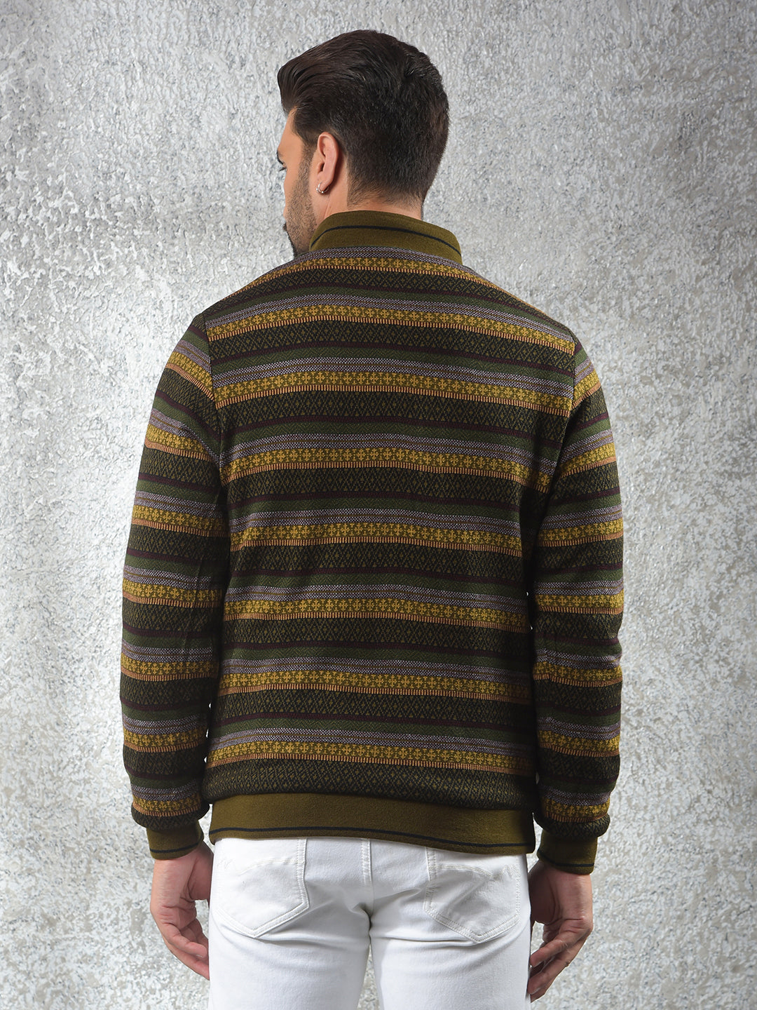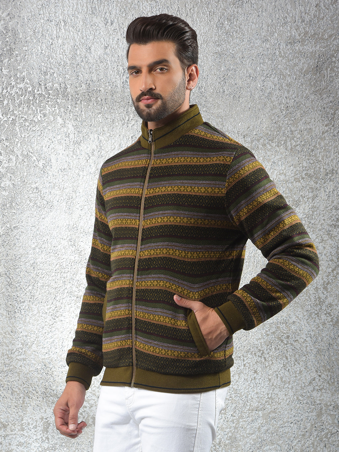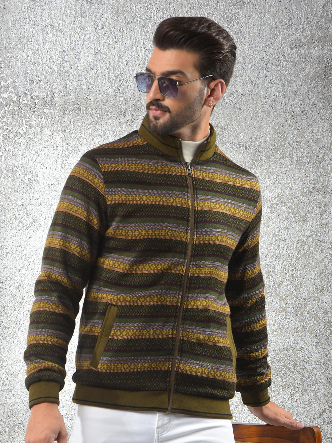 A green jacquard reversible jacket, a stylish and unique piece that offers two looks in one, perfect for adding texture and color to any outfit.