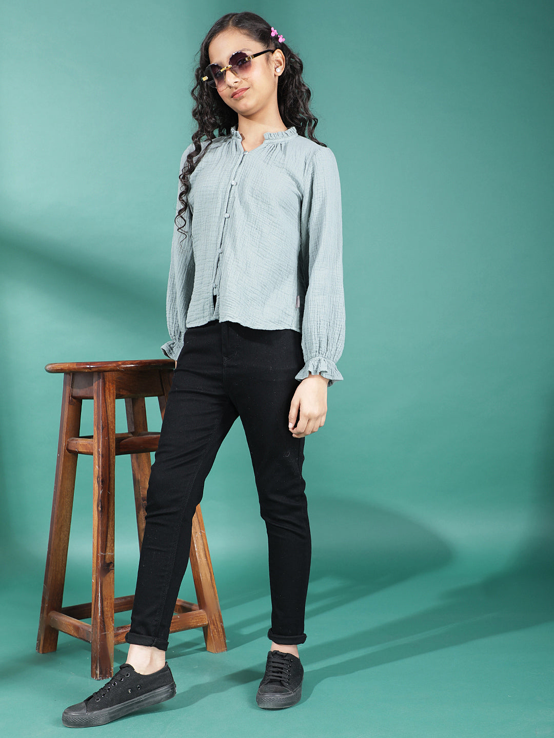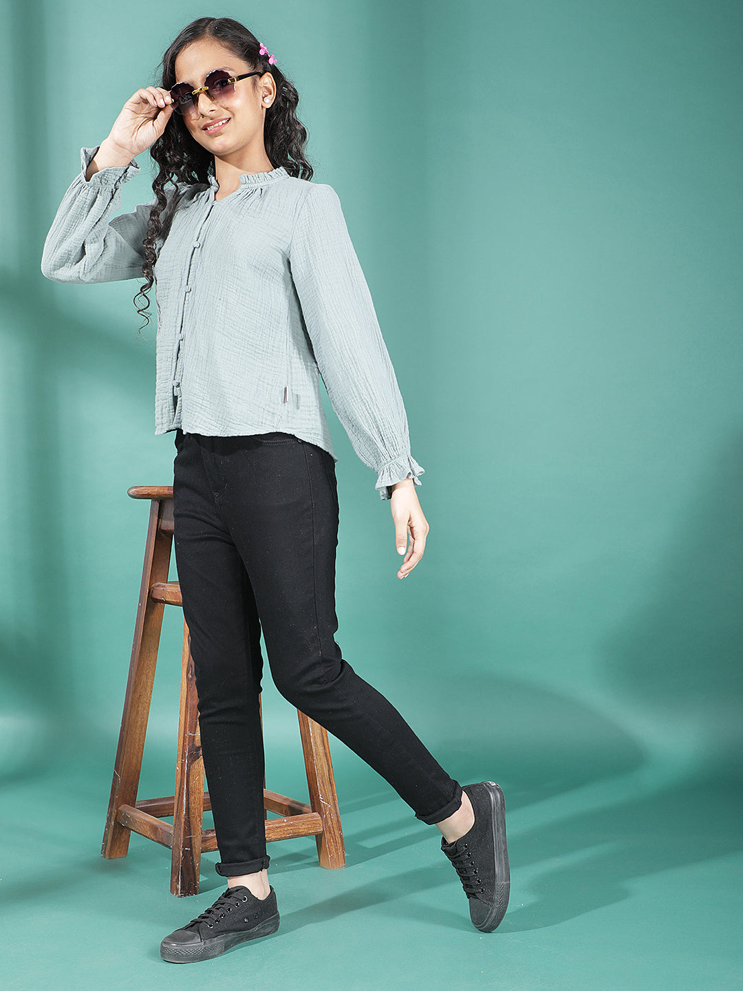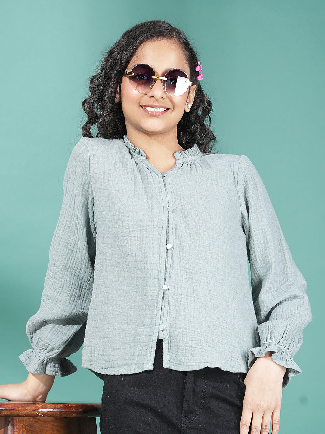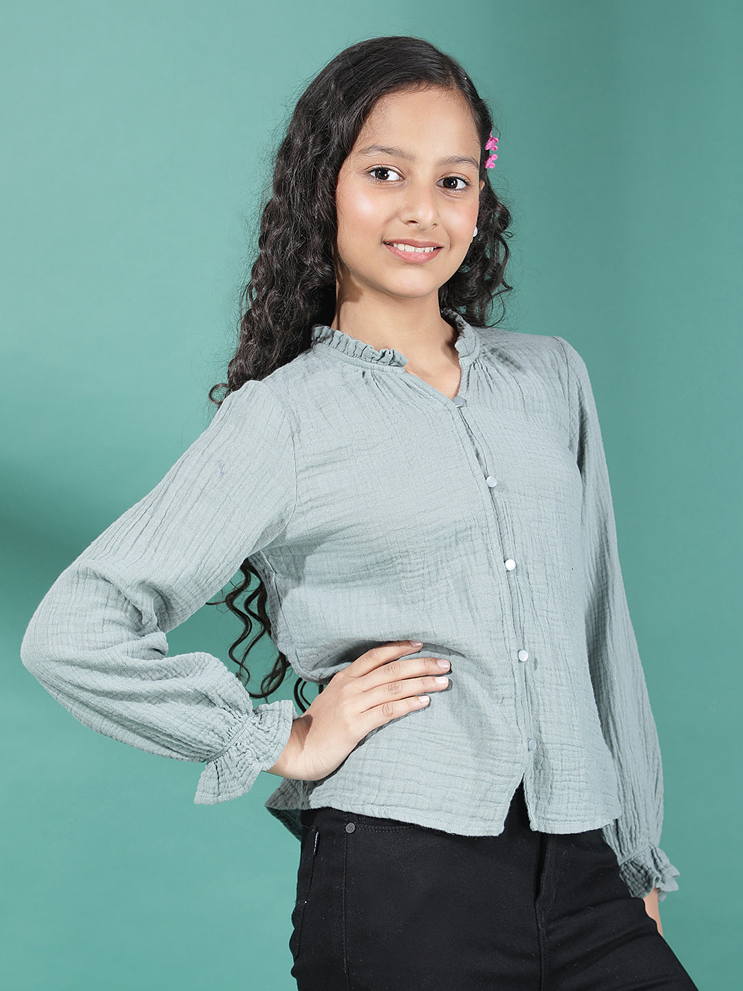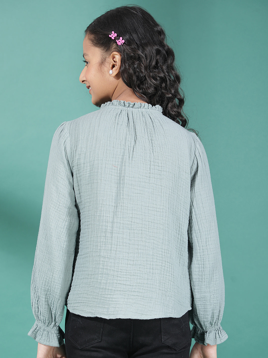 Girl's Green Textured V-Neck Top From Crimsoune Club, Made With Soft-Touch Fabric. Regular Fit With Short Sleeves And Breathable Design. Perfect For School Or Play.