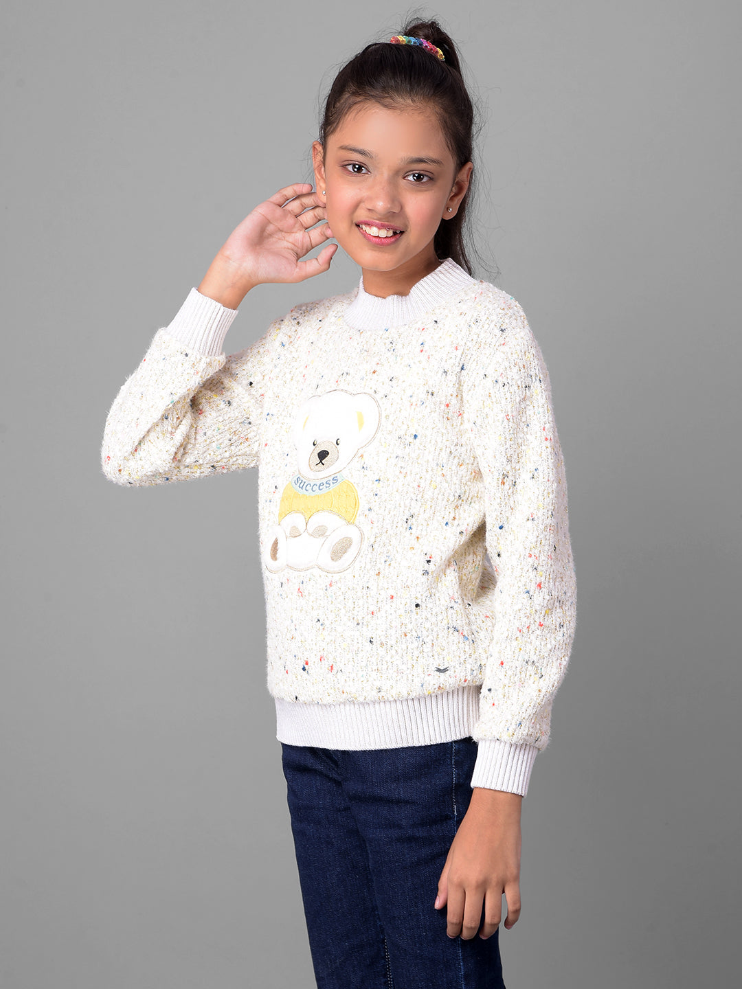 Elevate your casual look with the Crimsoune Club Girls Sweater in brand color Off White and brand pattern Printed It's a stylish and comfortable choice for everyday wear.
