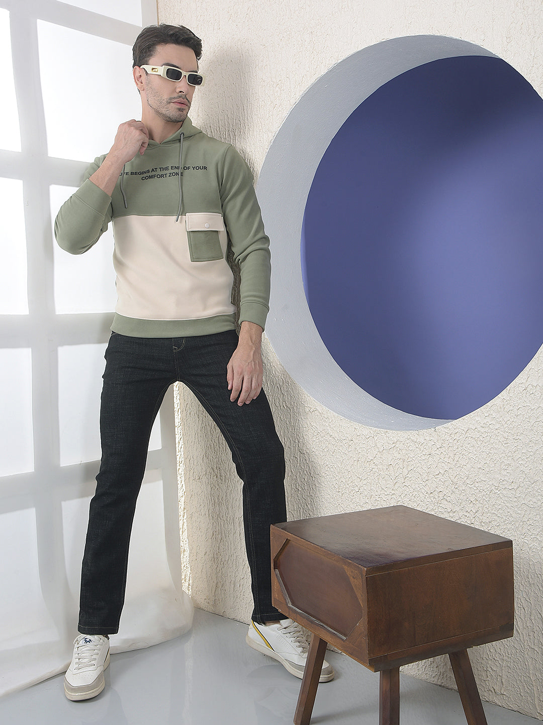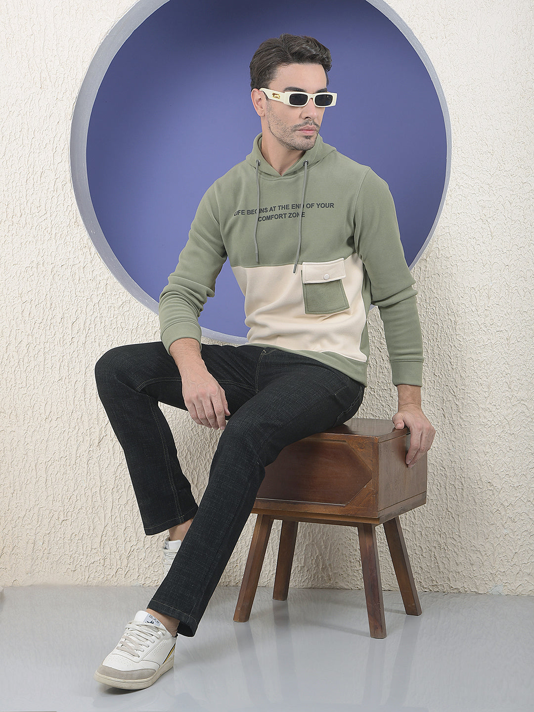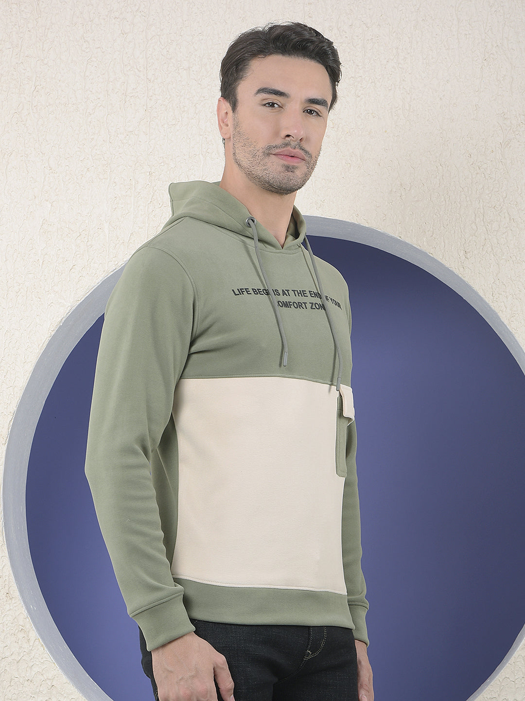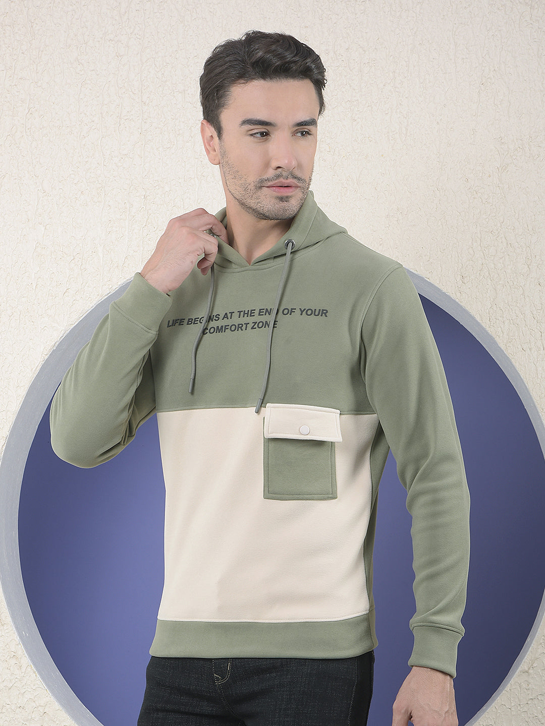 Crimsoune Club Men's slim-fit colourblocked hoodie in olive and cream. Features a drawstring hood, a printed slogan, and a utilitarian patch pocket on the front.