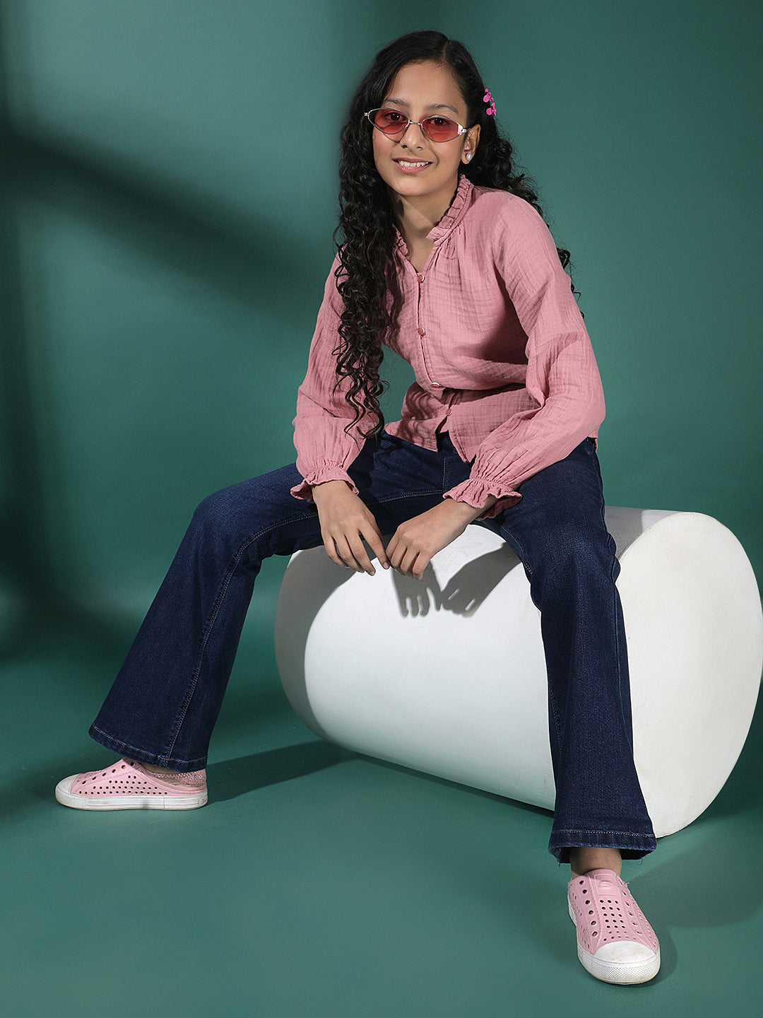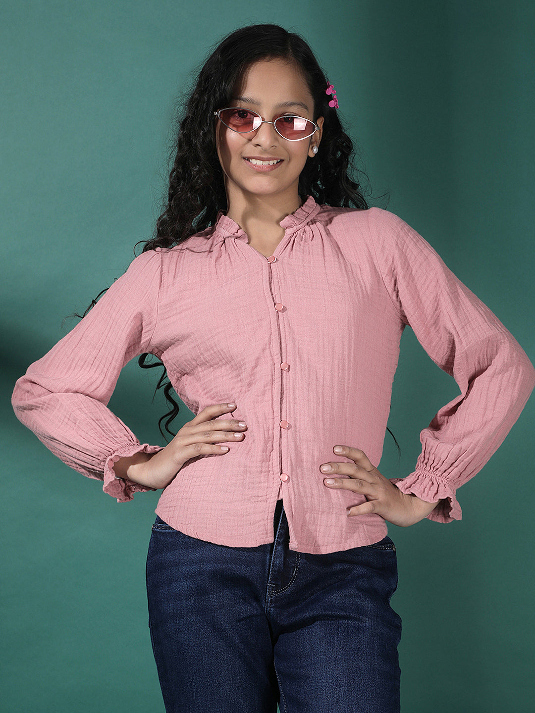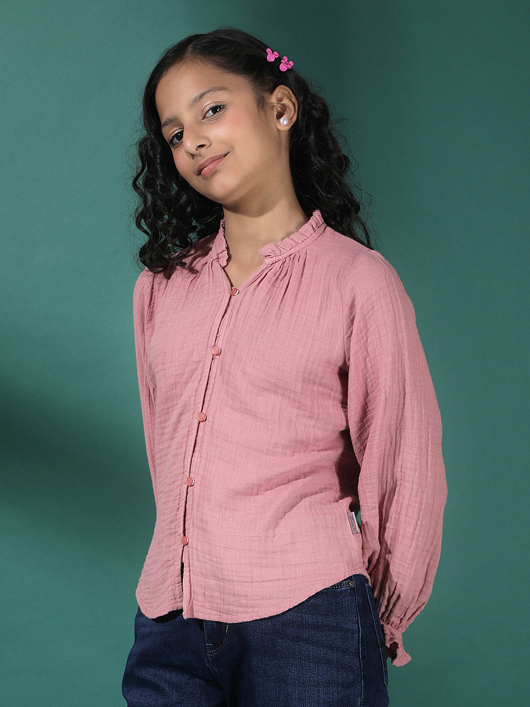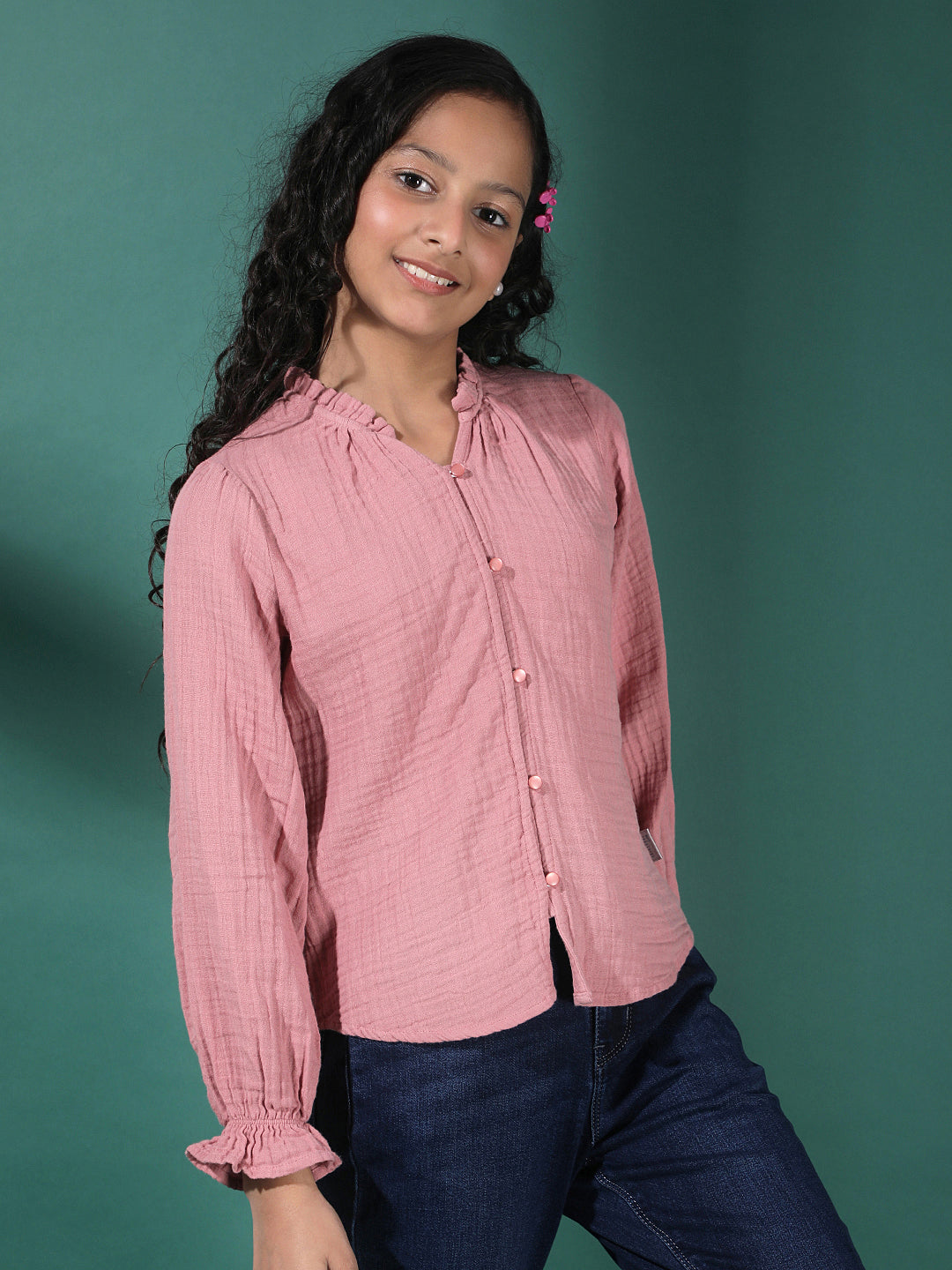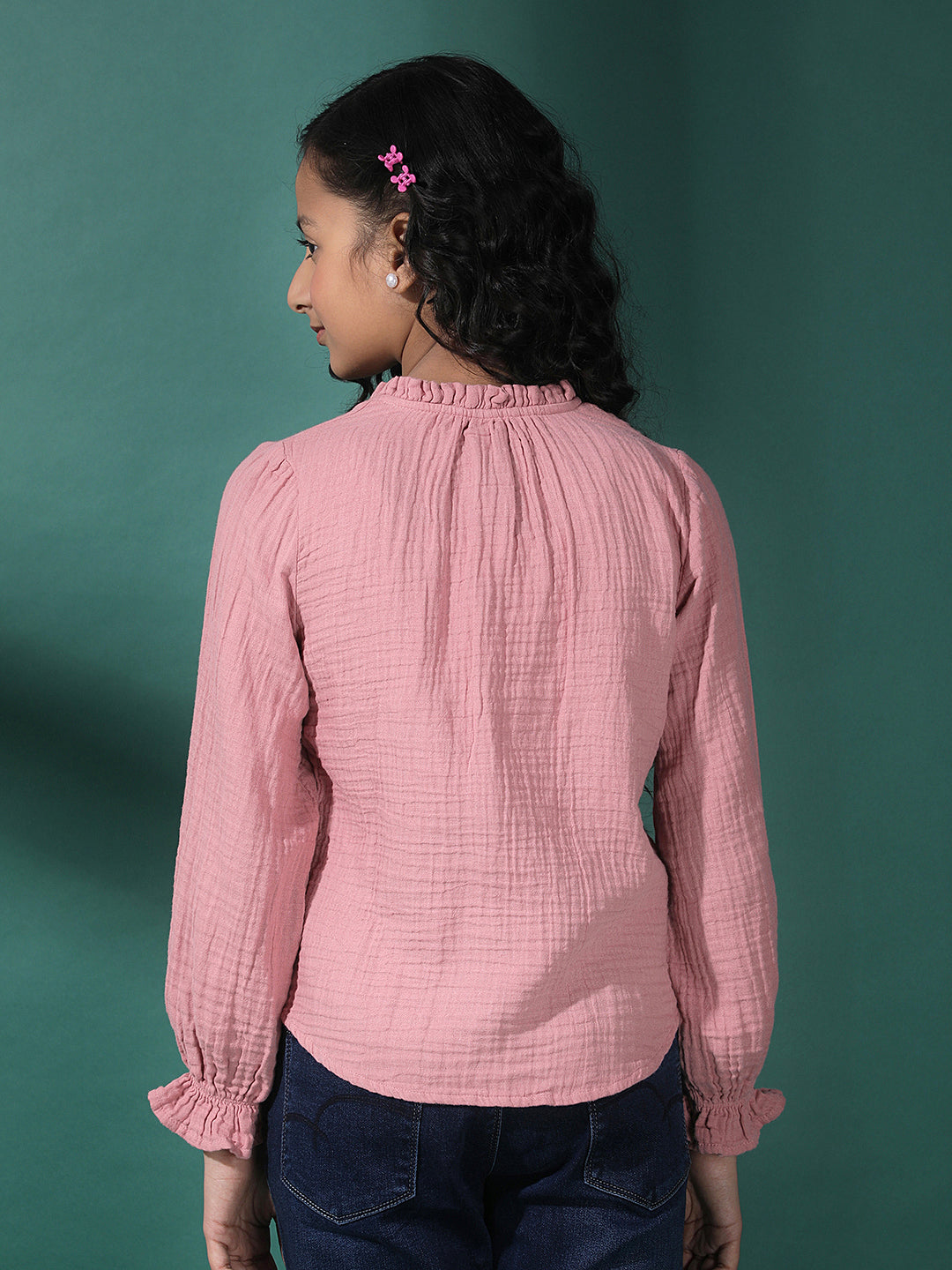 Girl's Pink Textured V-Neck Top By Crimsoune Club, Crafted In Cotton Blend Fabric. Features A Straight Hemline And Short Sleeves. Stylish Pick For Casual Comfort.