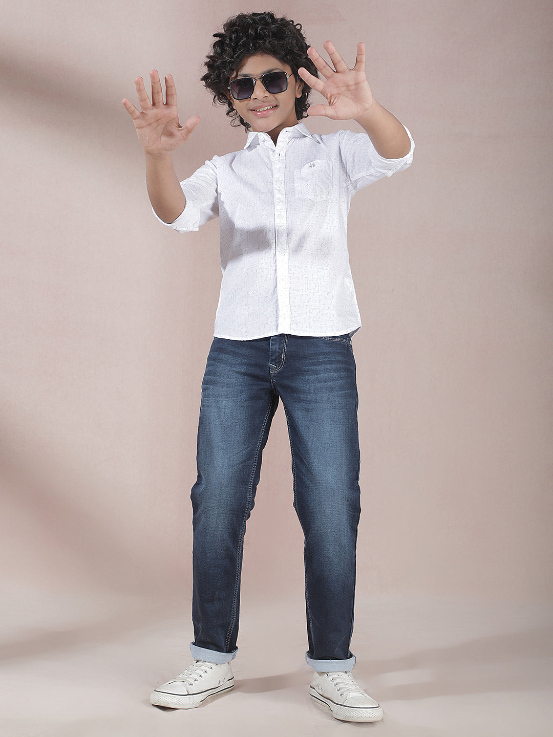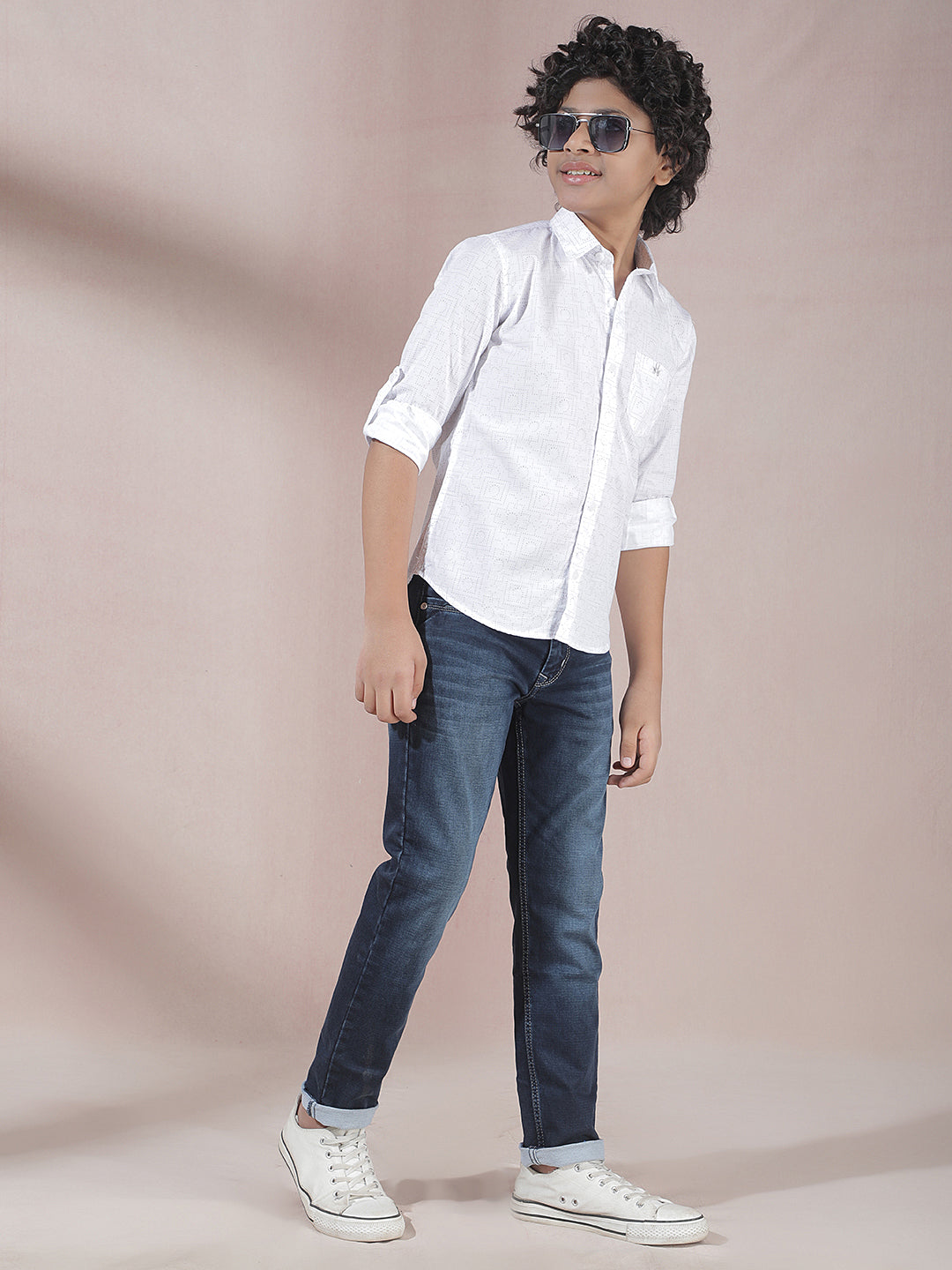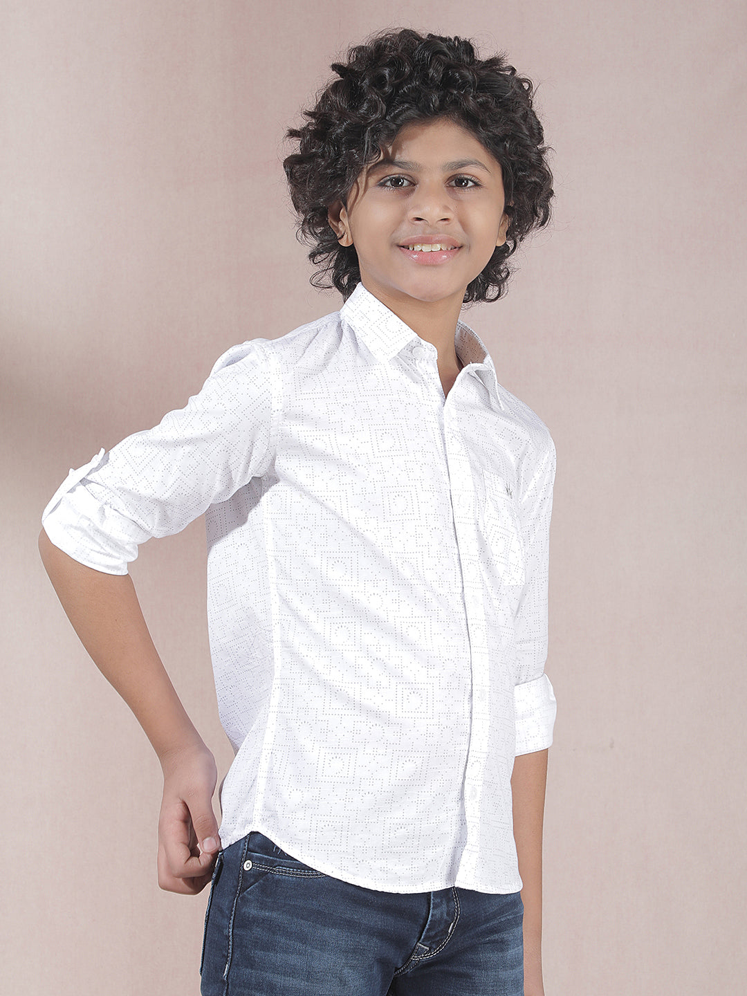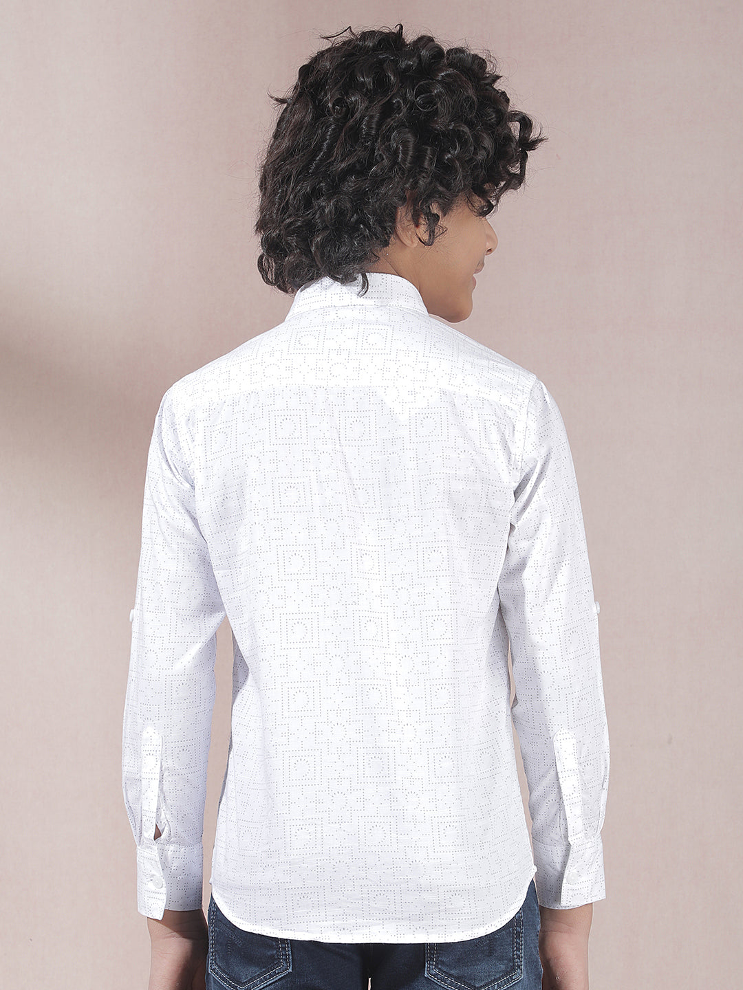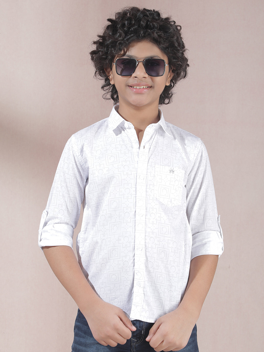 Crimsoune Club Boy's White Printed Shirt : Crisp white shirt with subtle prints, blending simplicity and style effortlessly.
